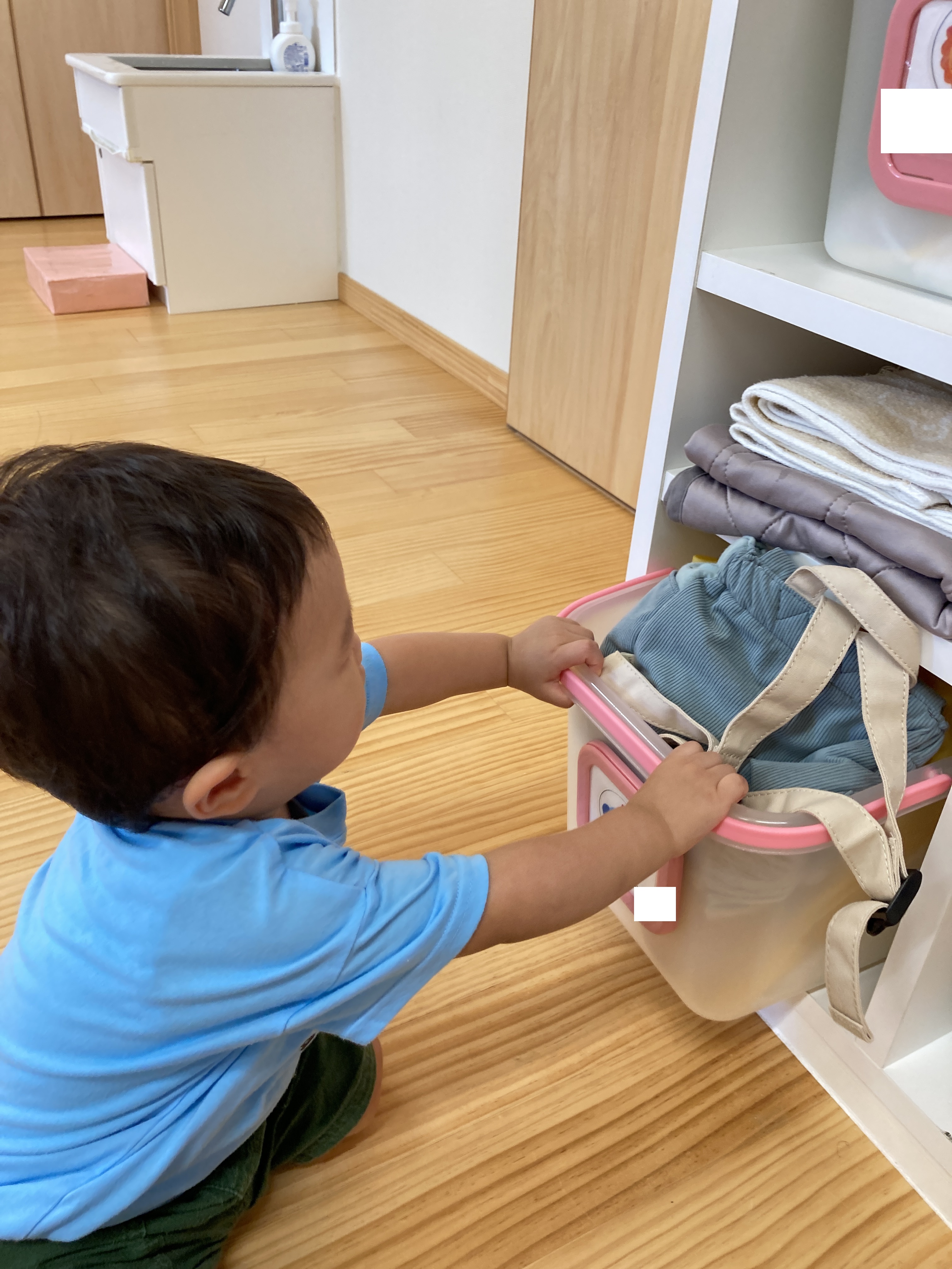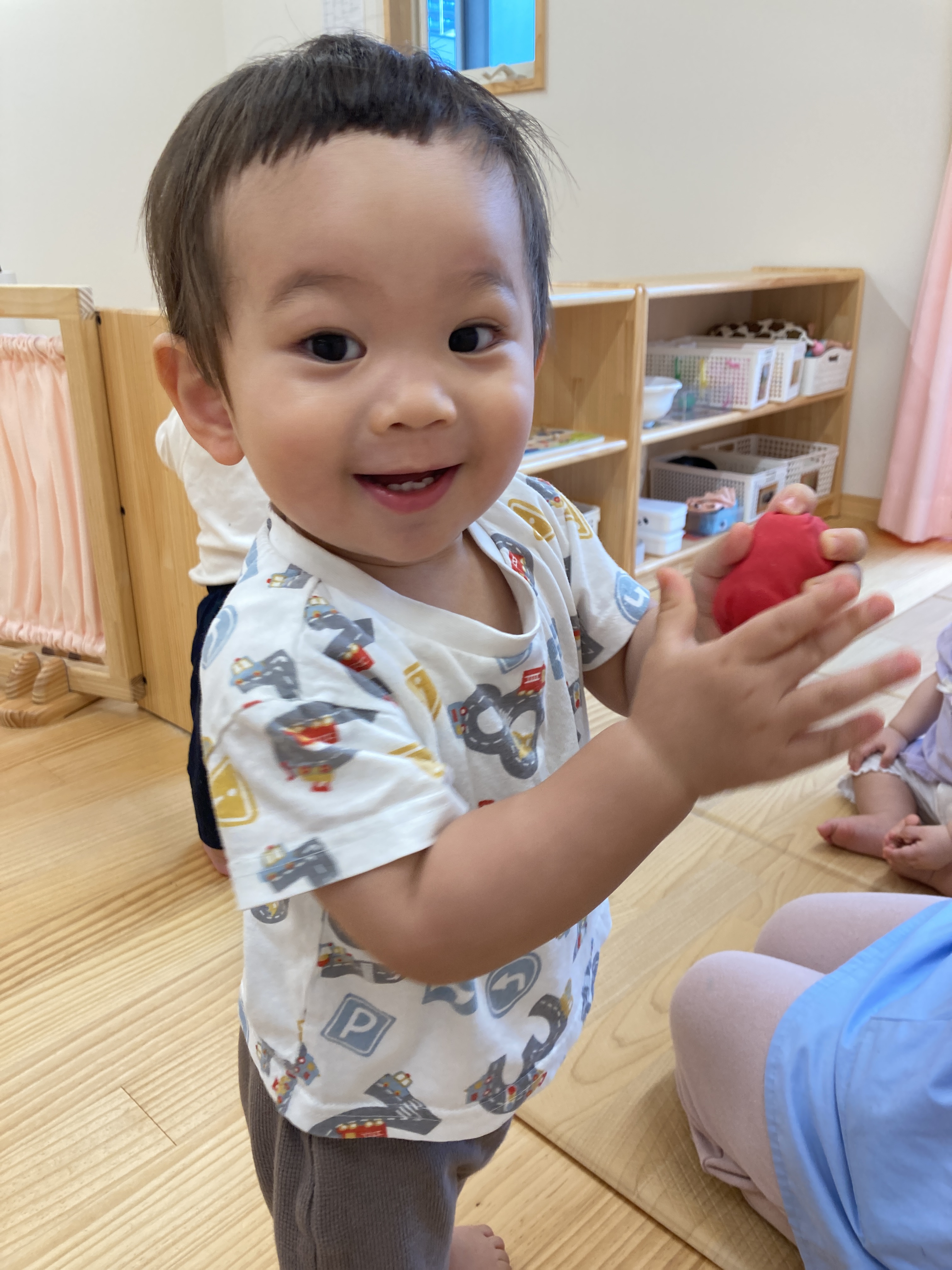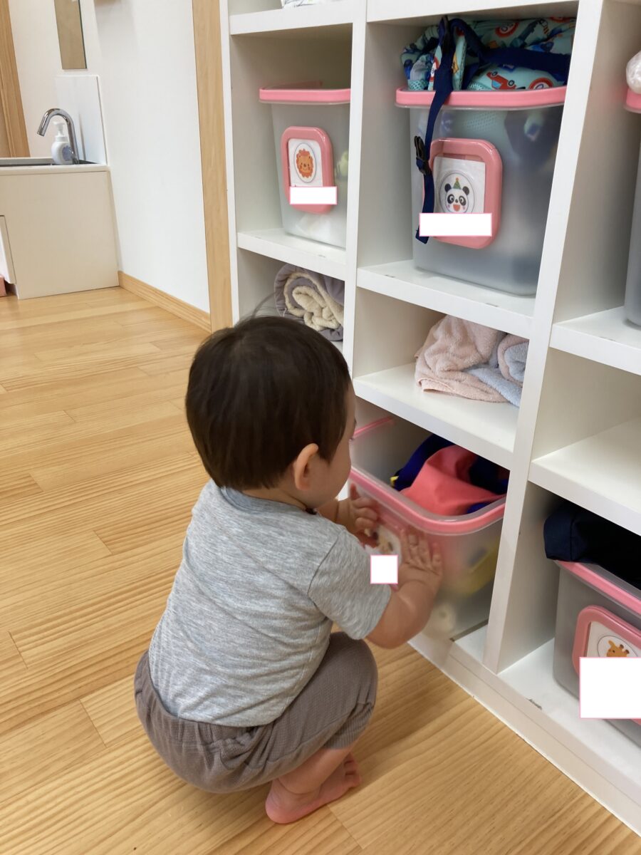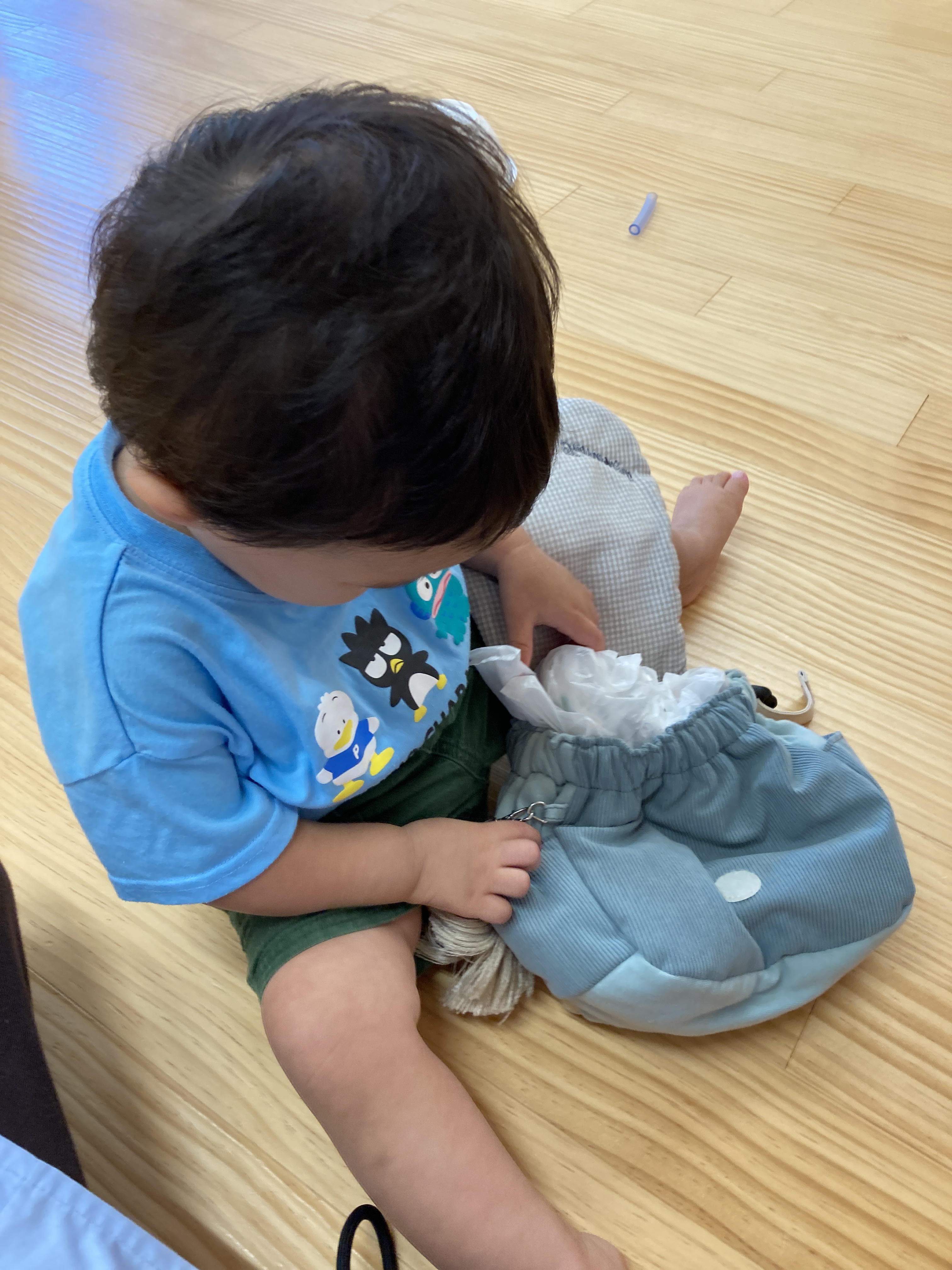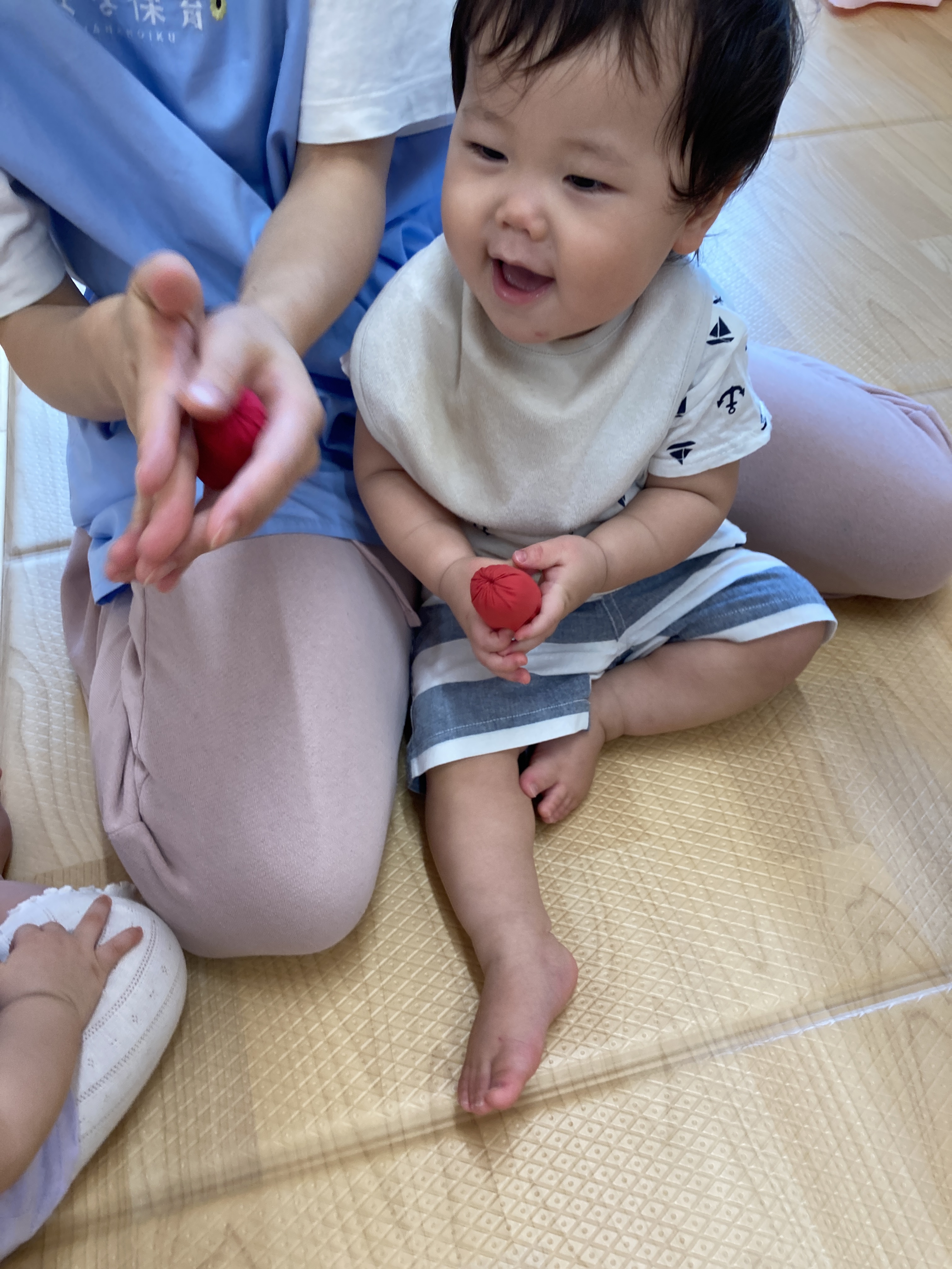 どちらの手におもちゃが入っているか当てる遊びです✋