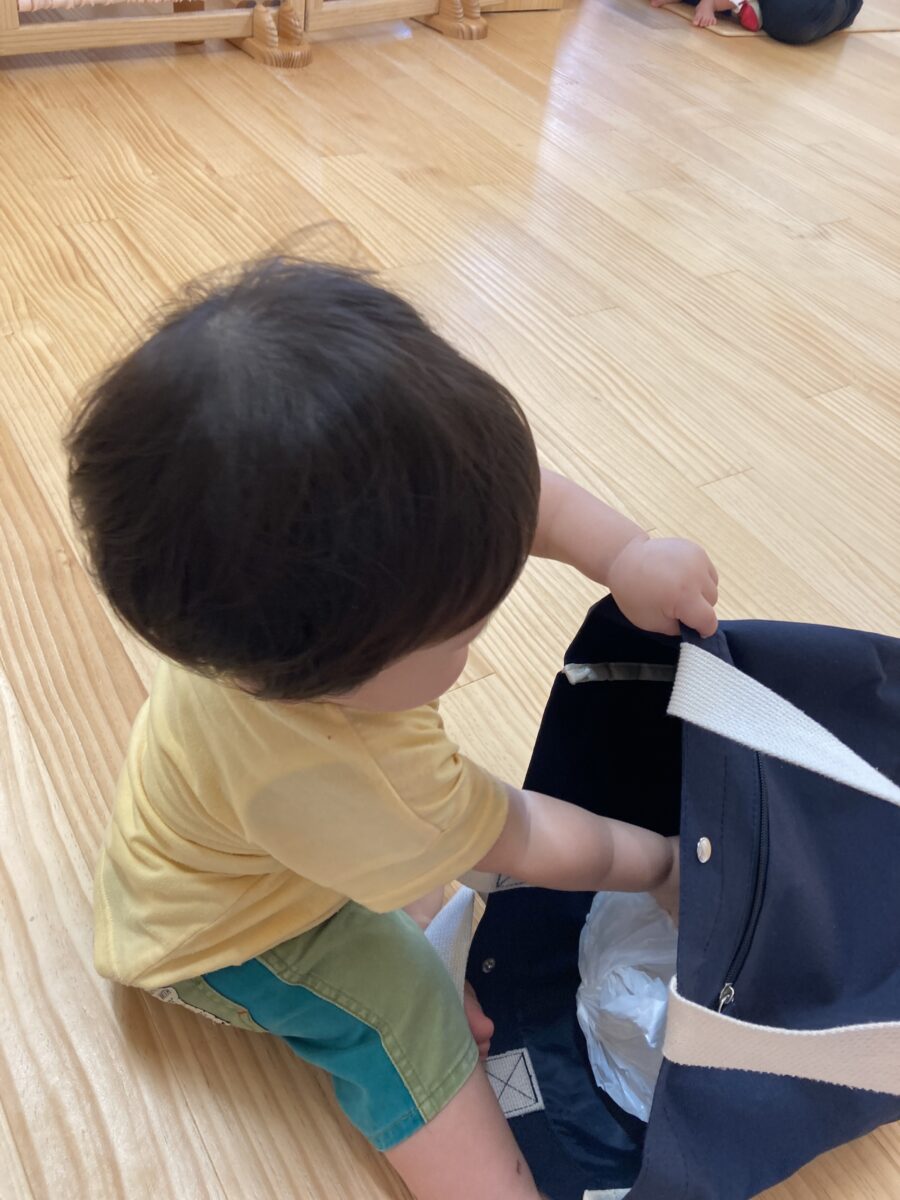 給食で使ったエプロンをビニール袋にしまい、かばんの中にないない🌟🌟