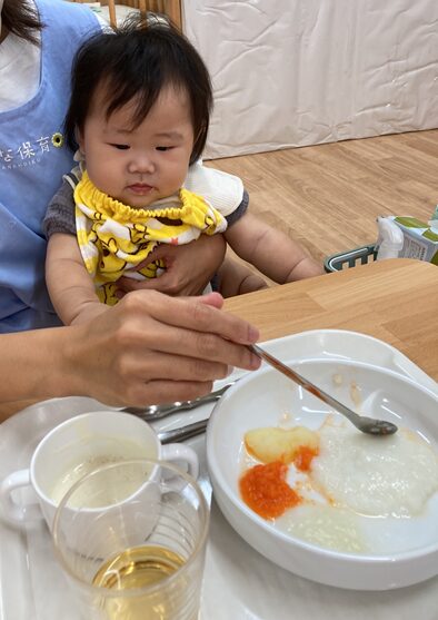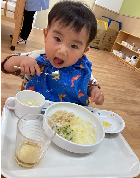 保育士がスプーン🥄にごはんをのせてお口の前に運ぶと、「あーん」と大きなお口を開けて、上手に食べてくれました🍴