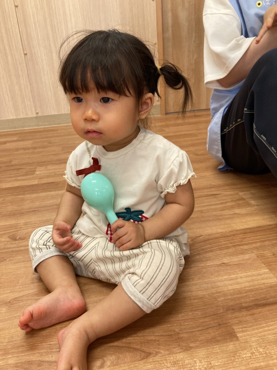 自分の手よりも大きなマラカスを大事そうに抱えてピアノの音に合わせてフリフリ