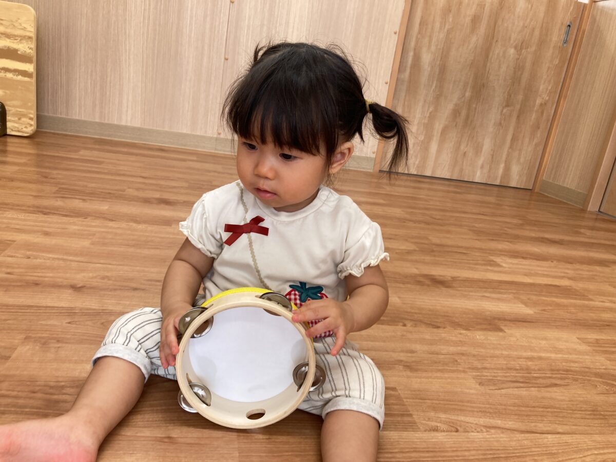 タンバリンを一生懸命にたたいて音を鳴らしてみたり、手首を器用に動かして音を鳴らしていました