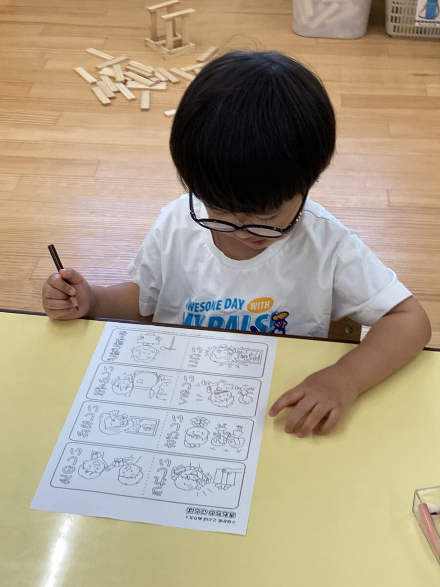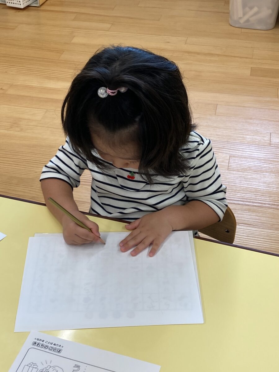 「う、れ、し、い」「た、の、し、い」ぬりえをしながらお友だちに教えてもらったり自分で読んだり...