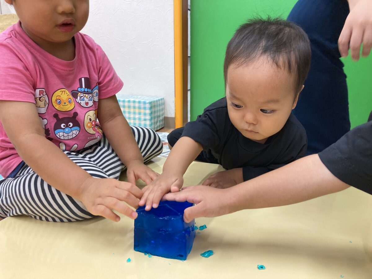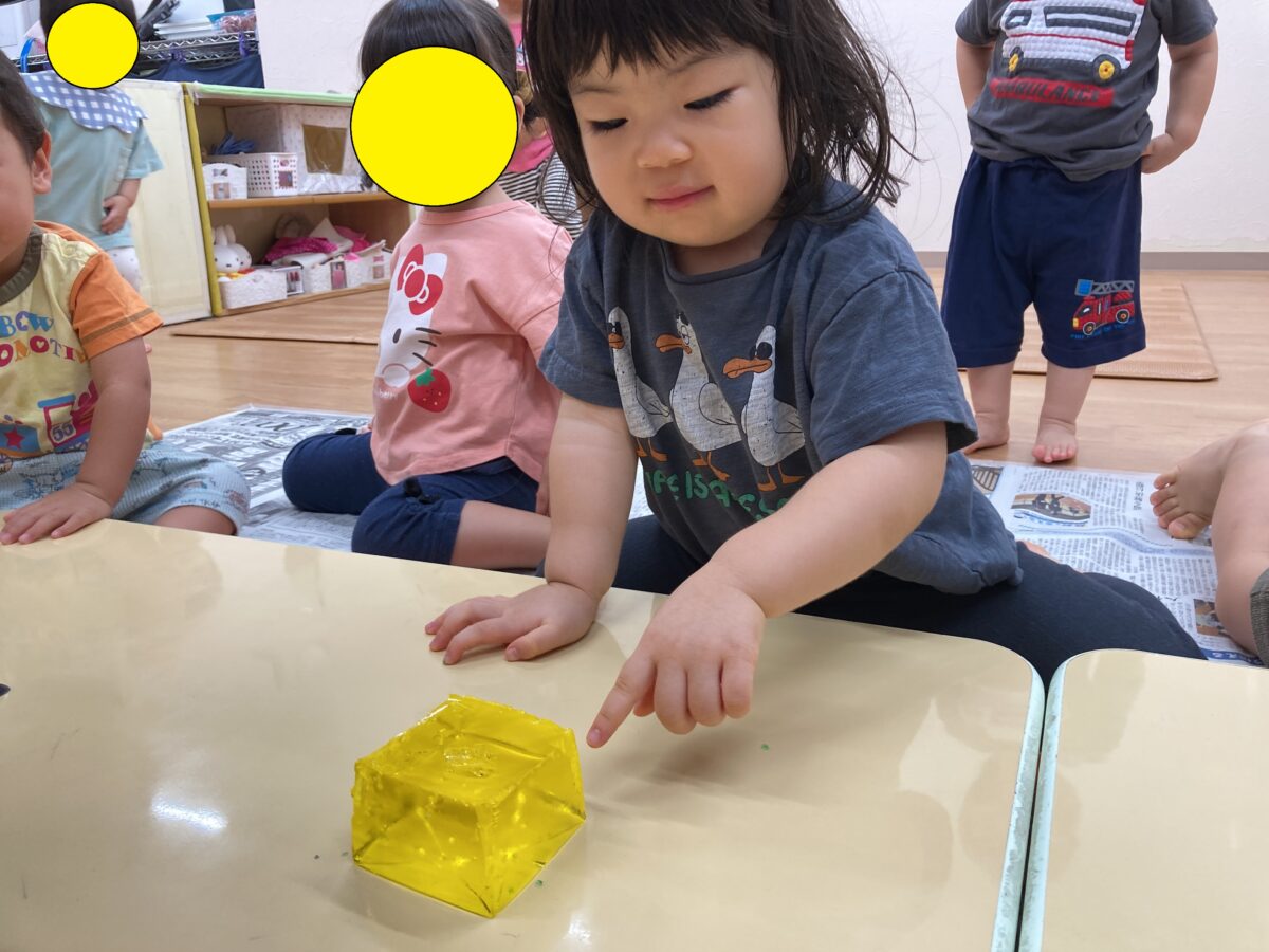 つんつんとつついたり、ギューッと握ってつぶしたりと寒天の感覚を楽しむ子どもたち。
