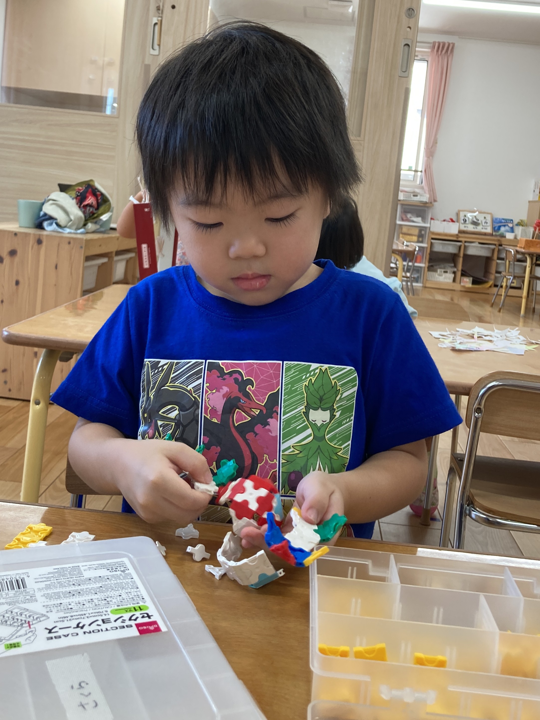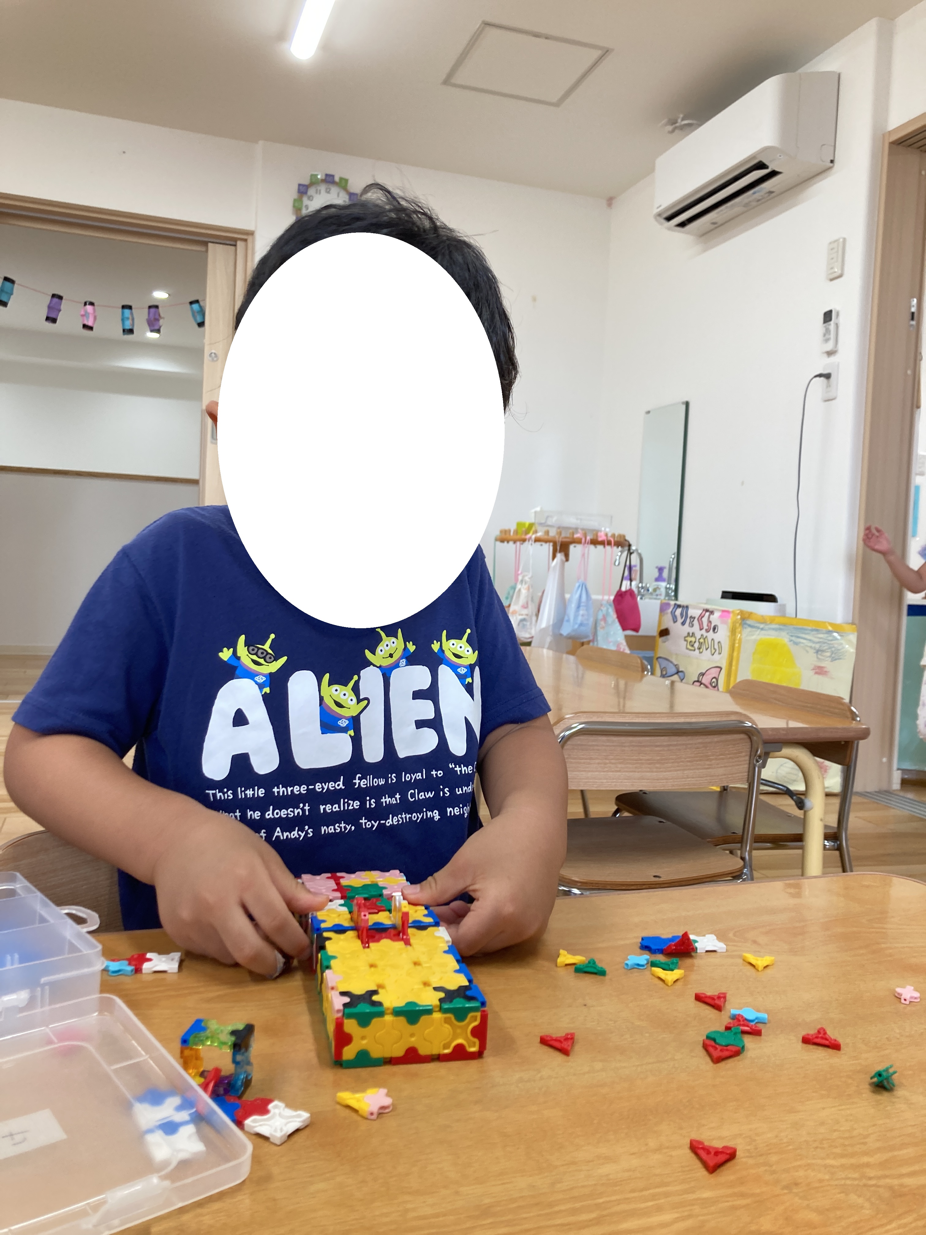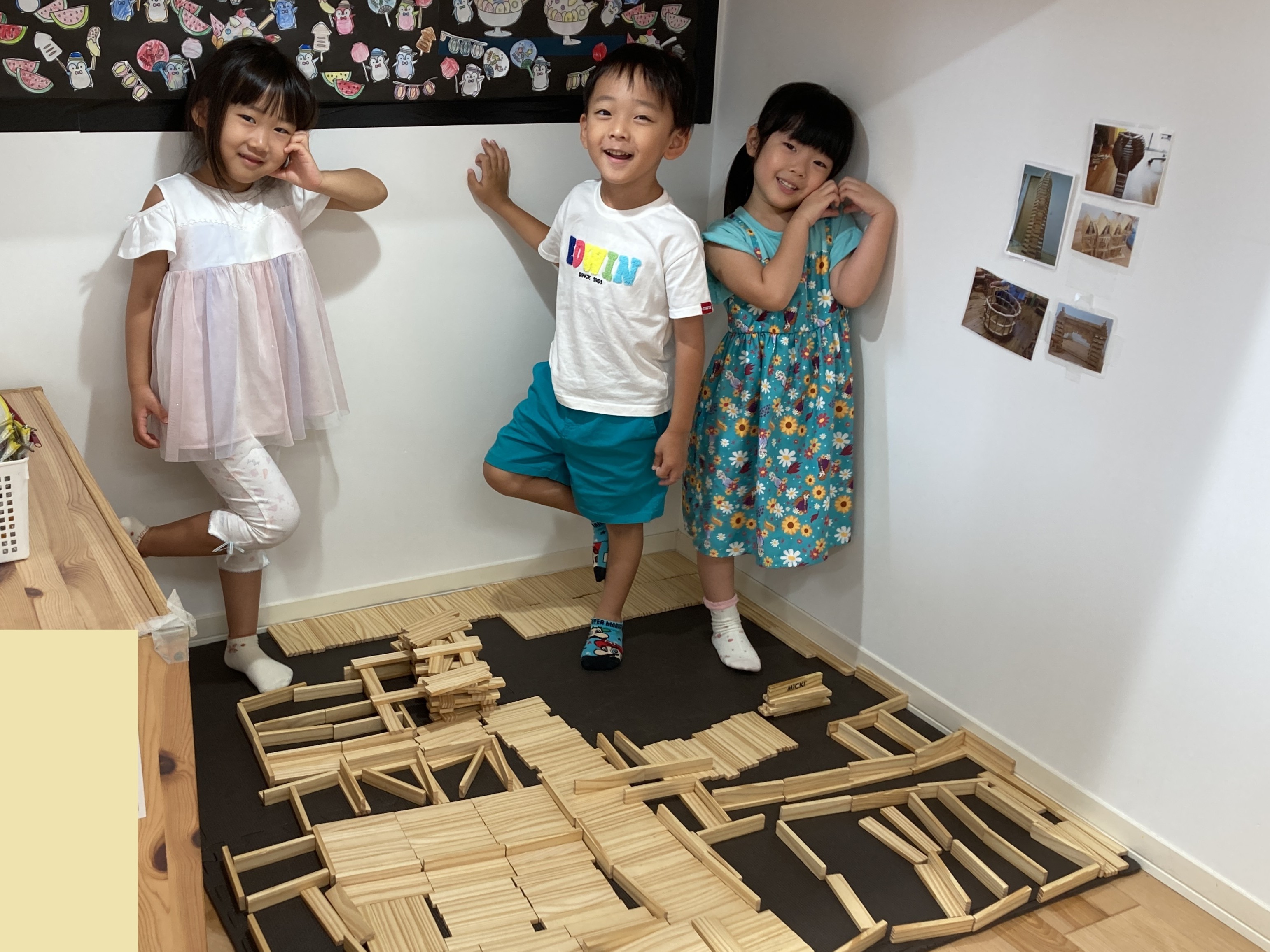 お友だちと協力しながら作っていくことを楽しみ、「○○くんのお家大きくていいな~」「○○ちゃん、ここにカプラ置いてほしい!」とお話しながら作っています