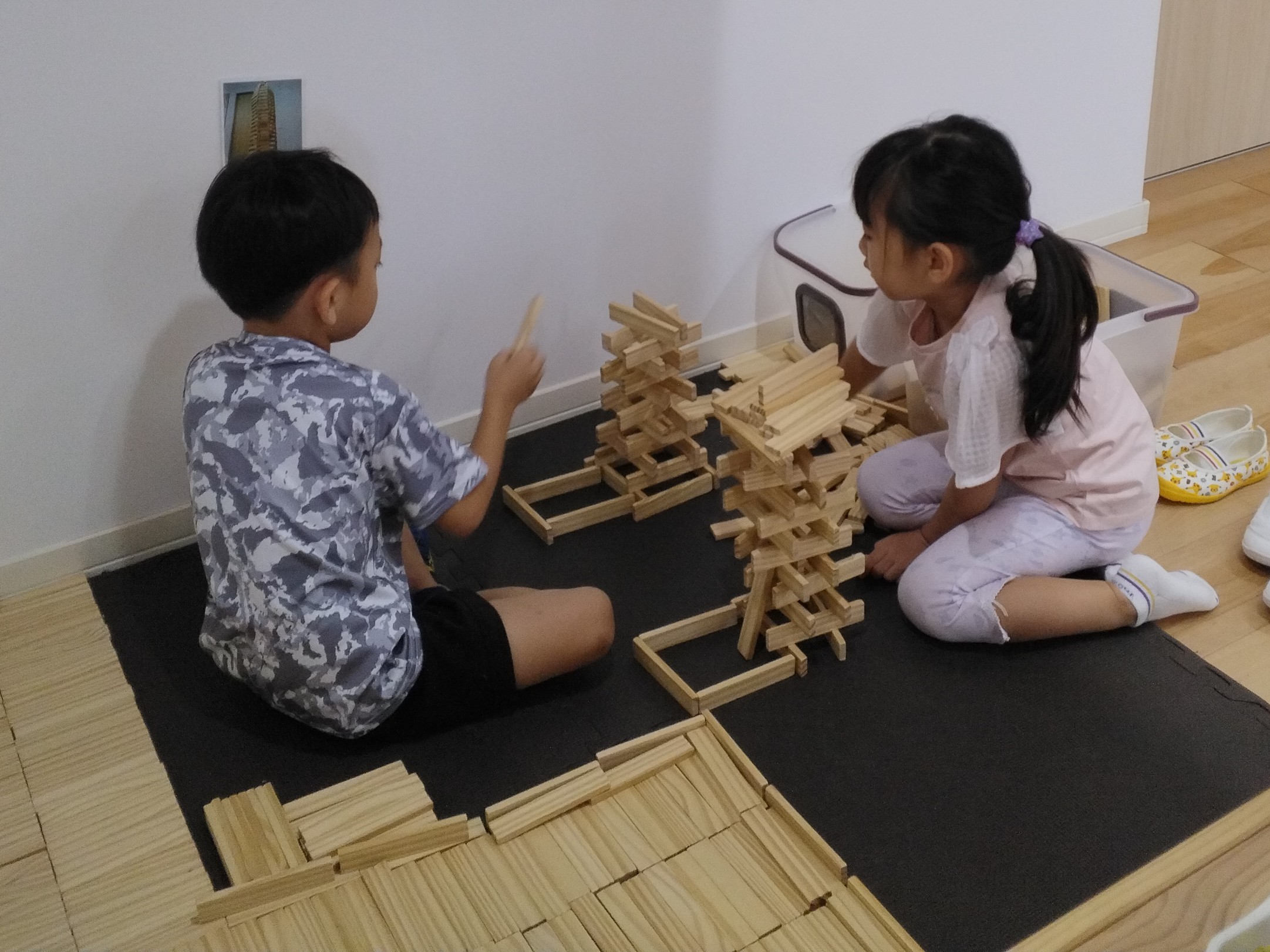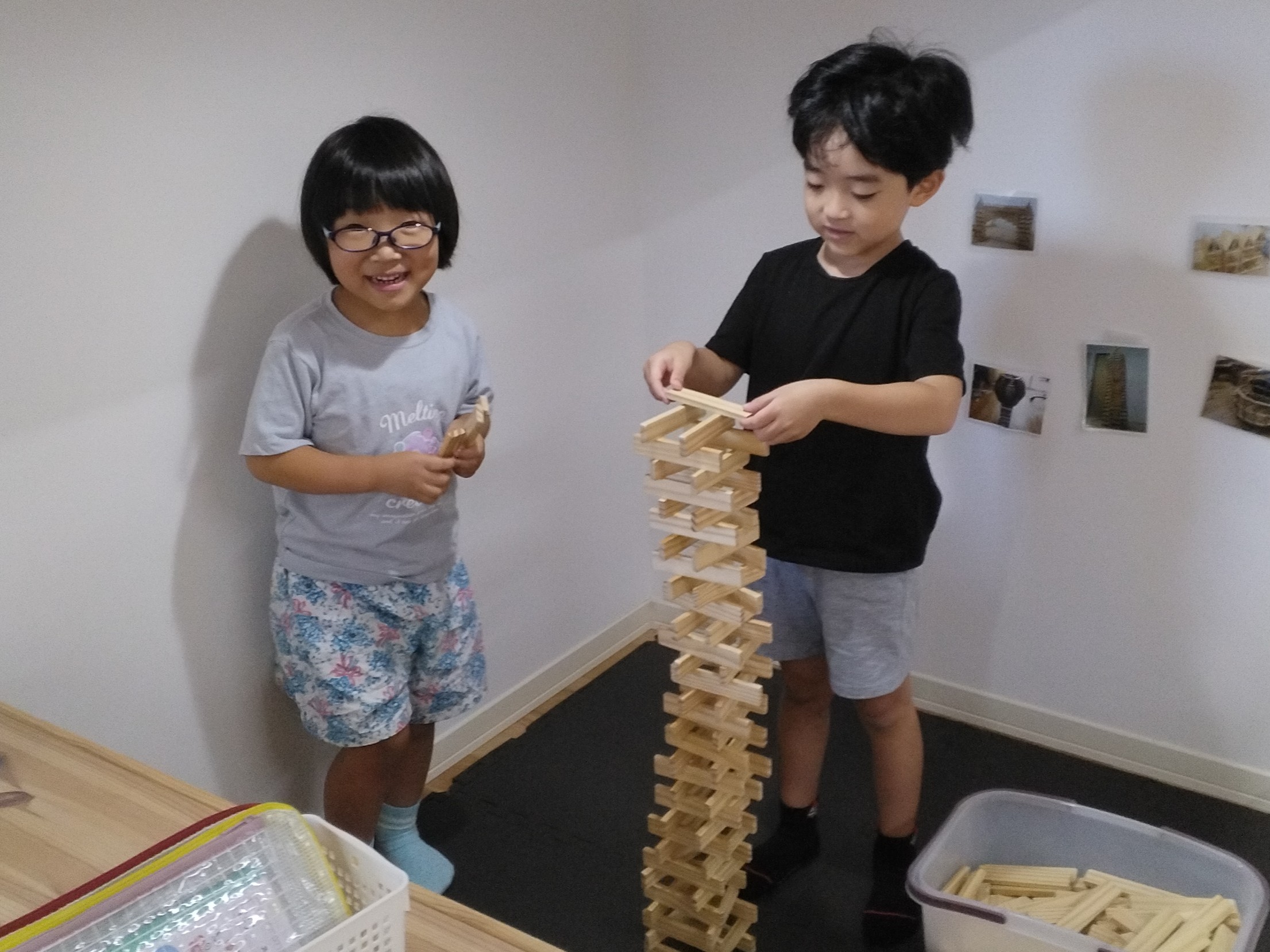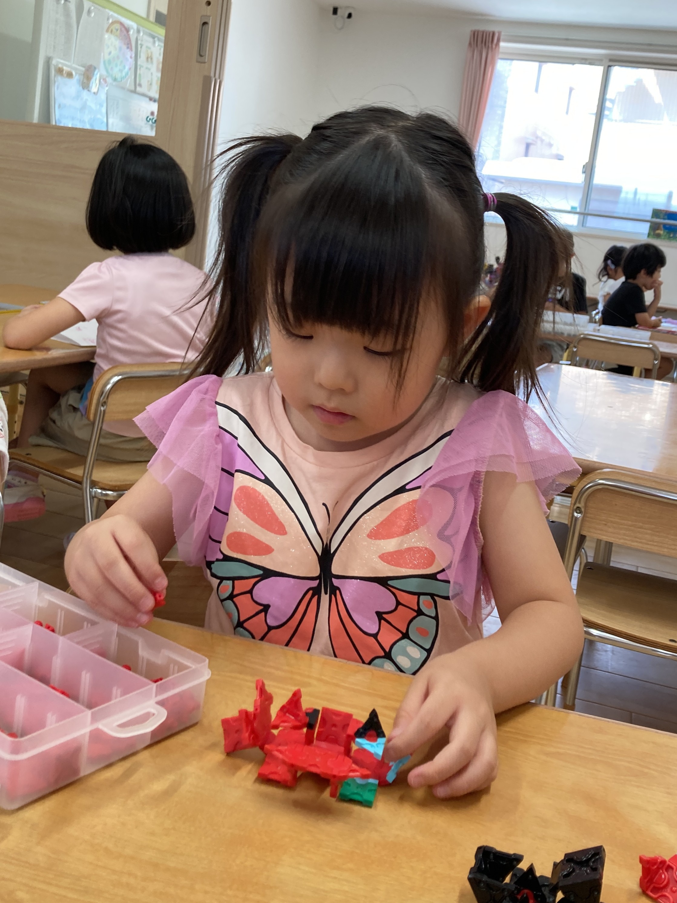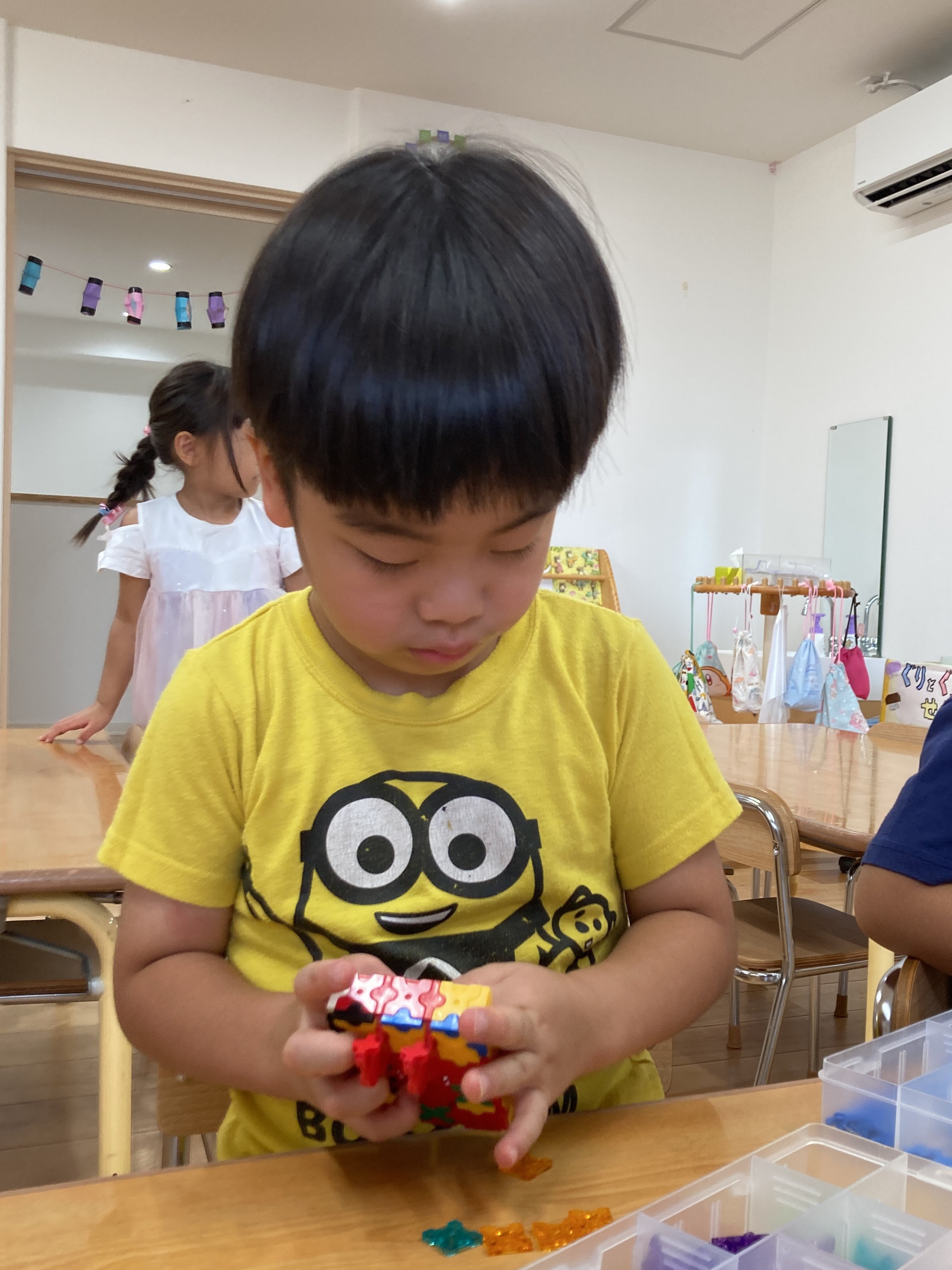 お友だちと協力しながら作っていくことを楽しみ、「○○くんのお家大きくていいな~」「○○ちゃん、ここにカプラ置いてほしい!」とお話しながら作っています