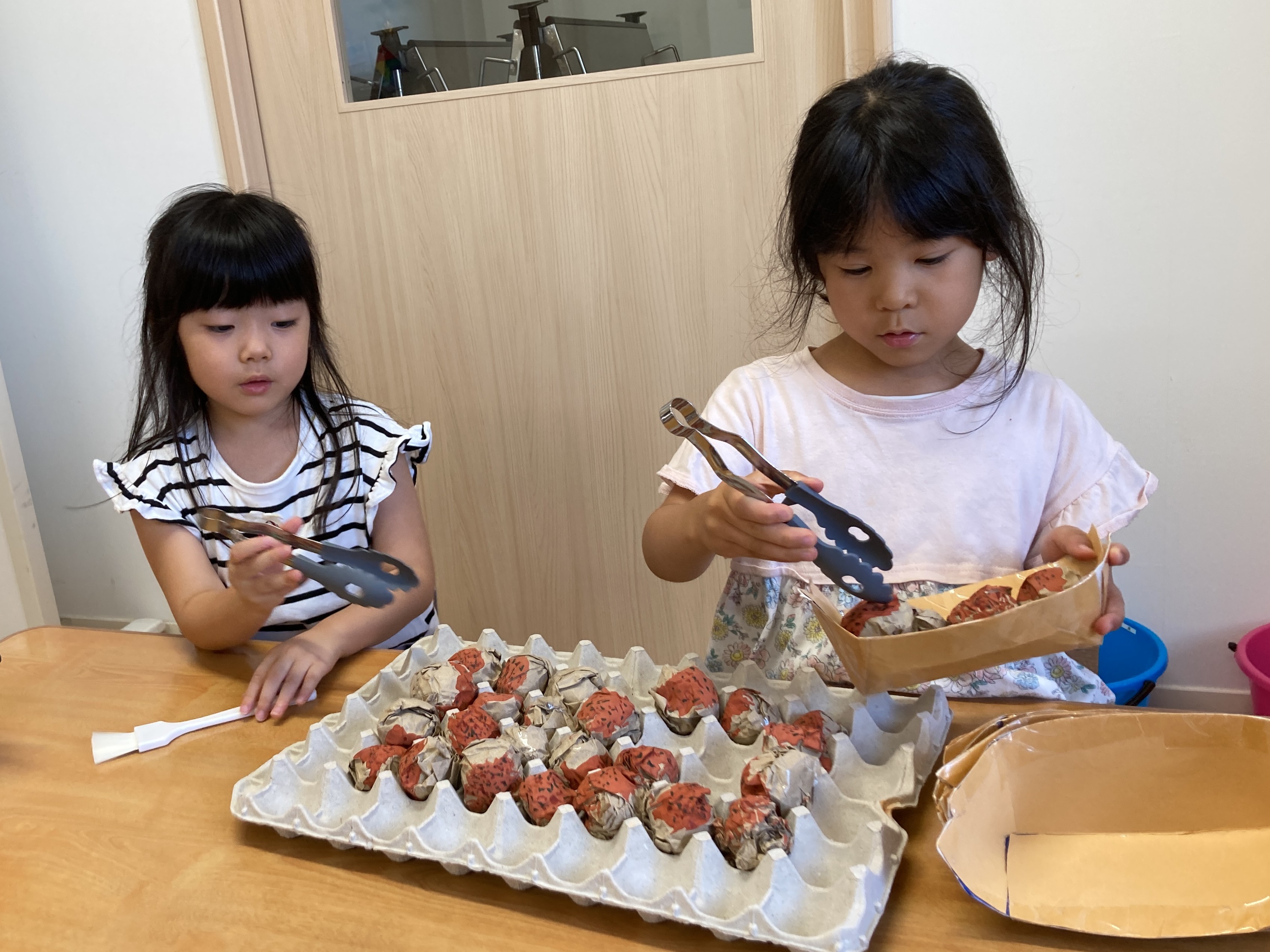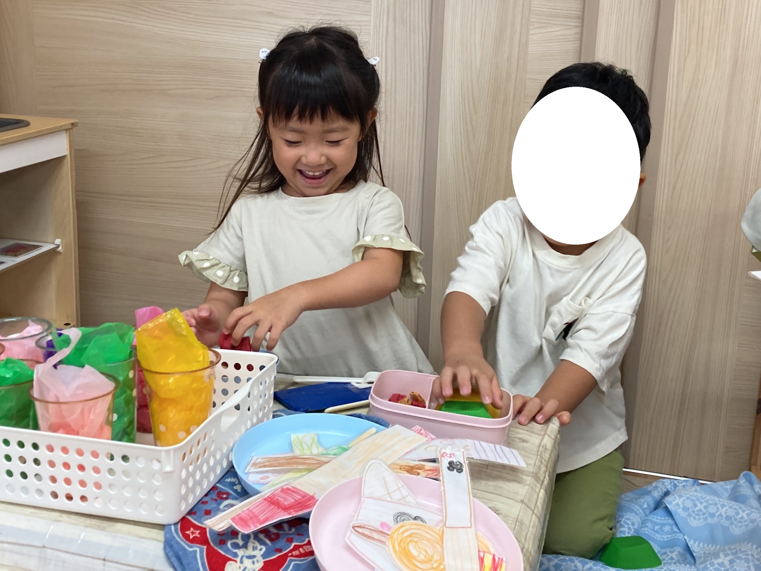 ままごとでは、夏祭りに使ったアイスクリームやジュース、たこ焼きを使って遊びに取り入れて遊んでいます