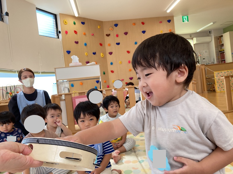 次にお名前が呼ばれたら「はーい!」と元気いっぱいのお返事して、タンバリンをタンっ!🎵