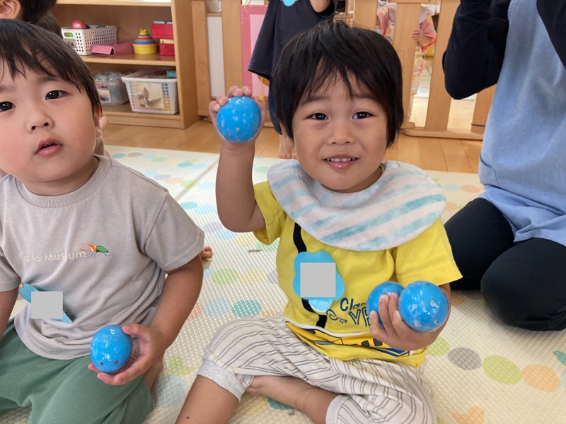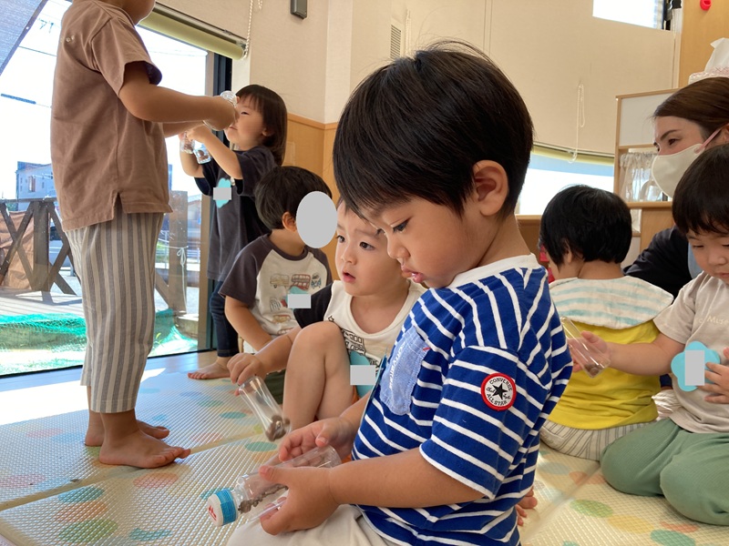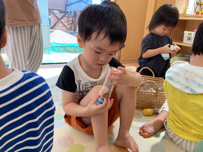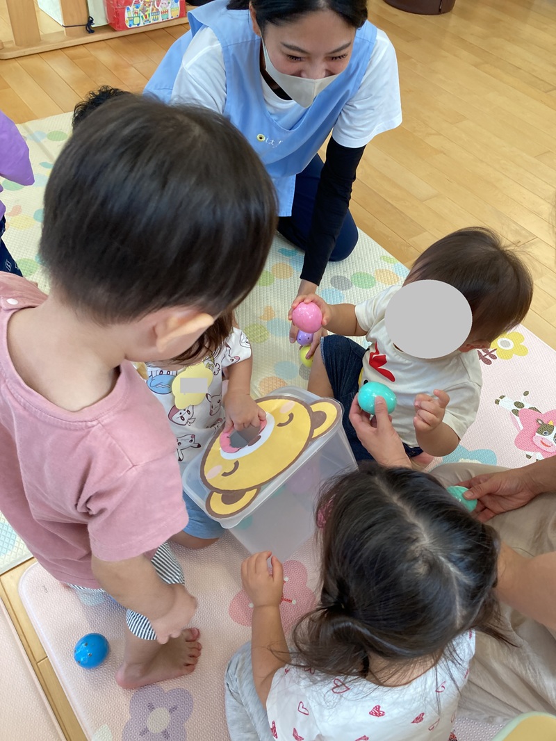 絵本で登場したどんぐりが入ったおもちゃに興味津々のお友だち
