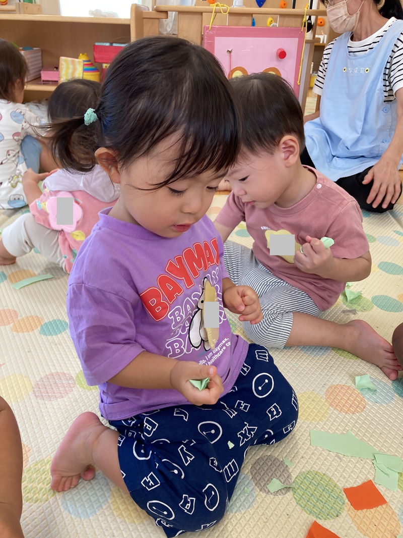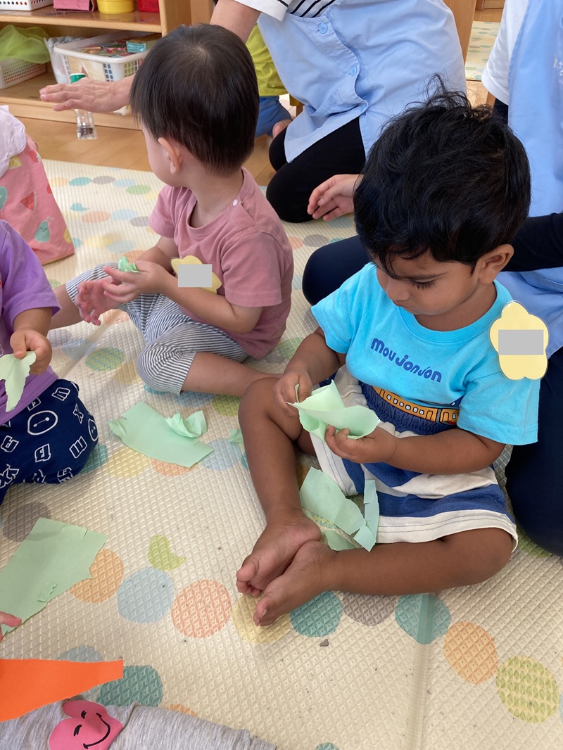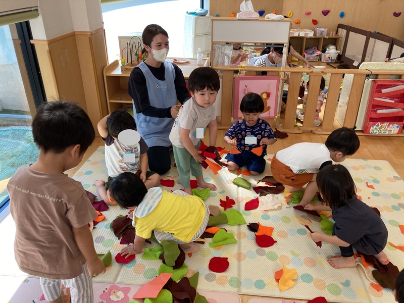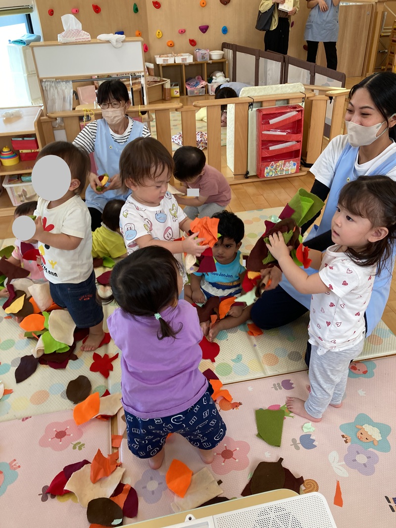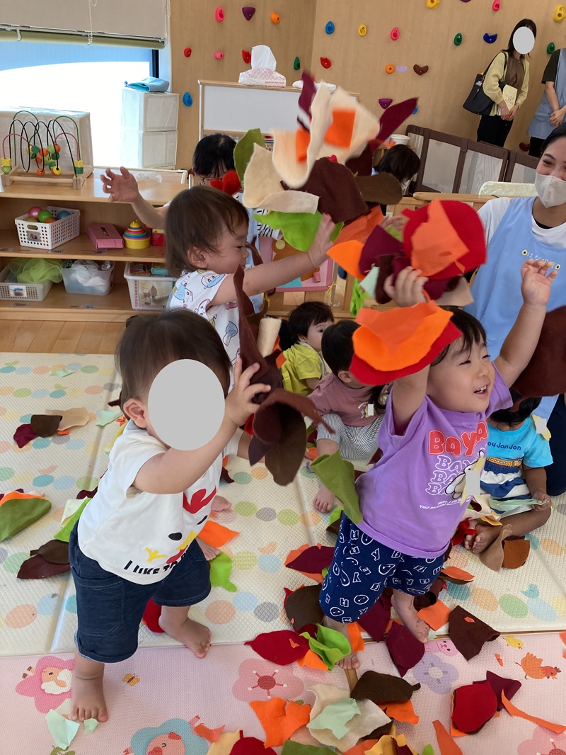 お友だちがちぎってた紙と、講師の先生が持ってきてくれた布のモミジの葉っぱたちを~