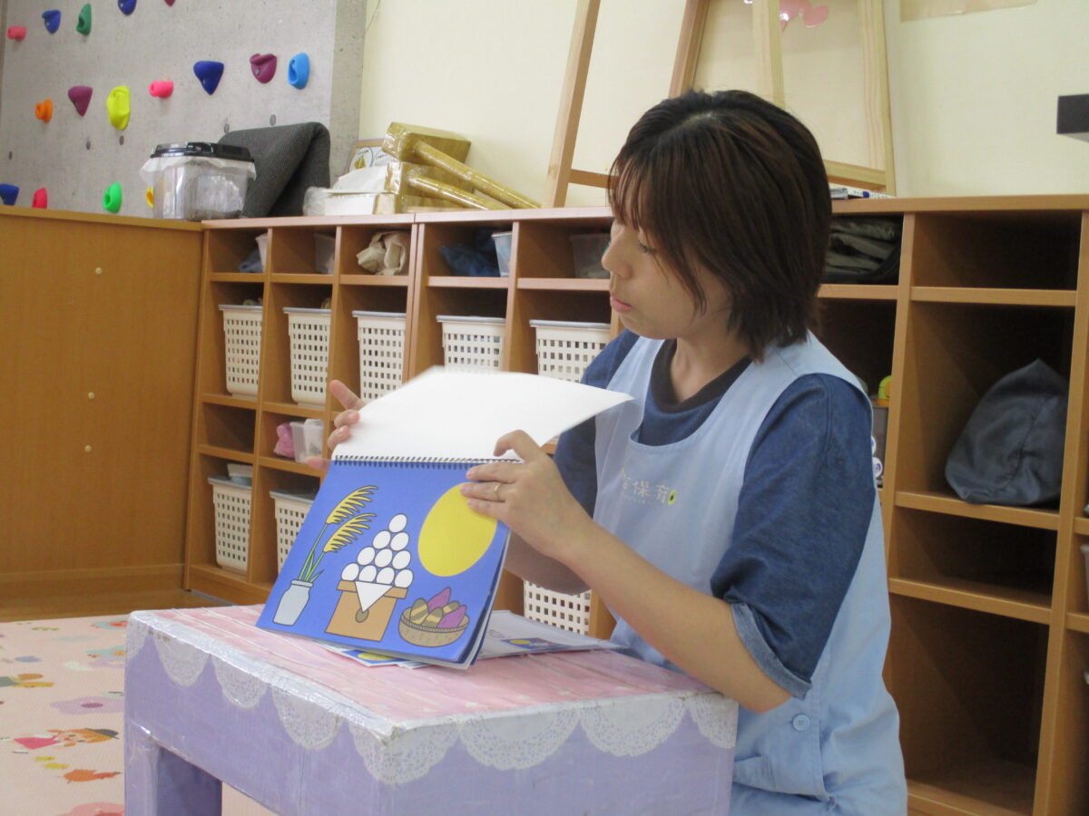 お月見の日にはススキやお団子を飾るんだよ!とスケッチブックシアターを見ながら、