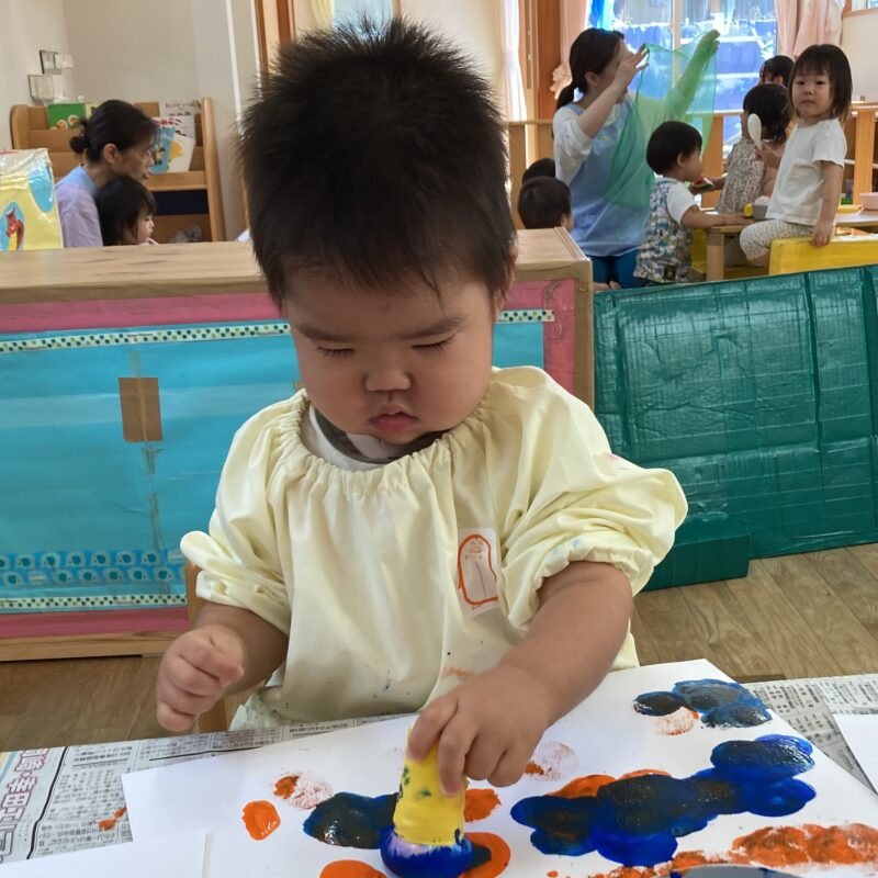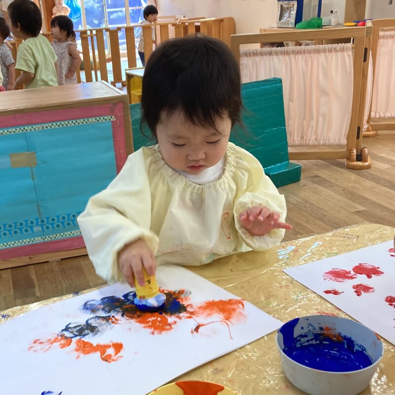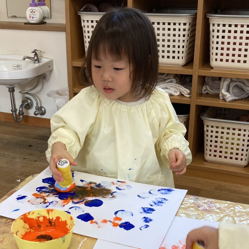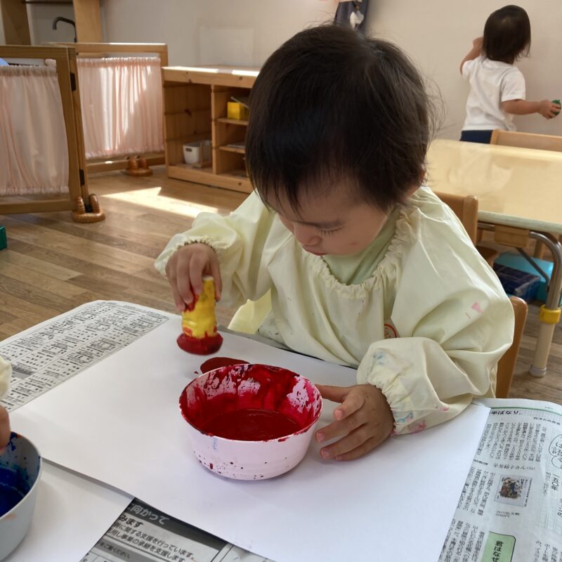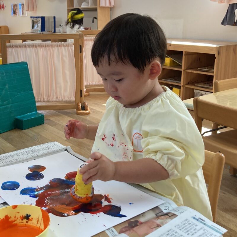 3色の絵の具の中から「あか!」「あお!」と言いながら、好きな色を選んでいました🌈