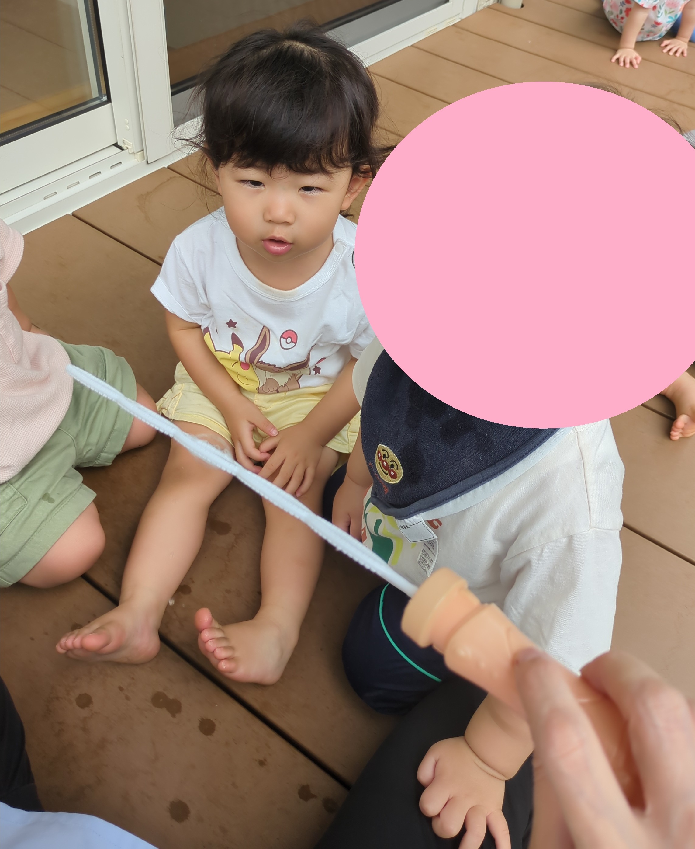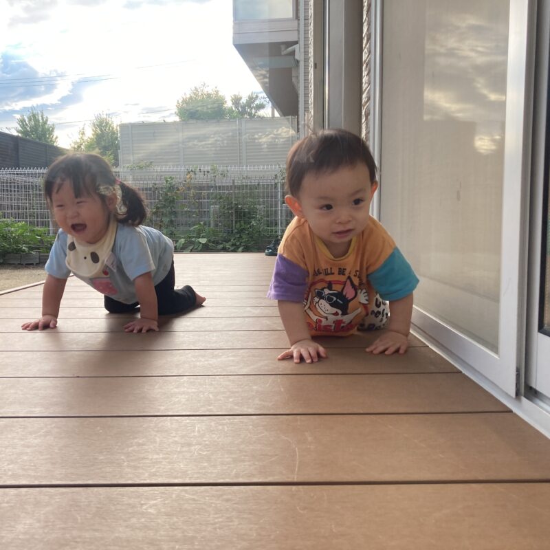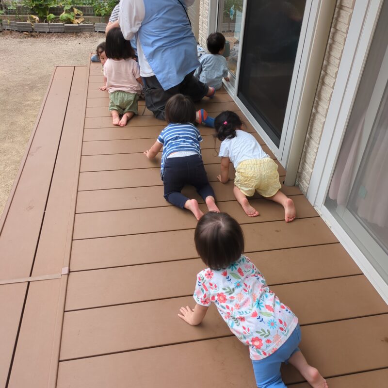 もも組のお友だちも一緒にテラスに出ると、ハイハイレースが始まりました。
