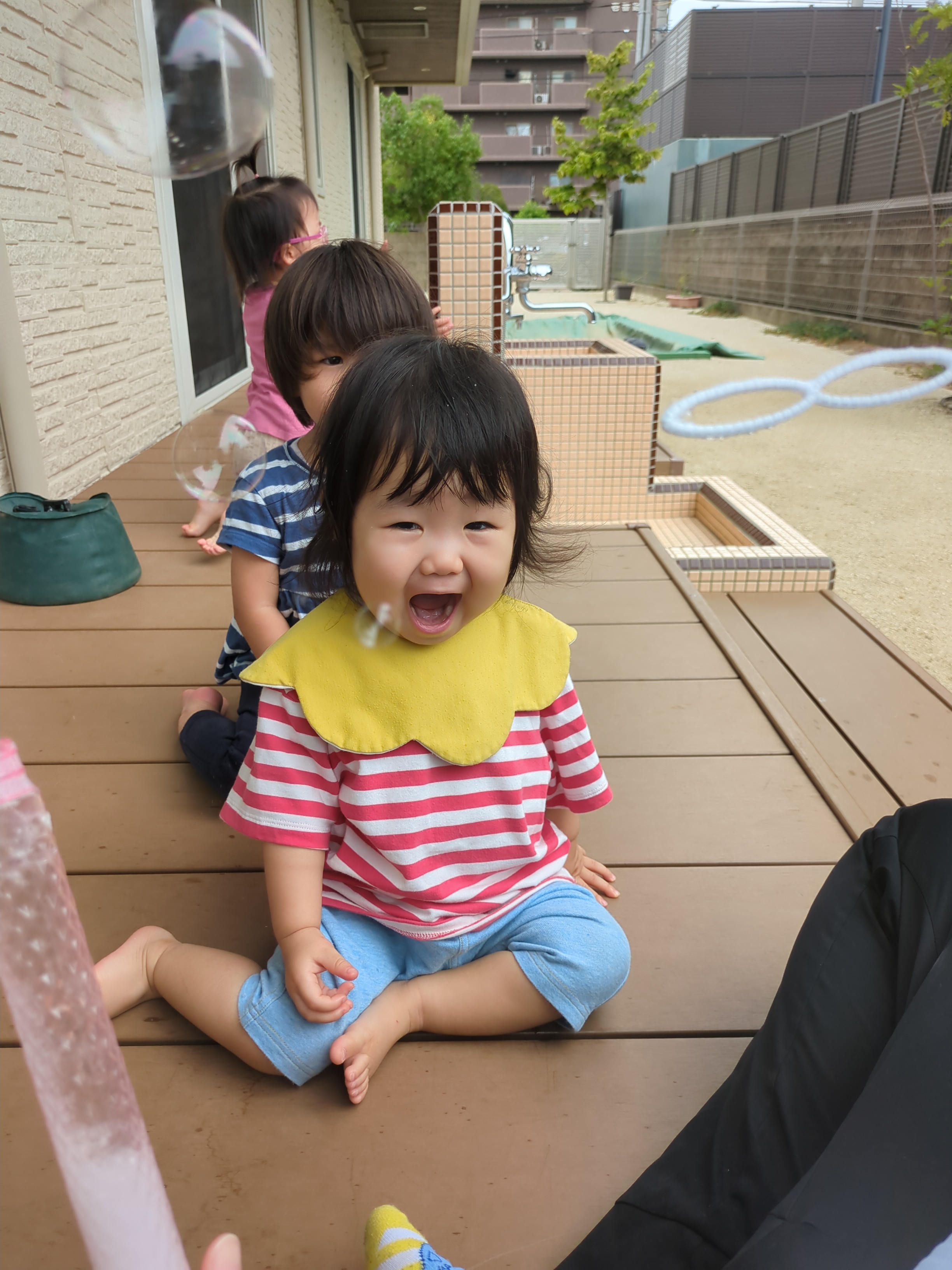 ふーっとシャボン玉を吹いて飛ばしたり、飛んで行ったシャボン玉をパチンと捕まえたりしました。