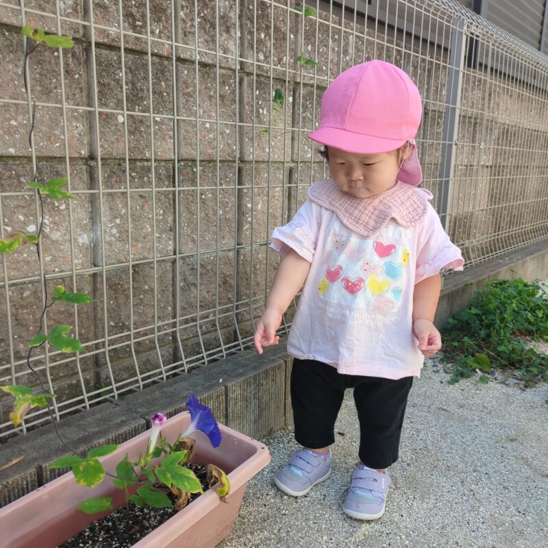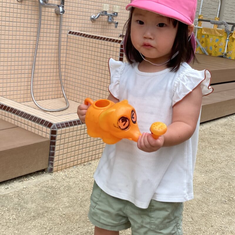 園庭のお花を見つけて「きれいだね!」と眺めたり、自分たちでじょうろのお水をあげて、自然とのふれあいを楽しんでいます。