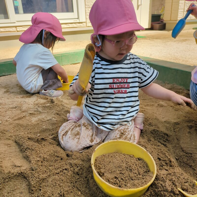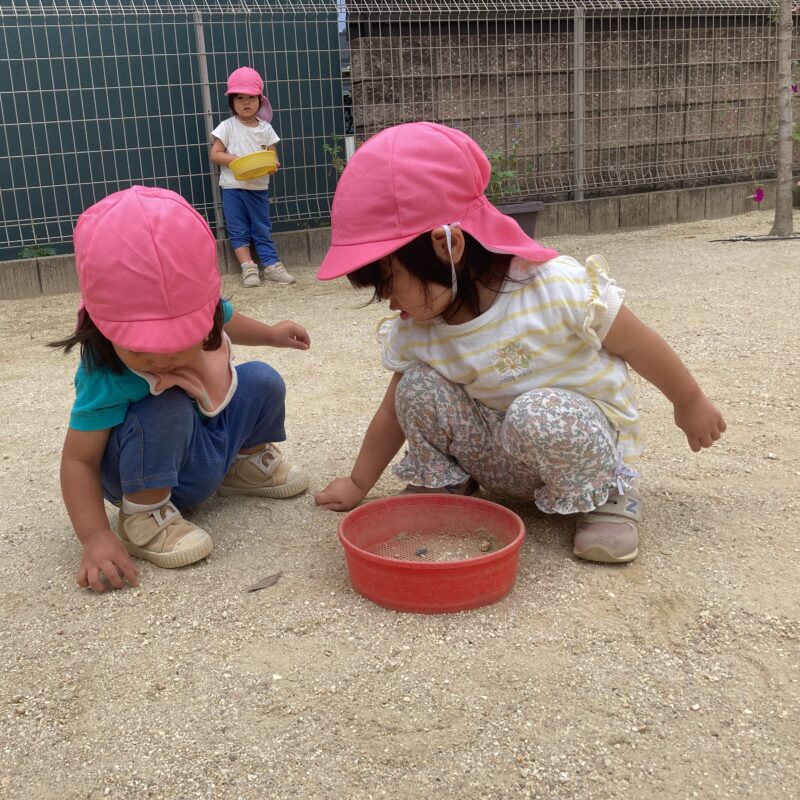 気温が下がって待ちに待った外遊びでは、色々な色の小石を集めたり、砂遊びに夢中になっています。