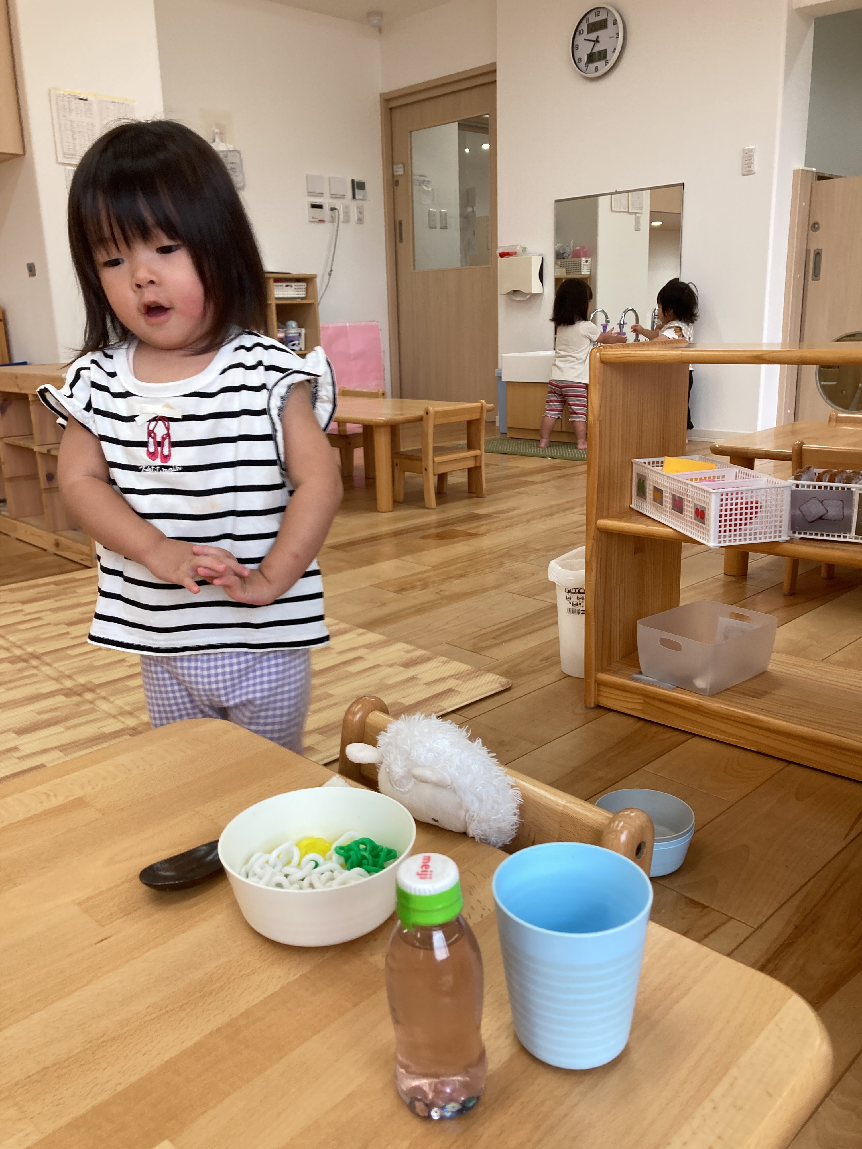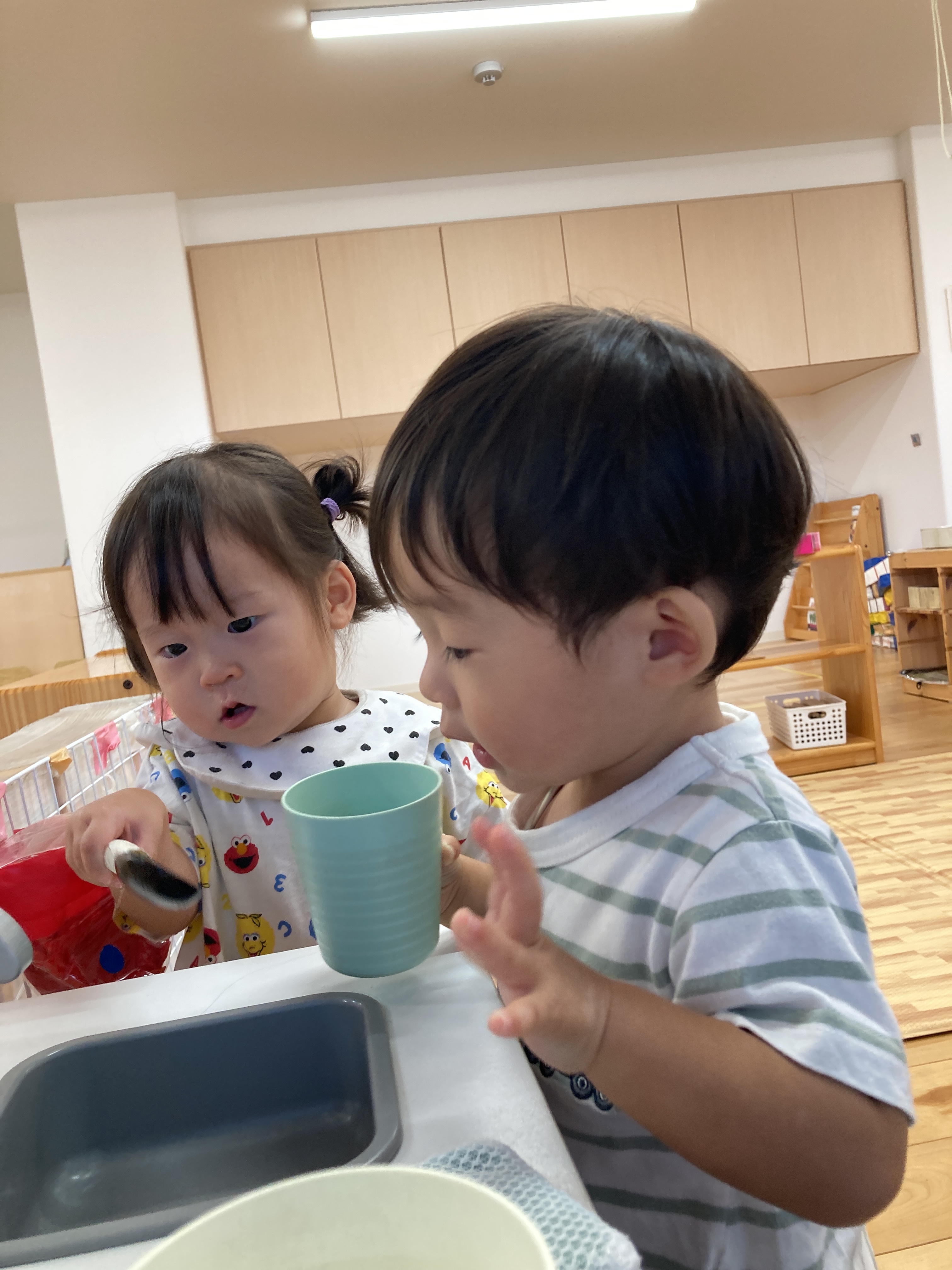 おままごとでは、お皿やスプーンを用意して「どうぞ」とご飯を作ったり、使った食器を流し台で洗ったりしています。