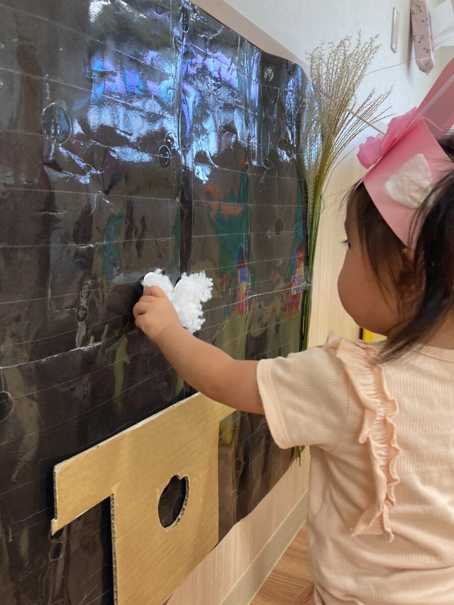 また事前に画用紙に綿を張り付けたものも壁面の飾りとして一人ずつ貼り付けてくれました。