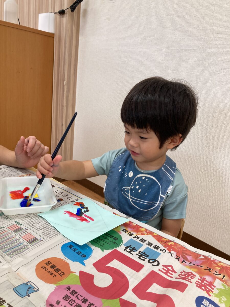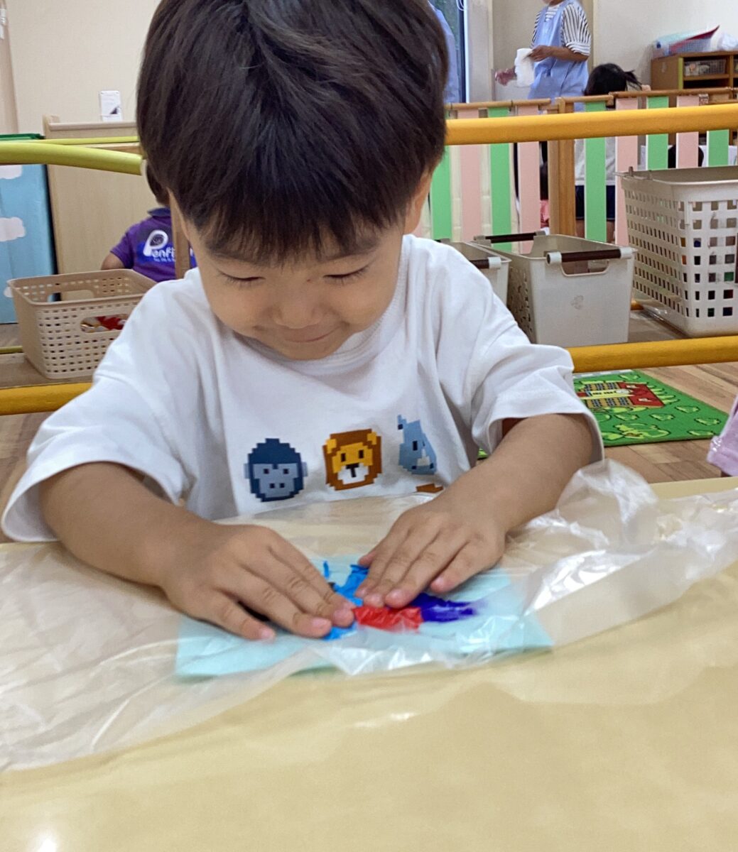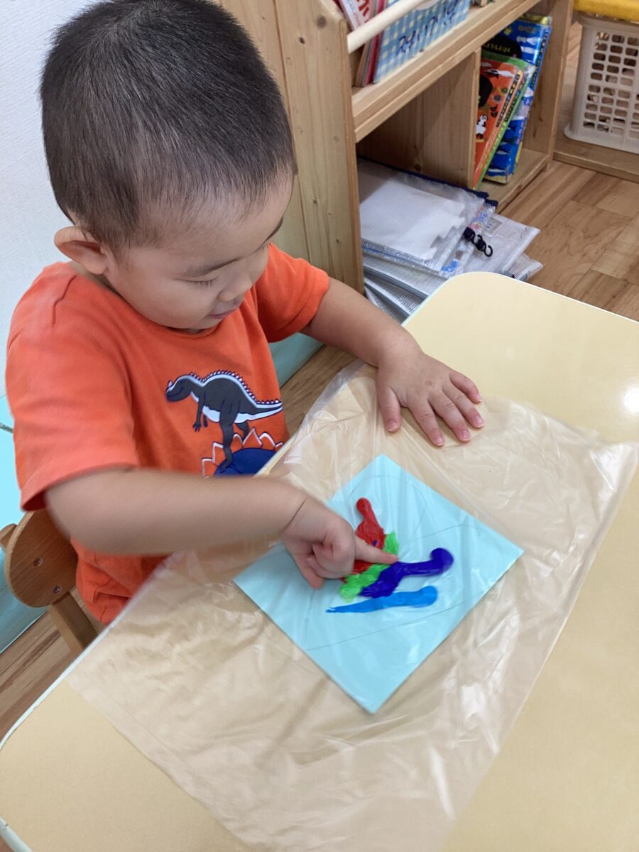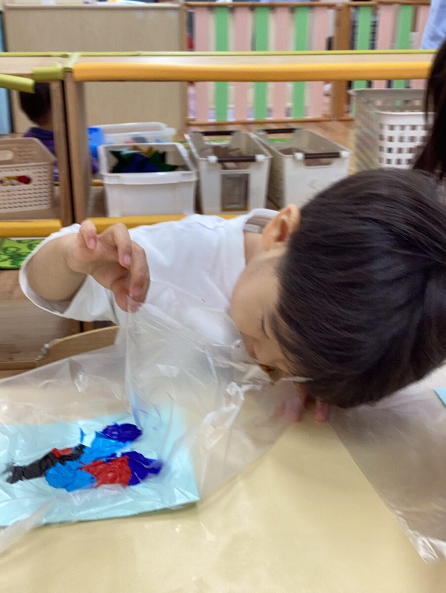画用紙に絵の具をのせ、袋に入れてから袋越しに押していき、色を付けます