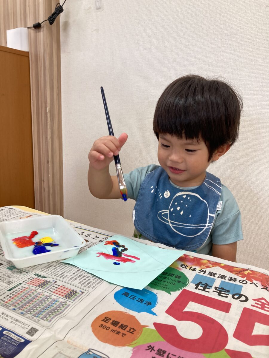 画用紙に絵の具をのせ、袋に入れてから袋越しに押していき、色を付けます