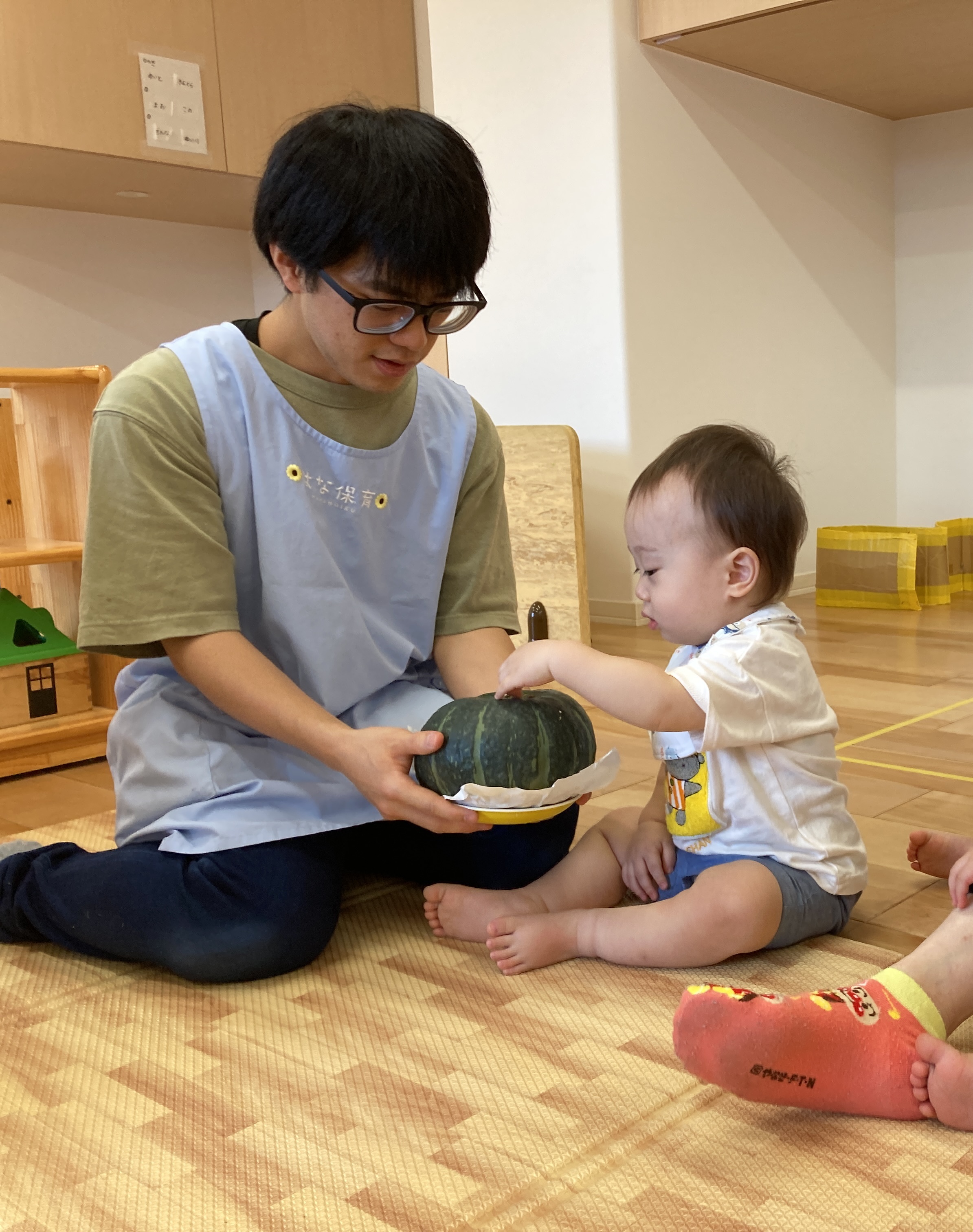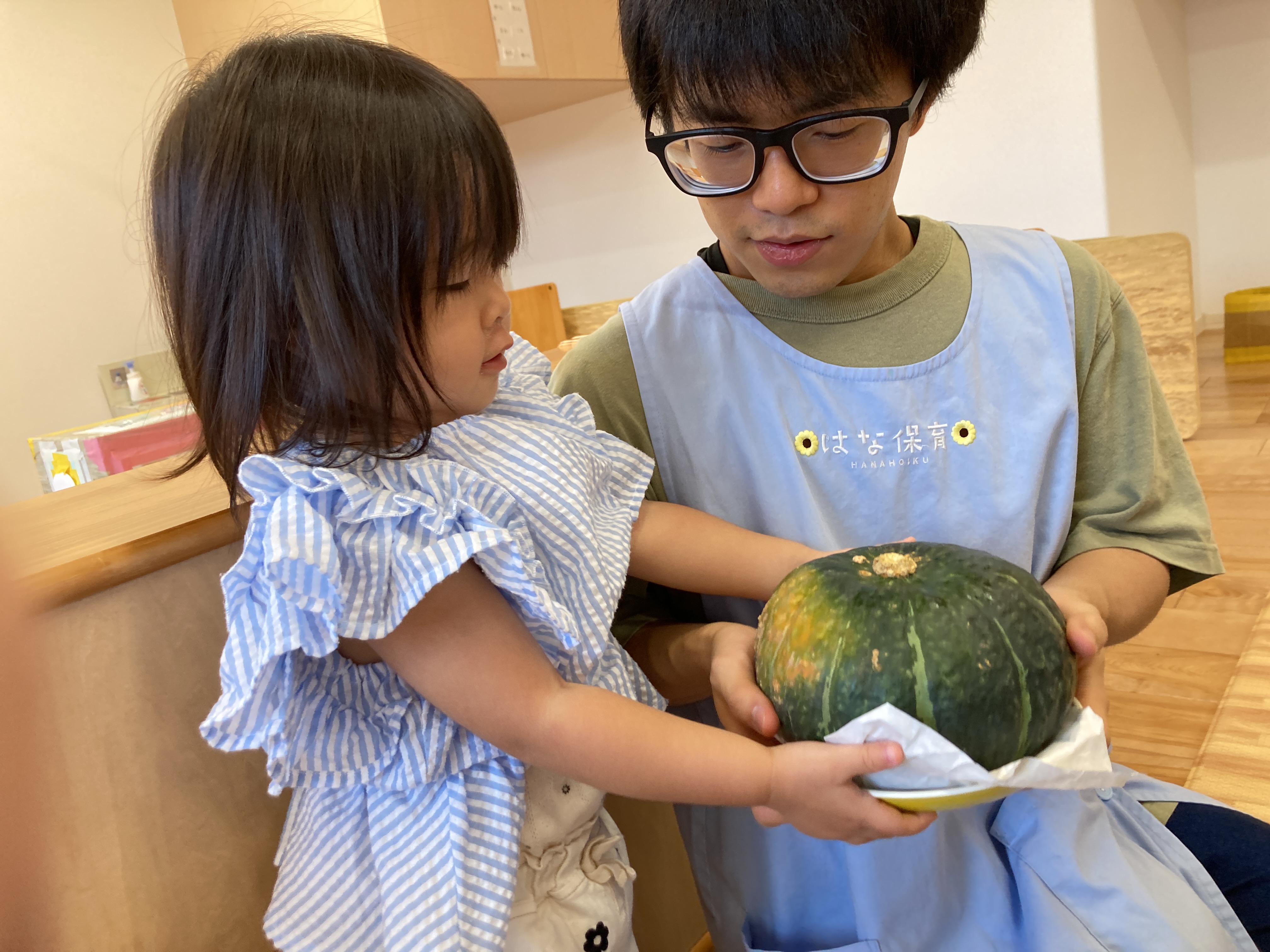 かぼちゃを持ちあげてみると「おもいー!」とびっくり!