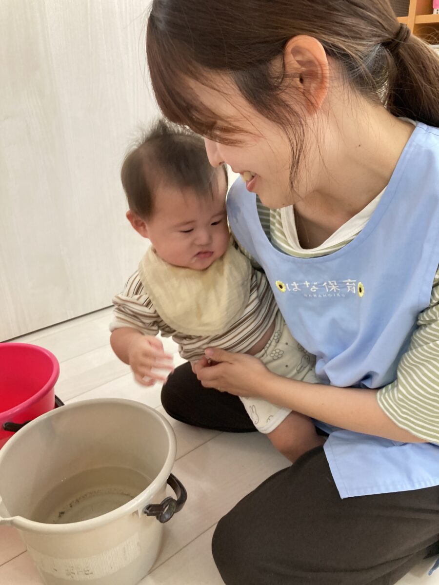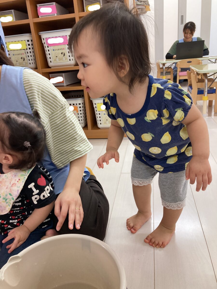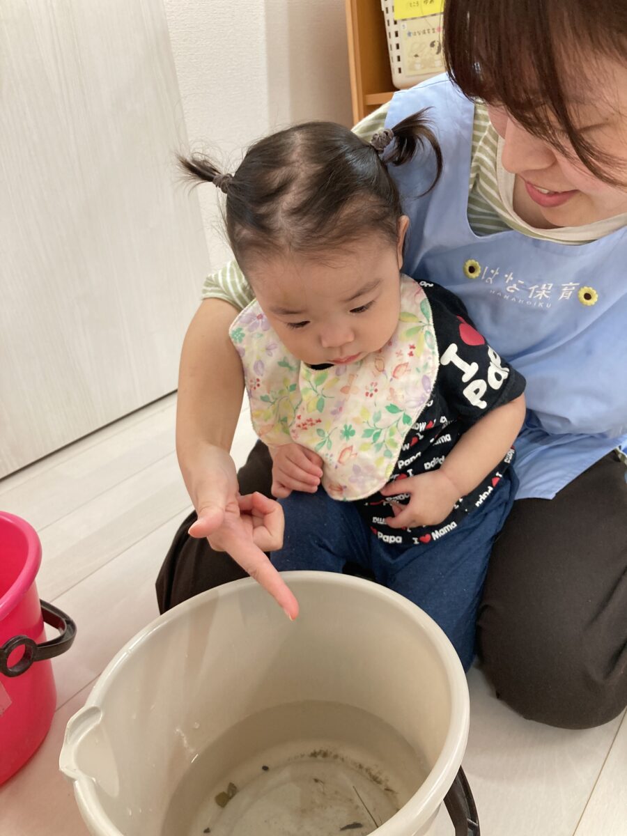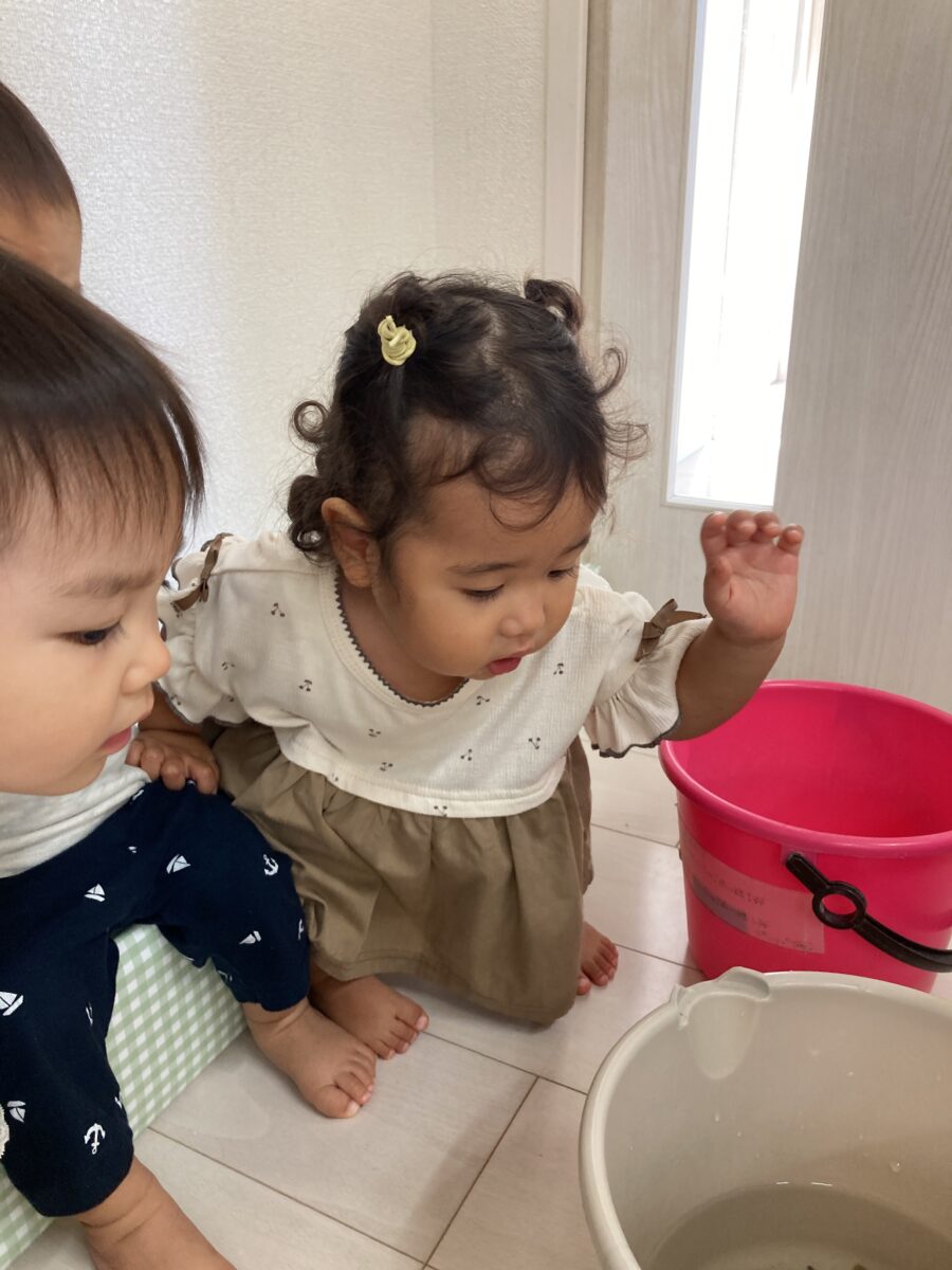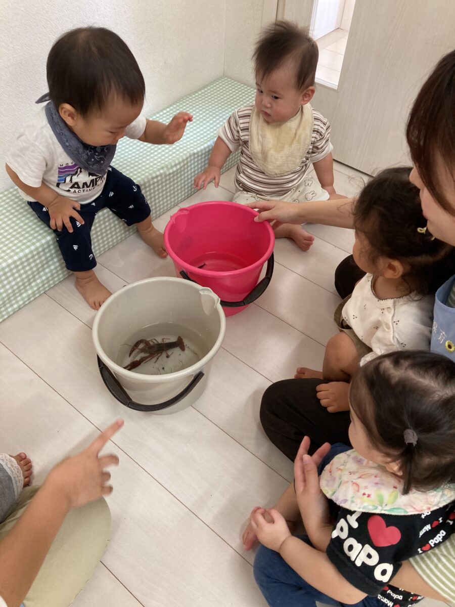 大きい組のお友達が見つけてきたザリガニと魚を見ている様子です🐟