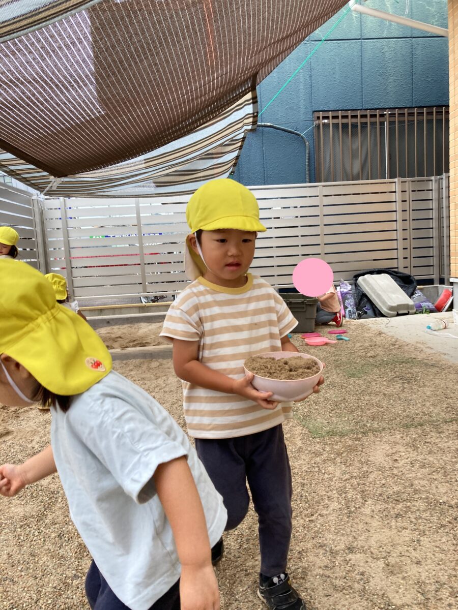 「ごはんできたよ」「せんせいもどうぞ」と、保育者にも分けてくれましたよ