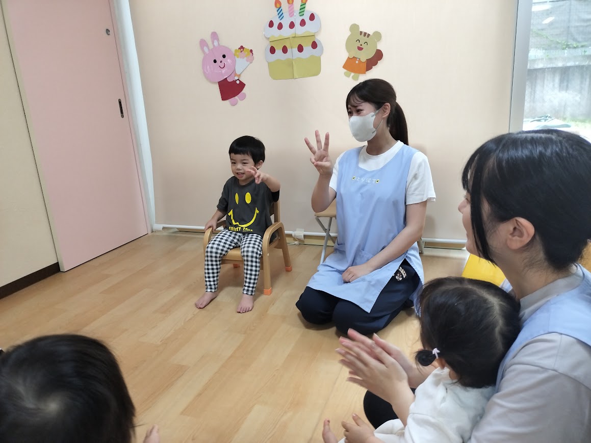 この日は3歳の男の子のお誕生日会でした☆彡保育者が会の準備をしていると「僕のお誕生日だ~!」と嬉しそうに椅子に座っていました♪