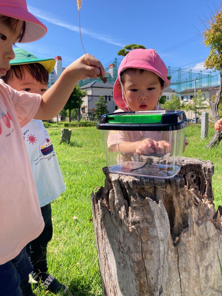 お外に行くと秋の生き物や草花が見られ、お散歩に出掛けるたびに虫や花などを探しては観察しています♪