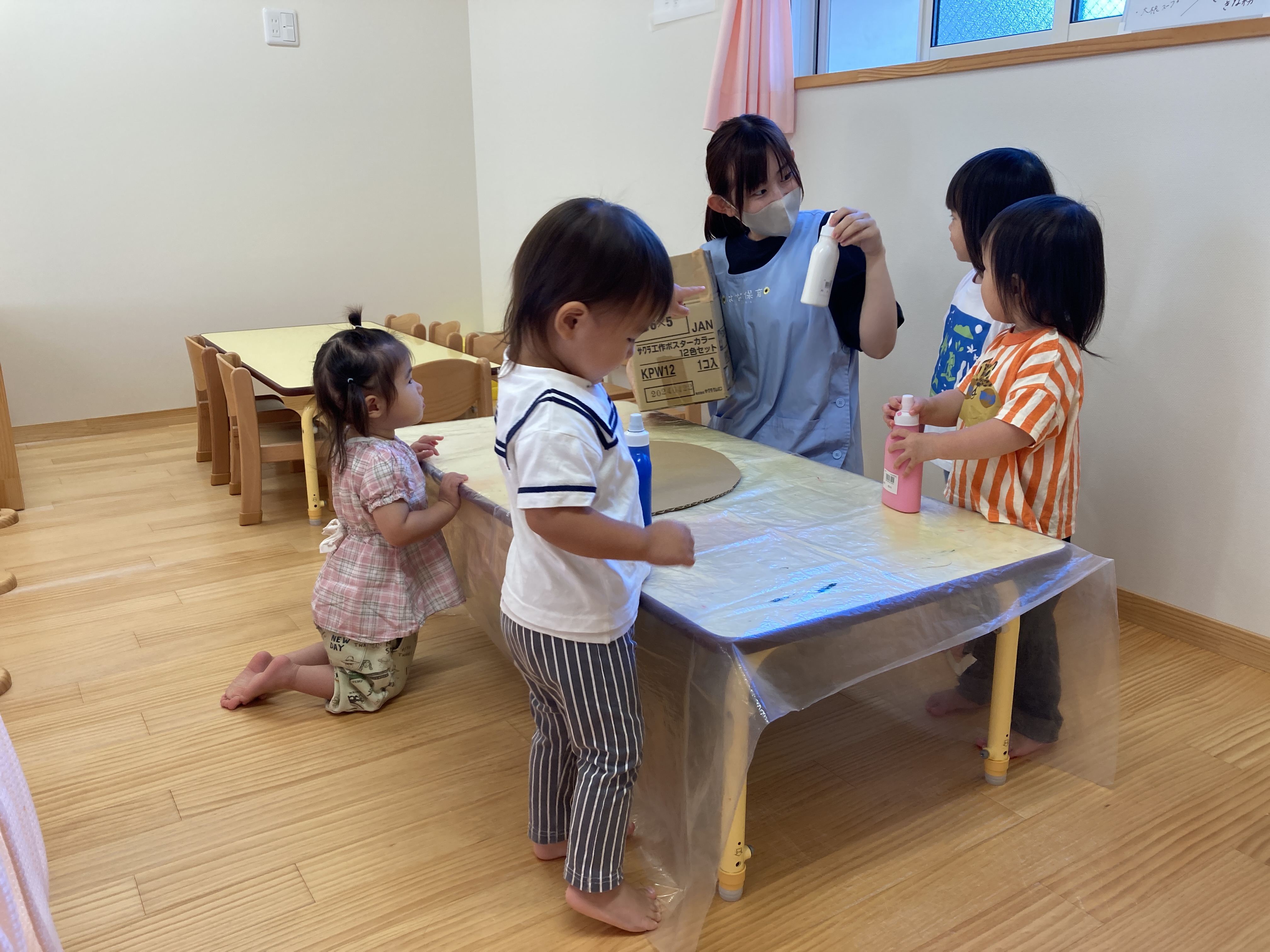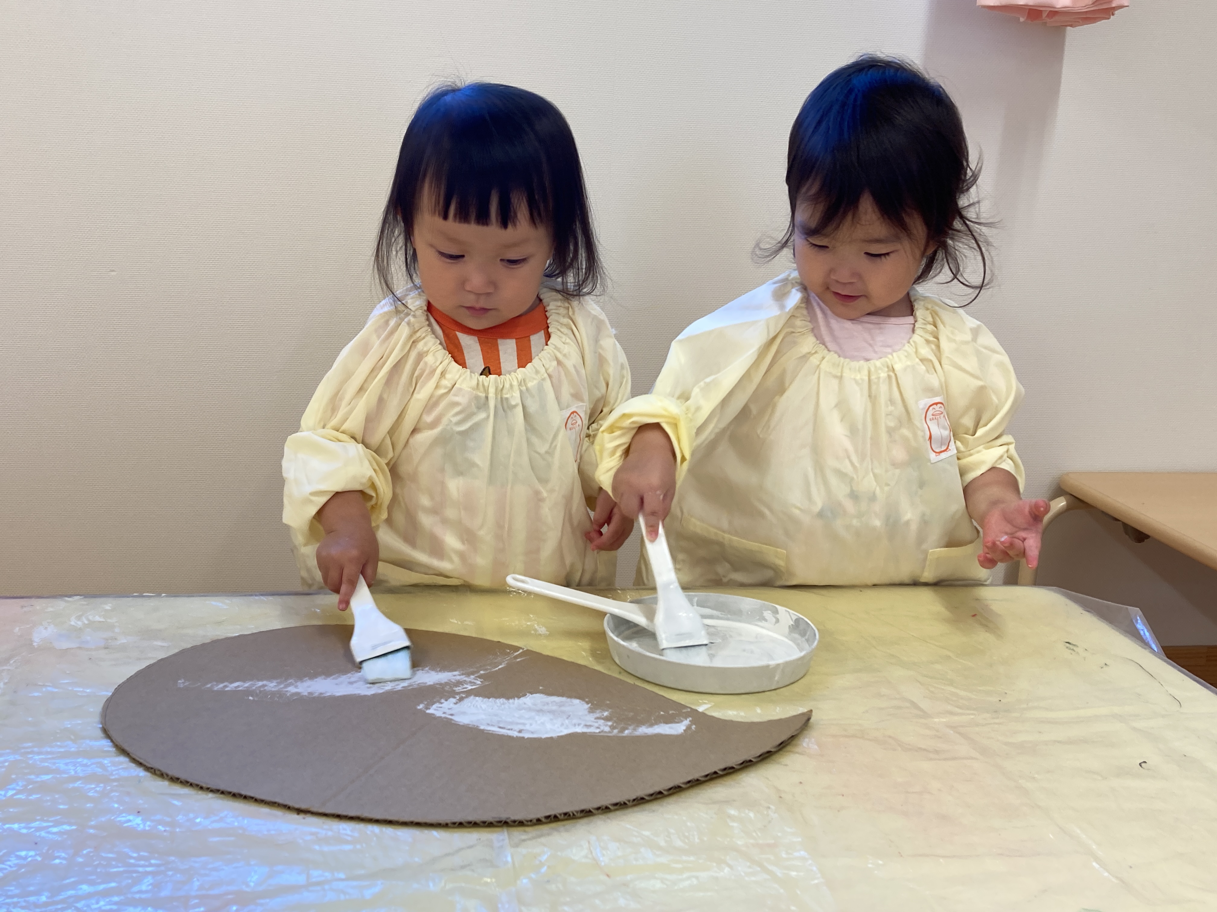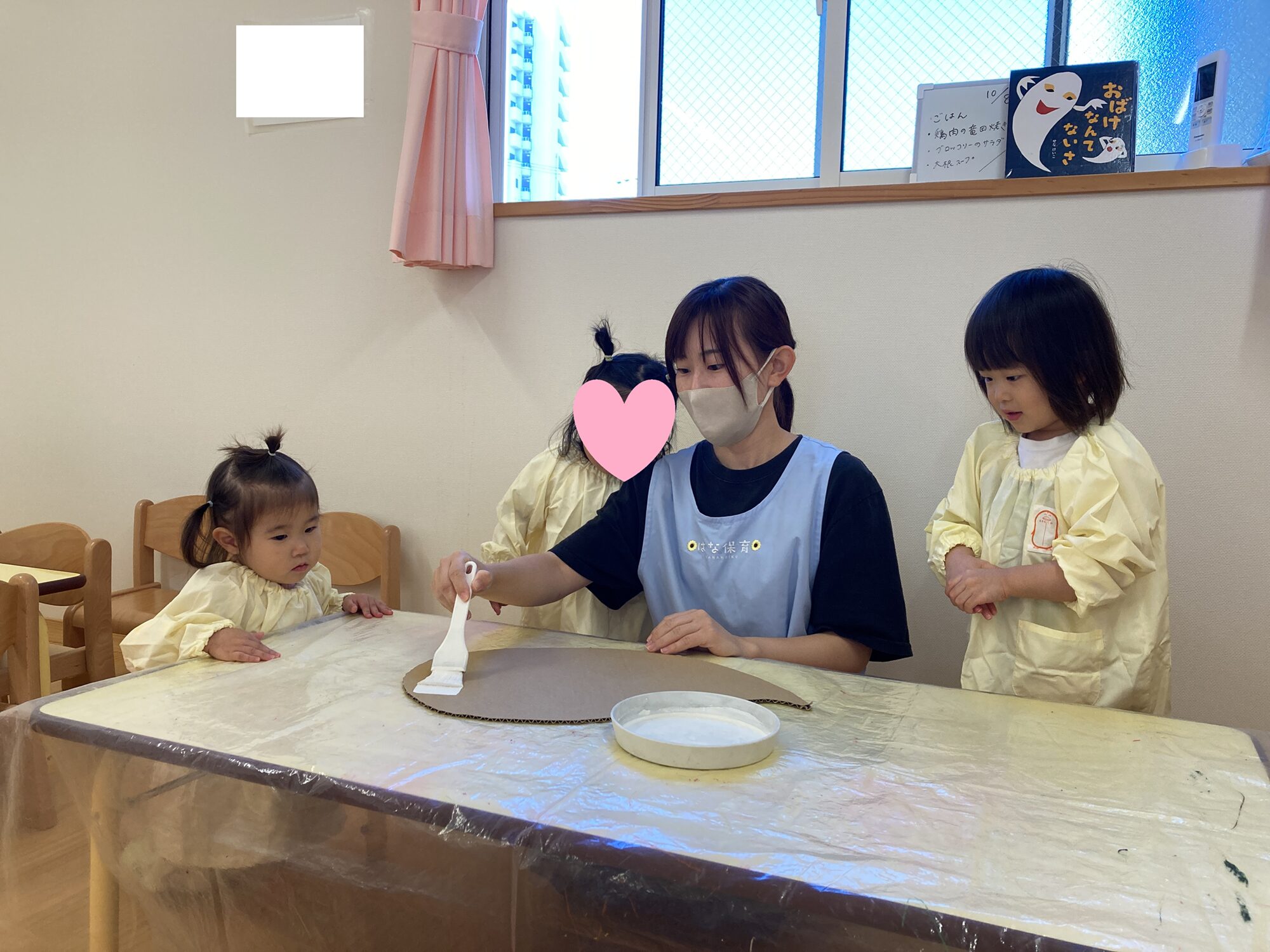 2025.10.24 名古屋市くるまみちギャラリー おばけなんてないさ♪(1歳児) こんにちは はな保育園くるまみち 1歳児 めばえ組です 気持ちのいい秋晴れの日が続き、すっかり肌寒くなる季節になってきました! 絵本『おばけなんてないさ』が大好きなめばえ組さん。みんなで、両手がゆらゆら動くおばけを作って、「ばぁ!」と大喜びでした 「おばけは何色かな?👀」 じっと夢中で先生が塗るのを見つめていますね