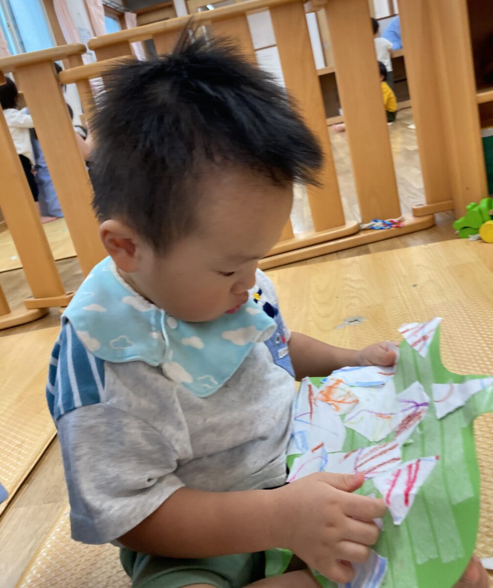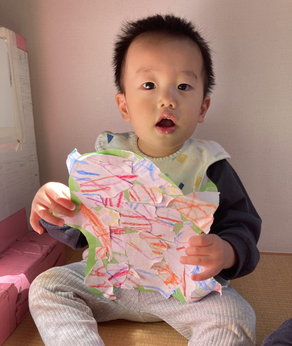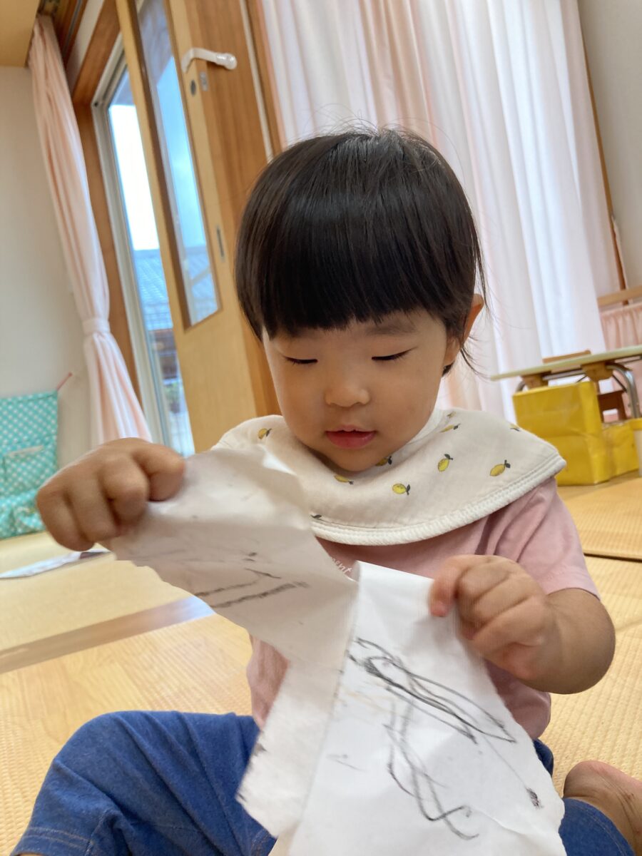 大きな紙にみんなでたくさんお絵描きした後は紙をちぎって遊びます![]()