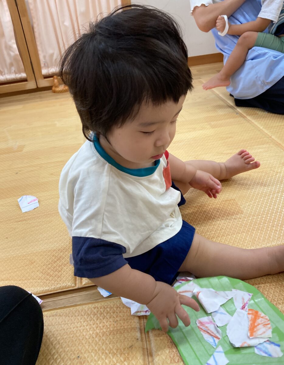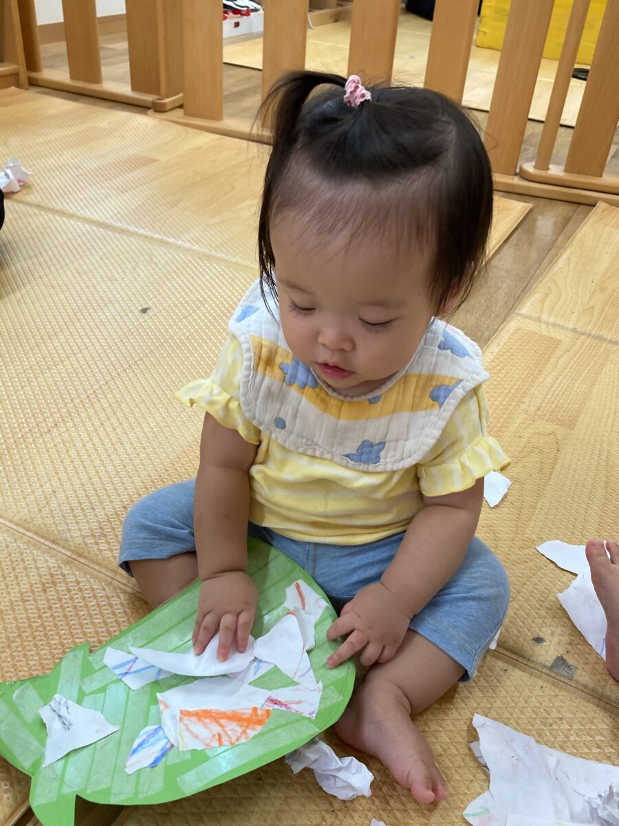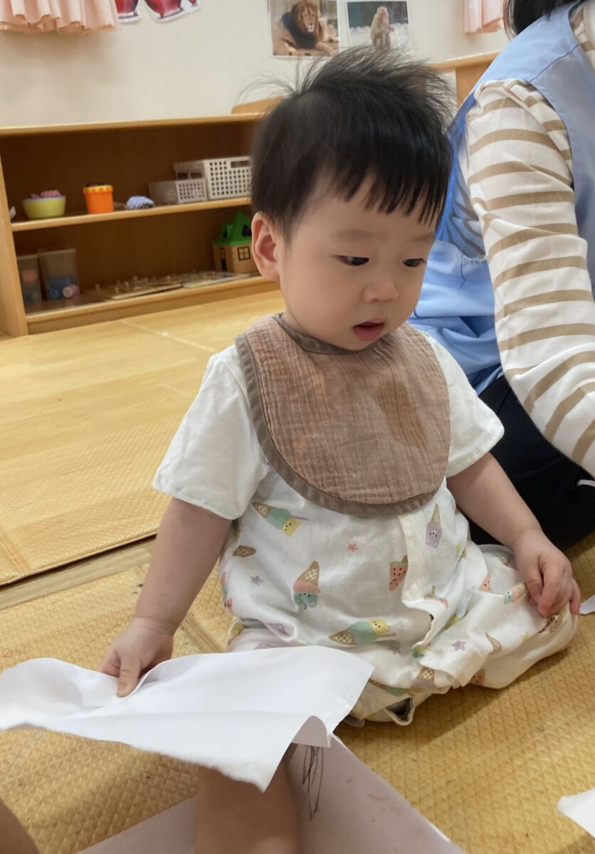 大きな紙にみんなでたくさんお絵描きした後は紙をちぎって遊びます![]()