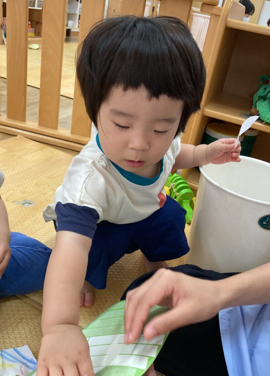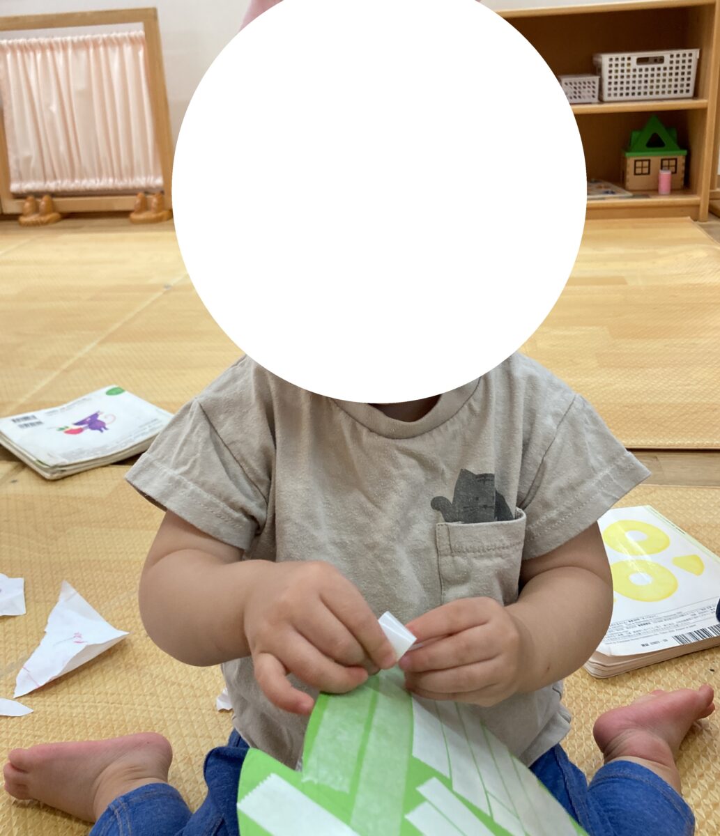 保育者が先の方を少しめくると、上手にピーっとはがしていました!