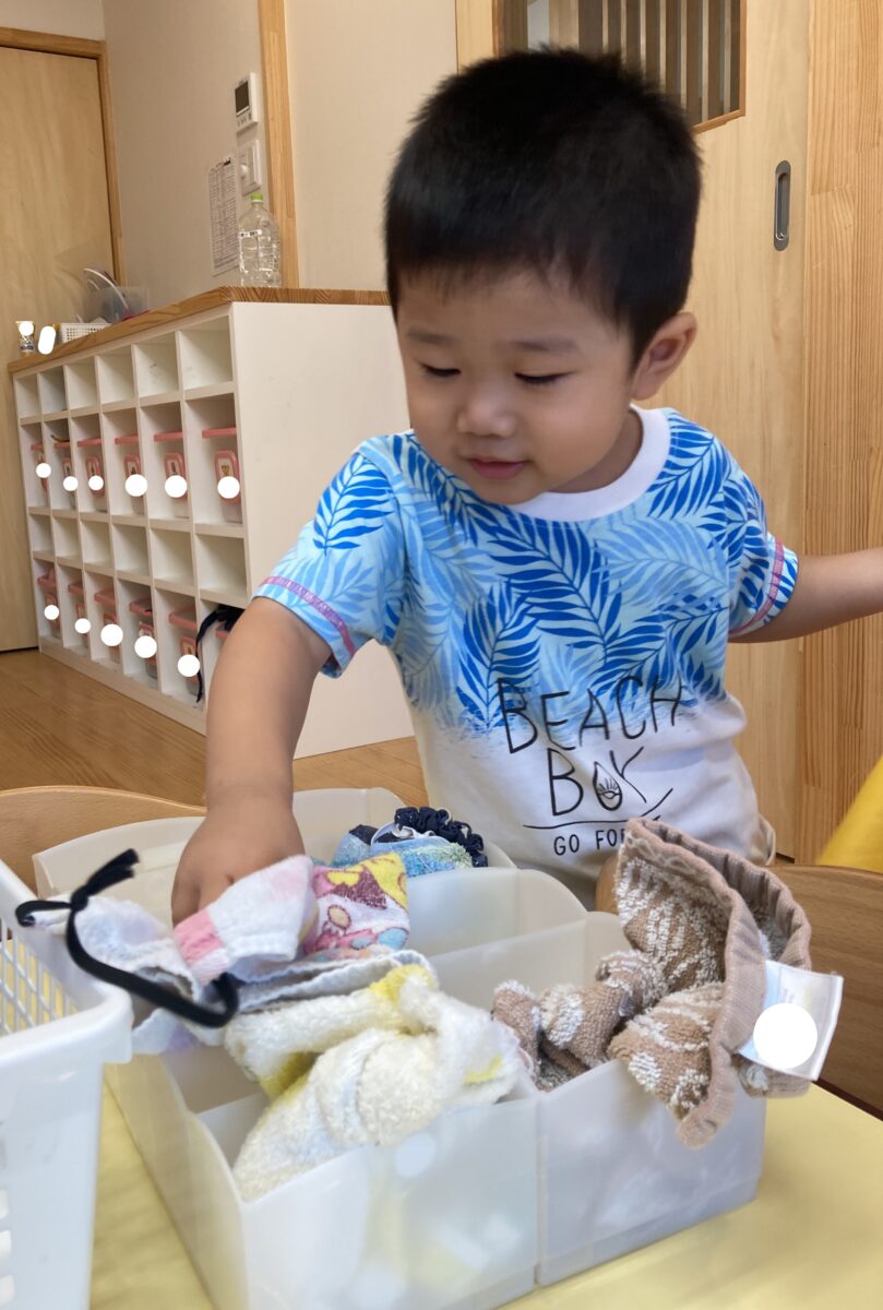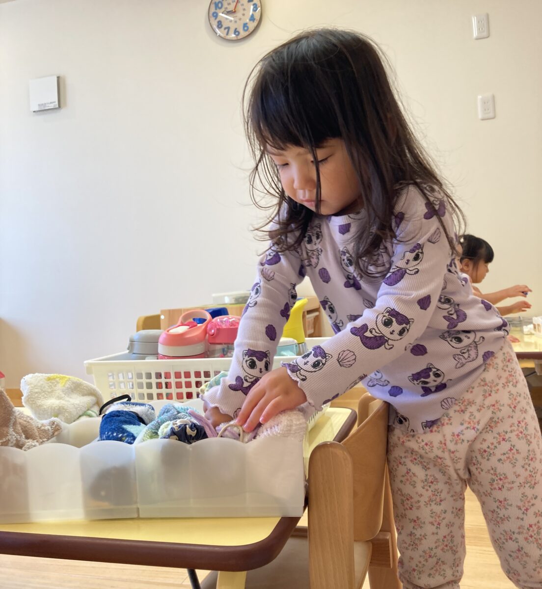 初めは「できないよぉ」と言って弱気になっていた子どもたちですが、お支度の仕方を丁寧に伝えて一緒にやっていくうちに、