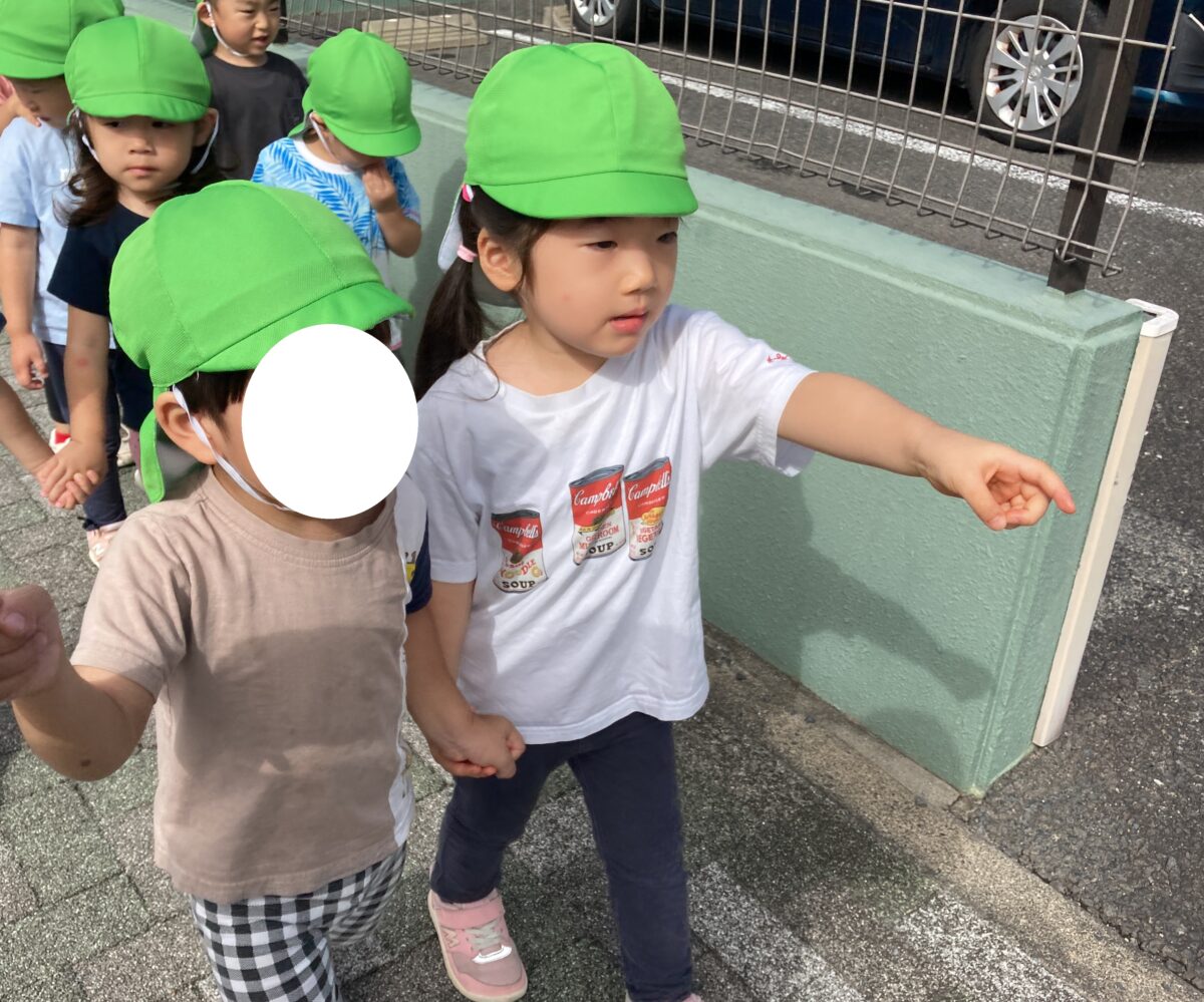 横断歩道を渡る前には車や自転車が来ないかを確認するのですが、最近は子どもたちも「みーぎ、ひだり、みーぎ!」と言って一緒に確認してくれたり、自然と手を挙げて渡ることをお知らせしたりしていて、お散歩を楽しみながら交通ルールを知っていくことができているように感じます!