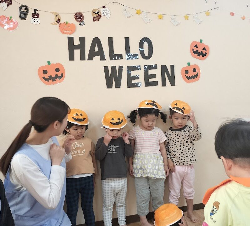 自分たちで目と口を貼って、パンプキンの帽子をつくりました。素敵な帽子が完成しましたね!