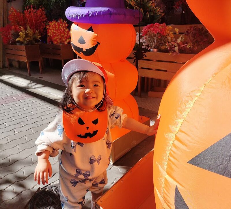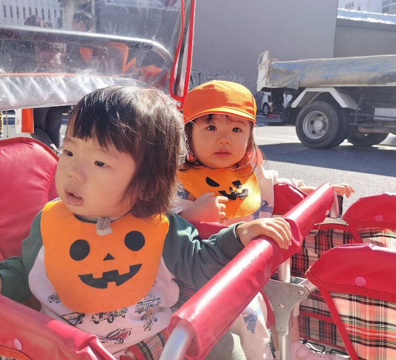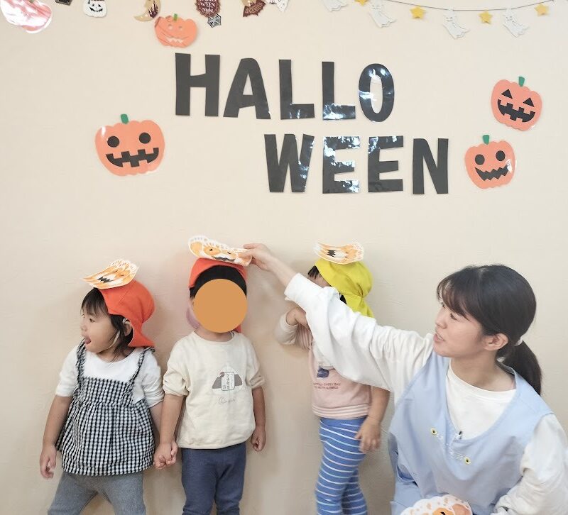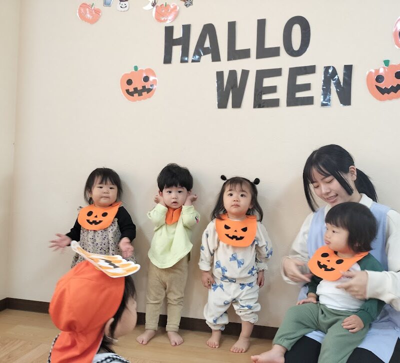 先生たちが手づくりしたパンプキンのスタイをつけました。0歳児さんらしくて可愛いですね!