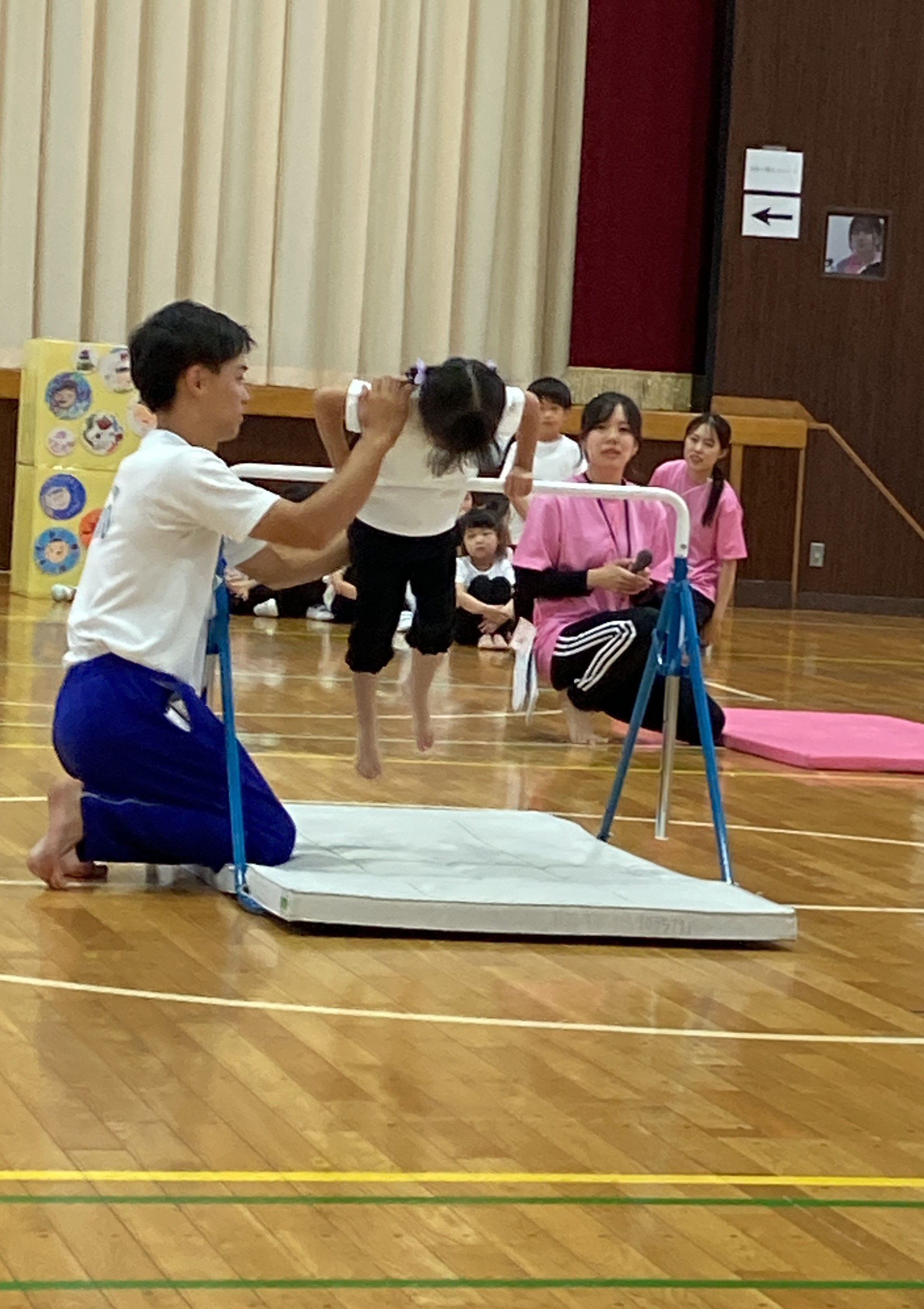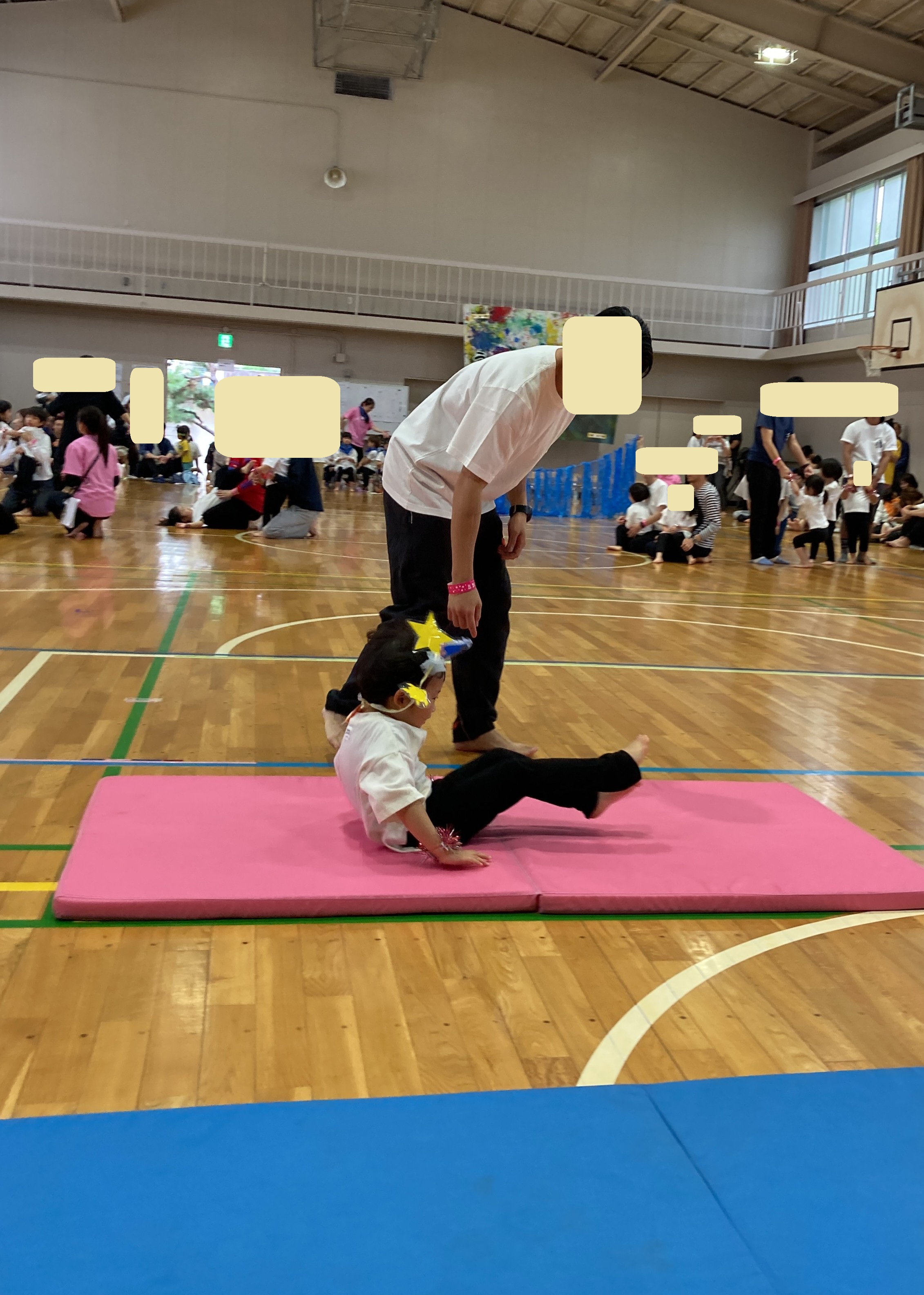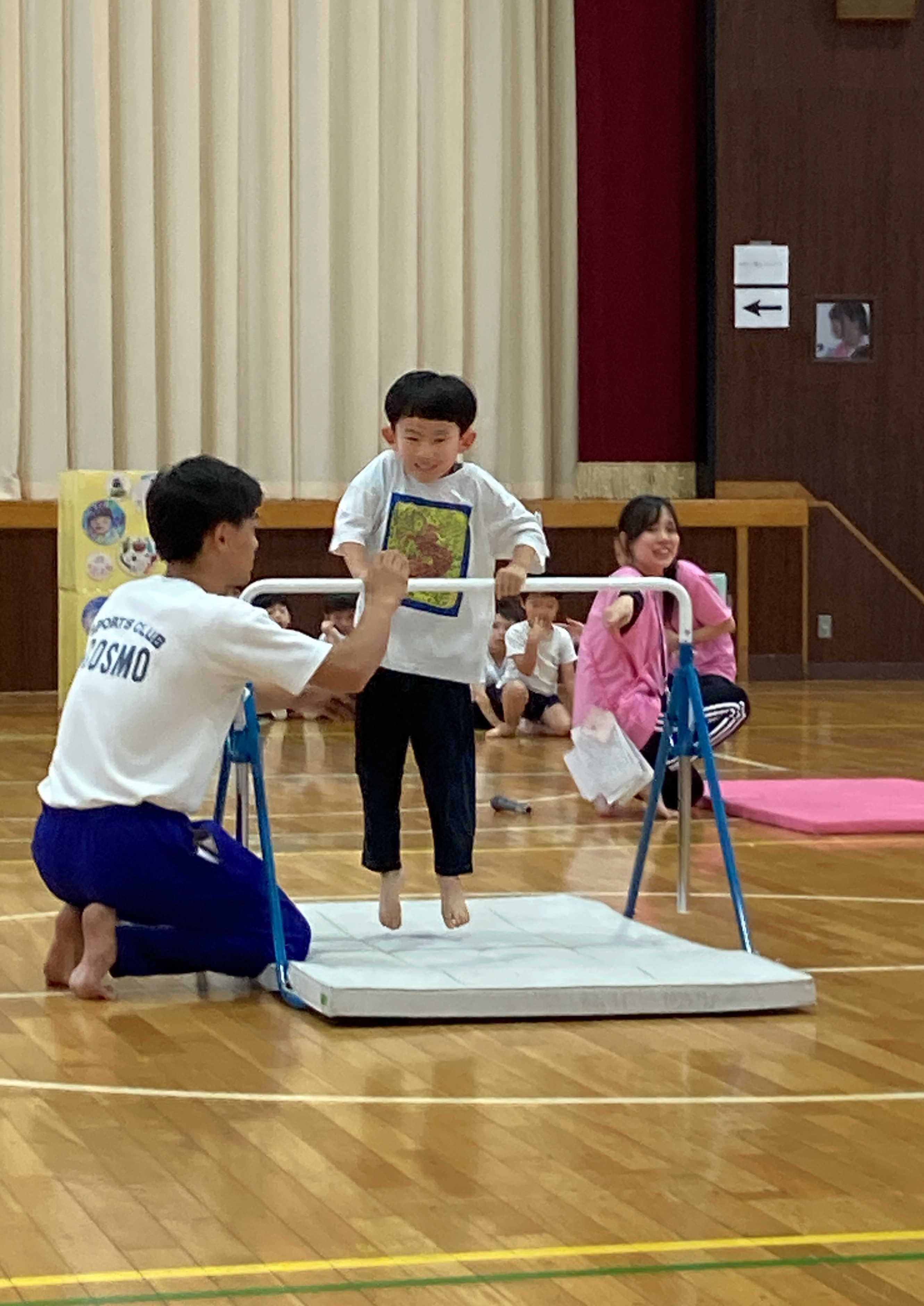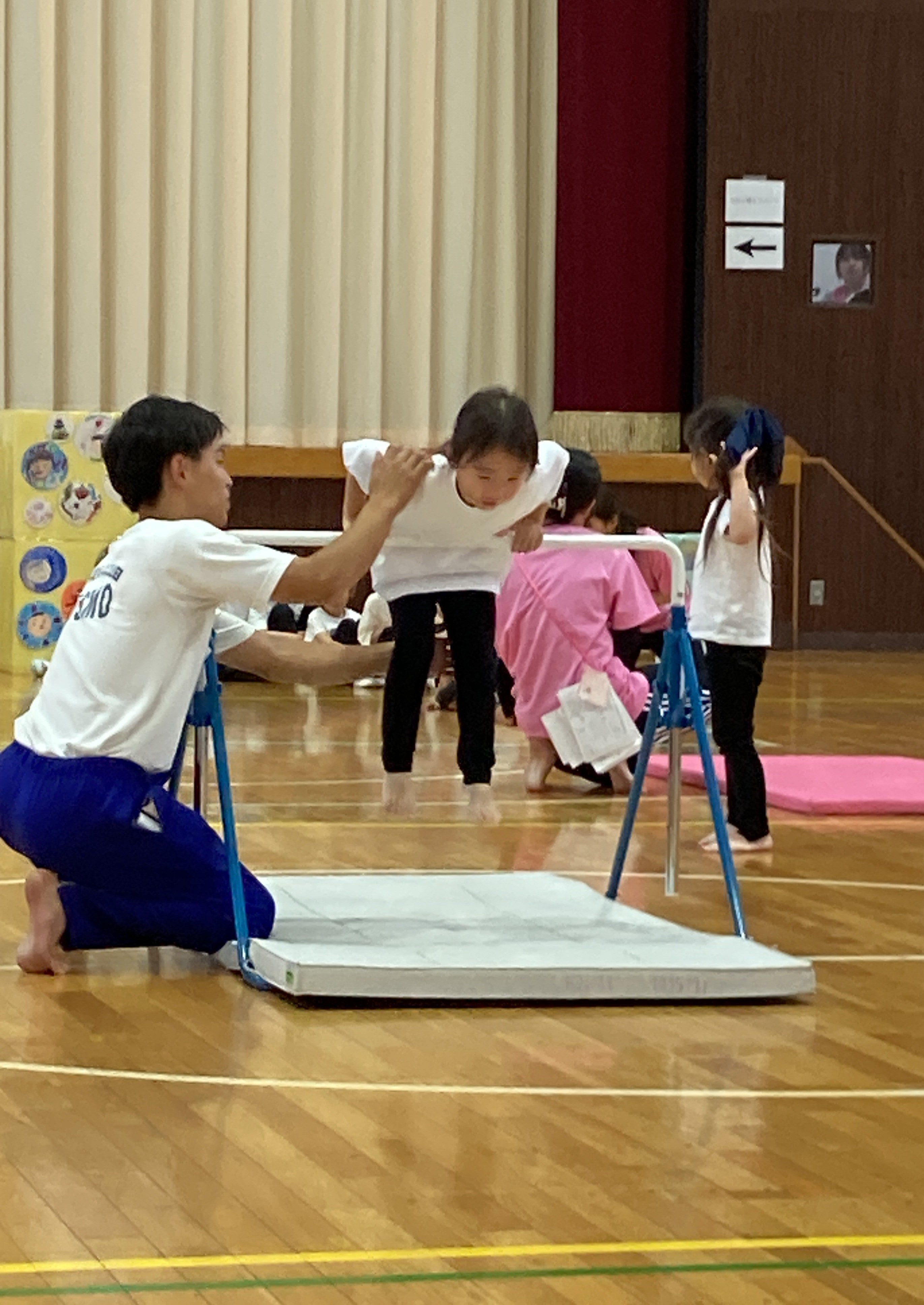 4歳は助走付き前転と鉄棒の前回りを、5歳は後転と跳び箱を披露しました。