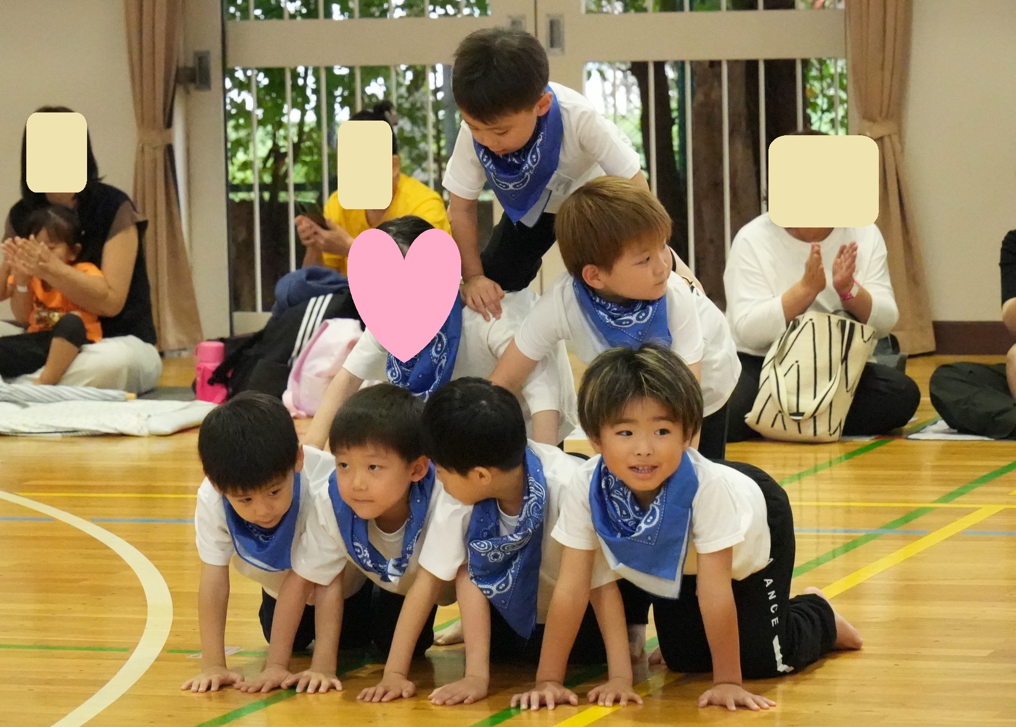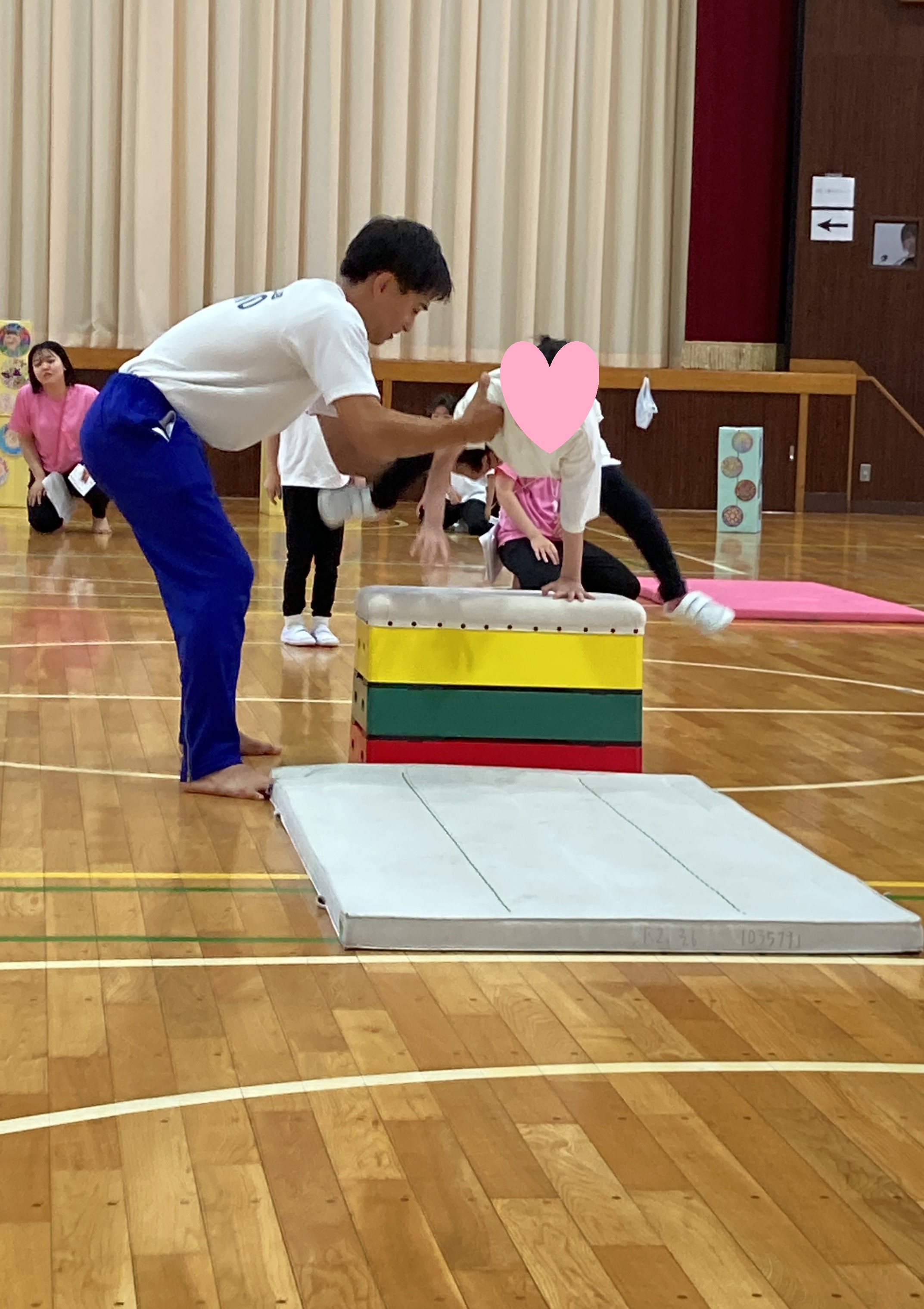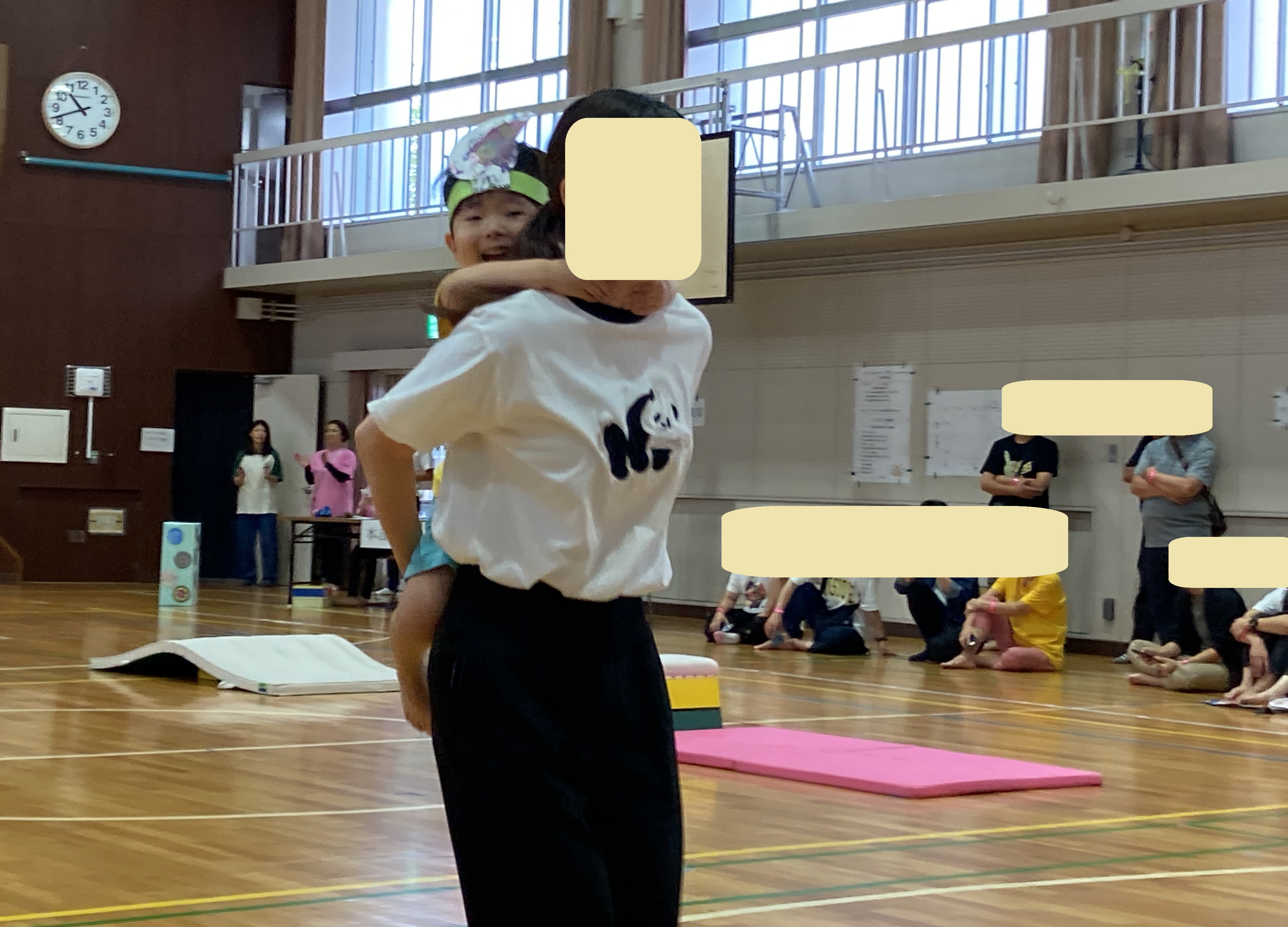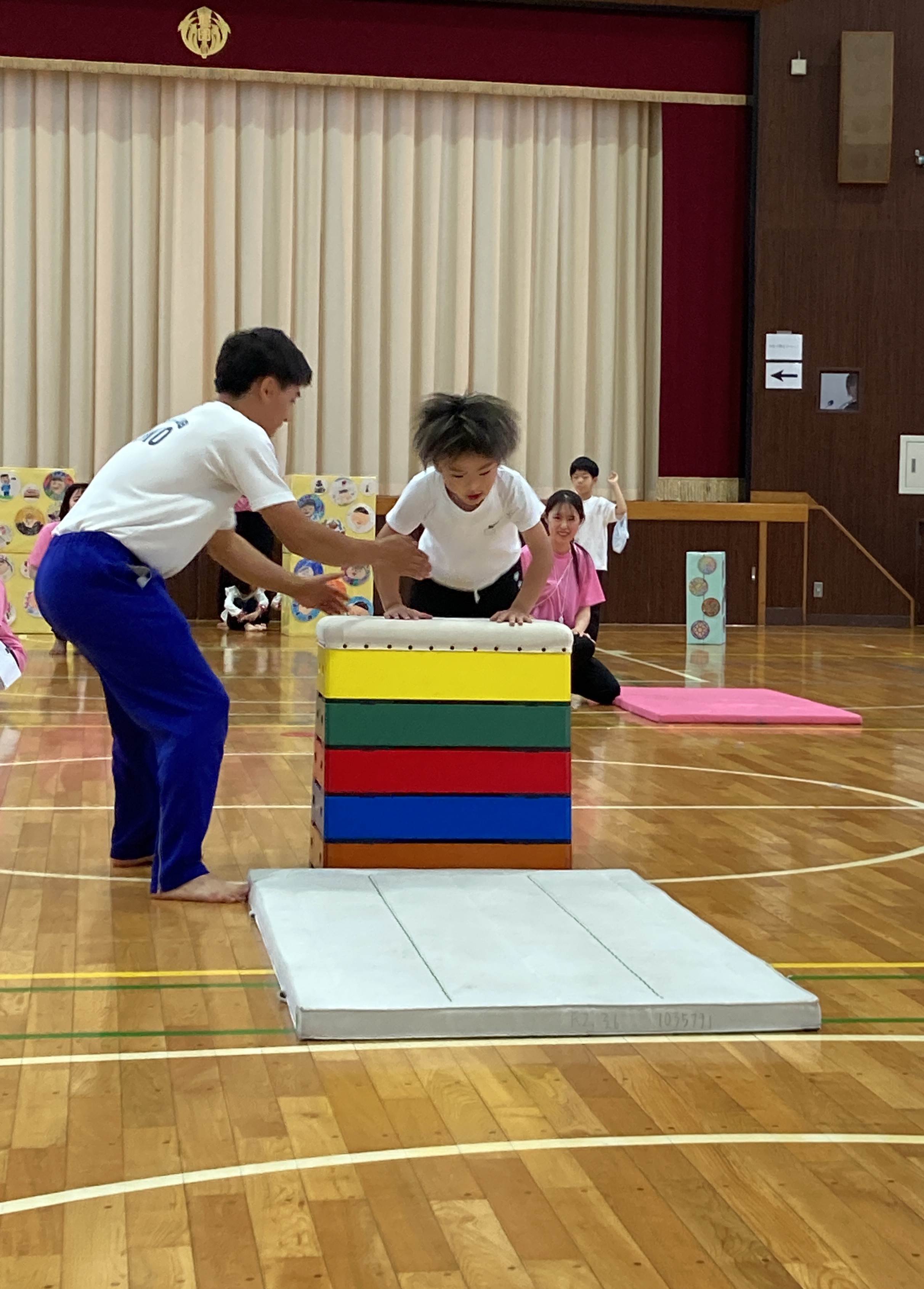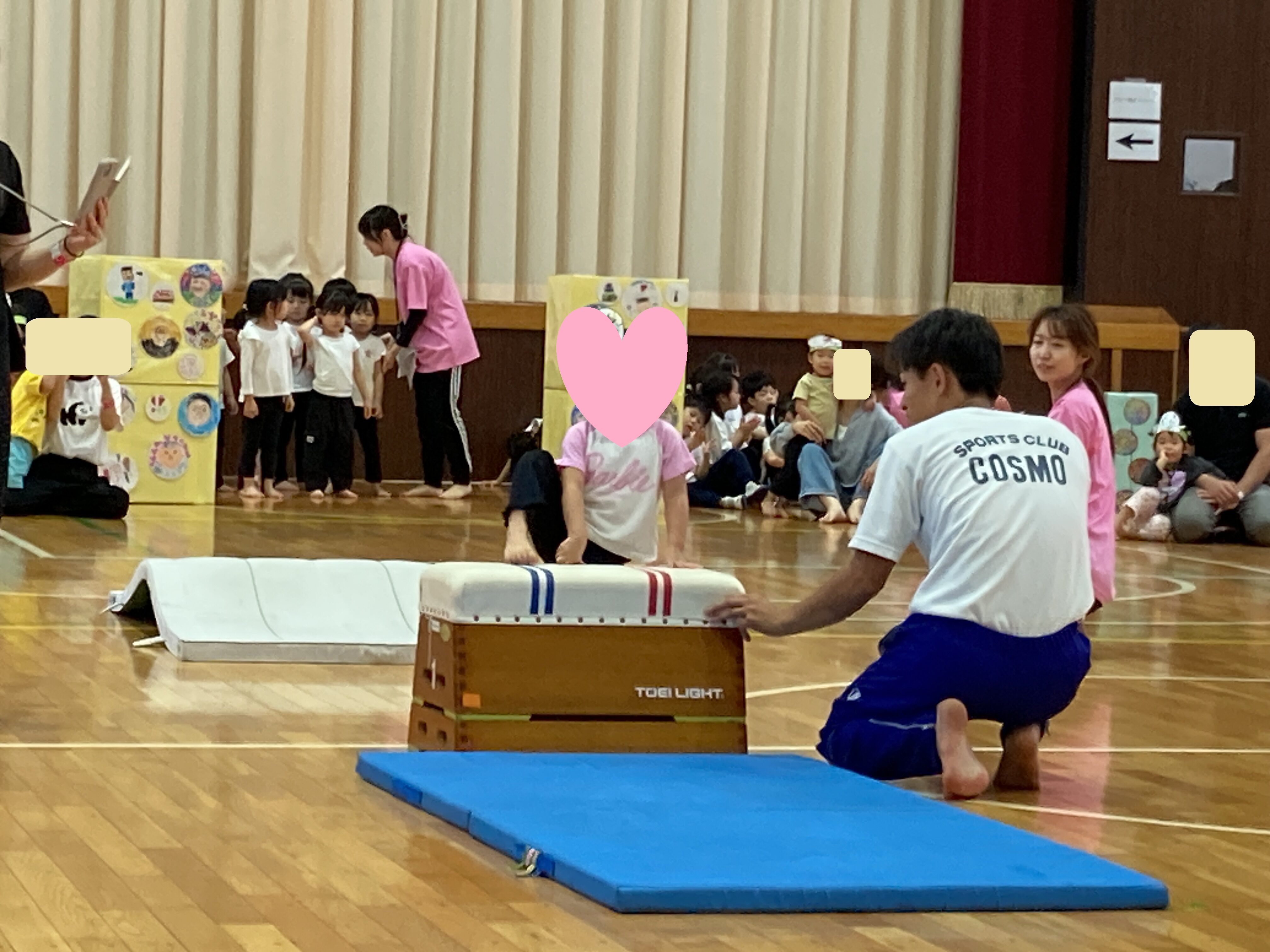 4歳は助走付き前転と鉄棒の前回りを、5歳は後転と跳び箱を披露しました。