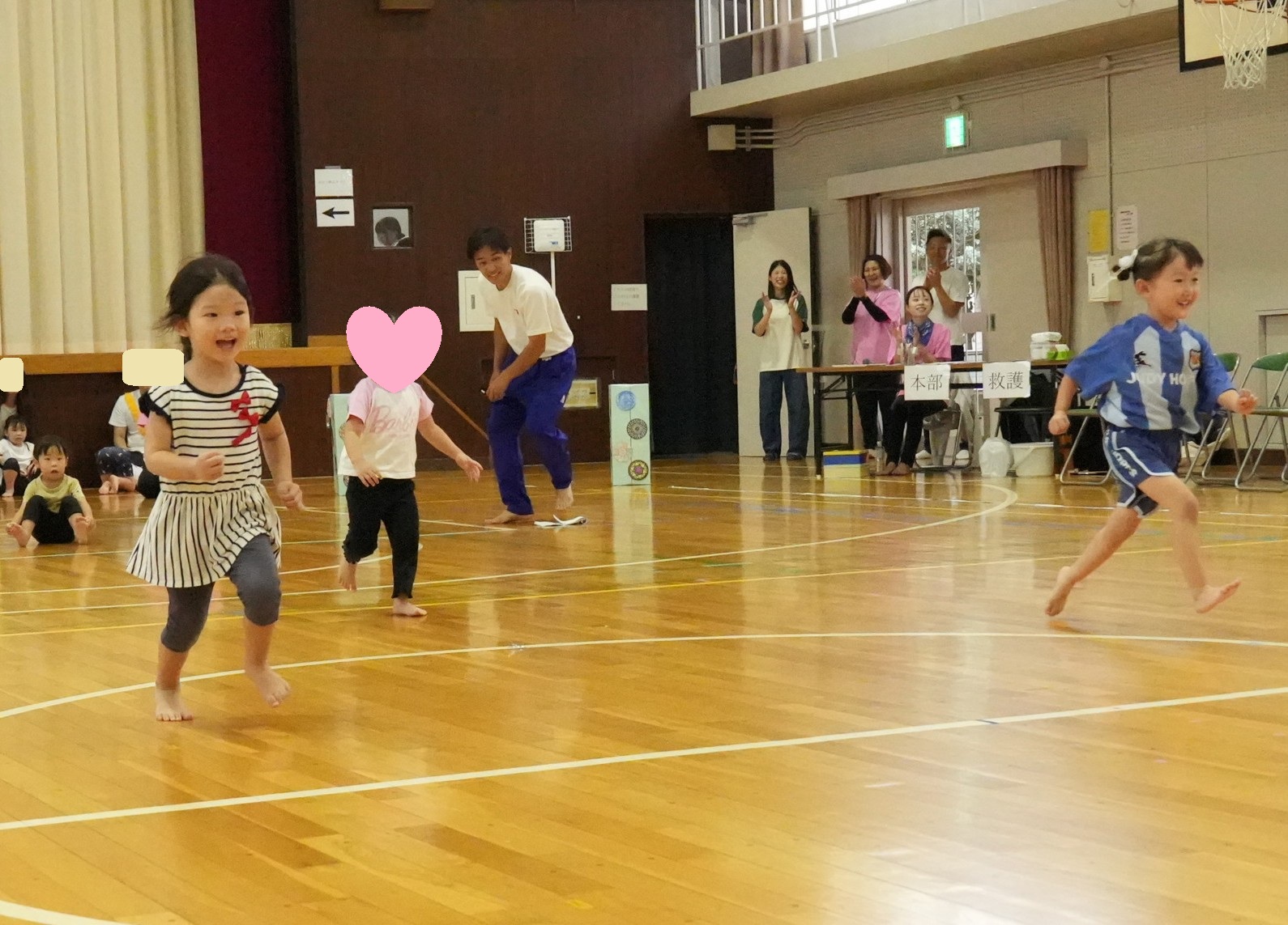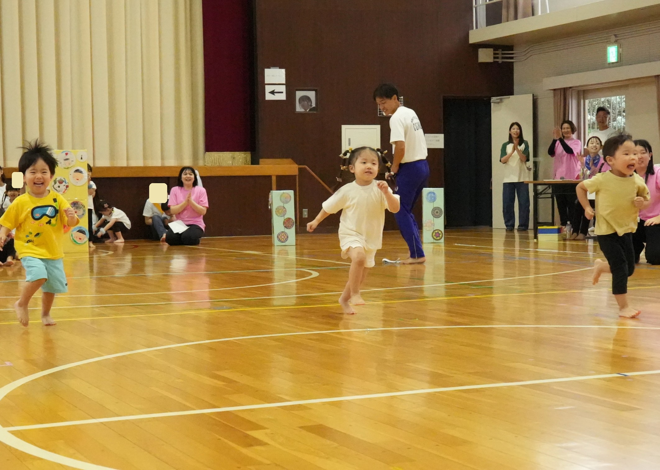 2歳は保護者の元へ、3歳はゴールテープに向かって走りました