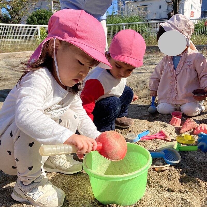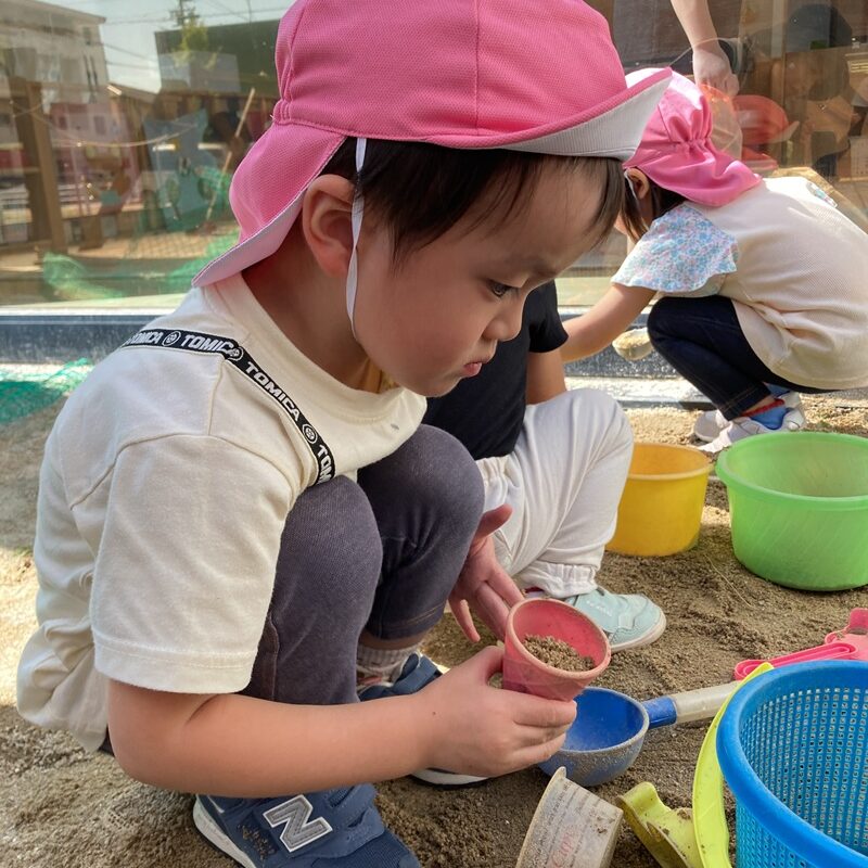 砂場遊びでは、スコップやカップを手に取り、砂をすくったり、容器に入れたり出したりすることを楽しむ子どもたち![]()