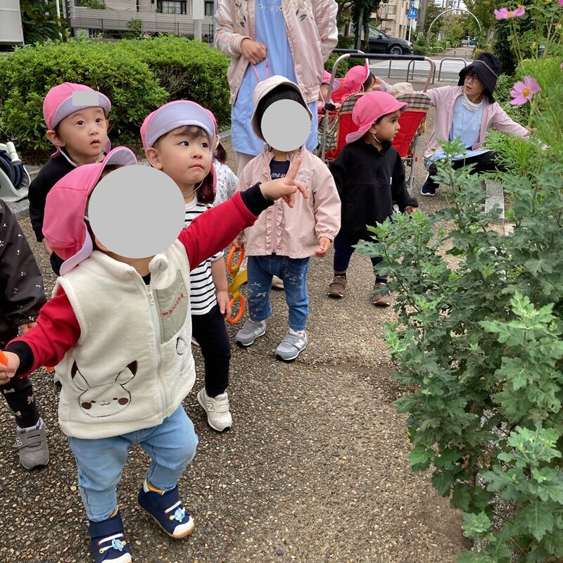 1歳児クラスも、風を感じたり落ち葉を踏んだりと、道中のいろいろな発見を楽しむ子どもたち![]()
