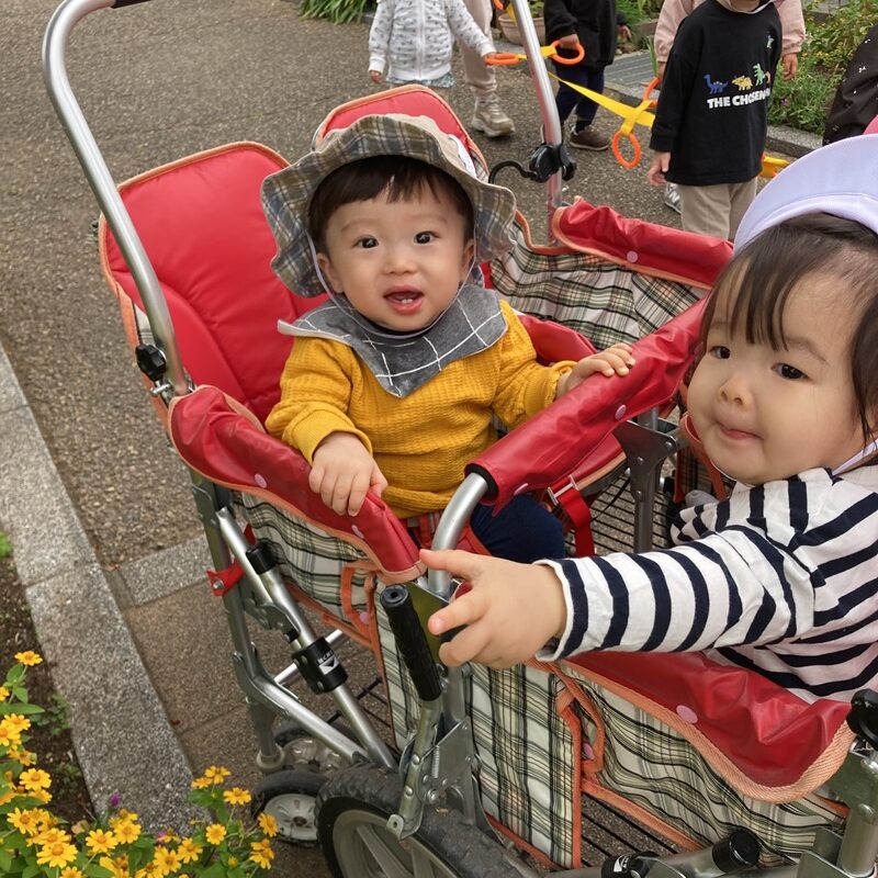 0歳児クラスは、散歩車に乗って、近くの公園までお散歩に![]()