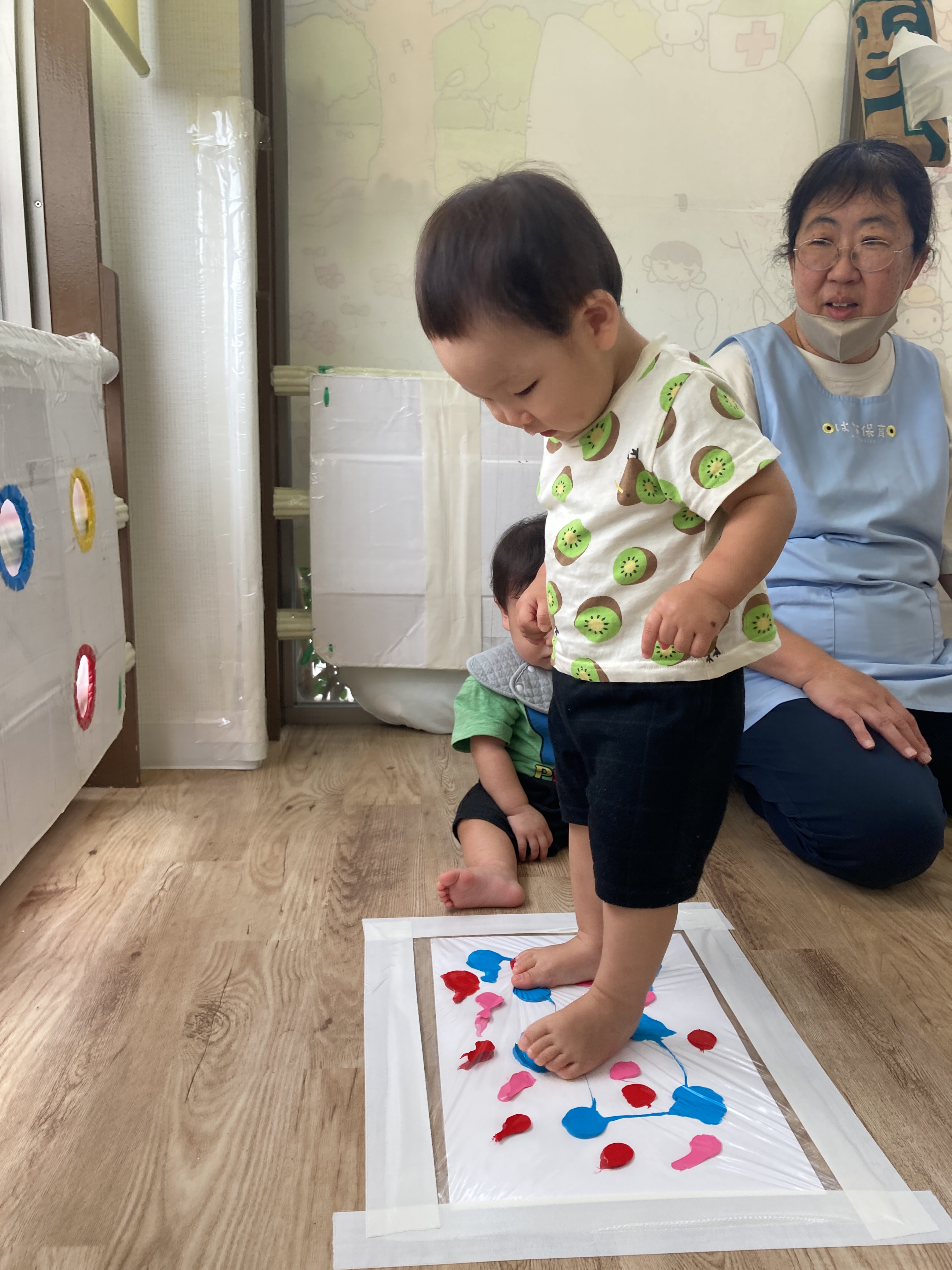 様々な色の絵の具を袋の上からペタペタ触って感触を楽しみながら制作を行いました♪