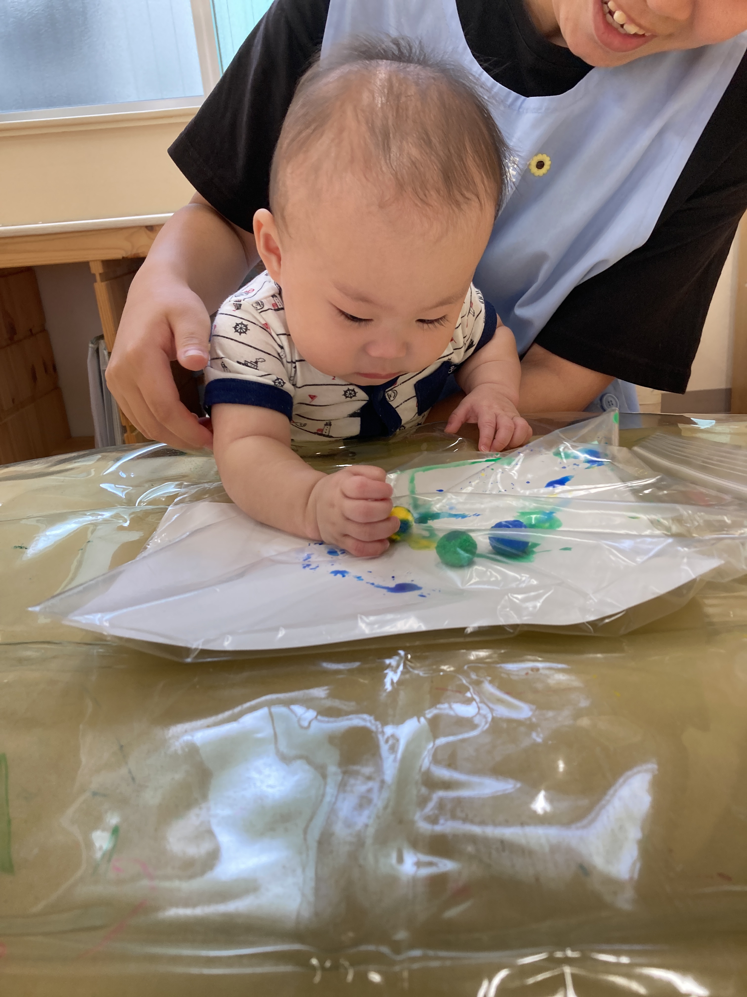 赤ちゃんは手では難しいため、ジップロックに入れて叩いてみたり振ってみたり初めてのことに興味津々です![]()