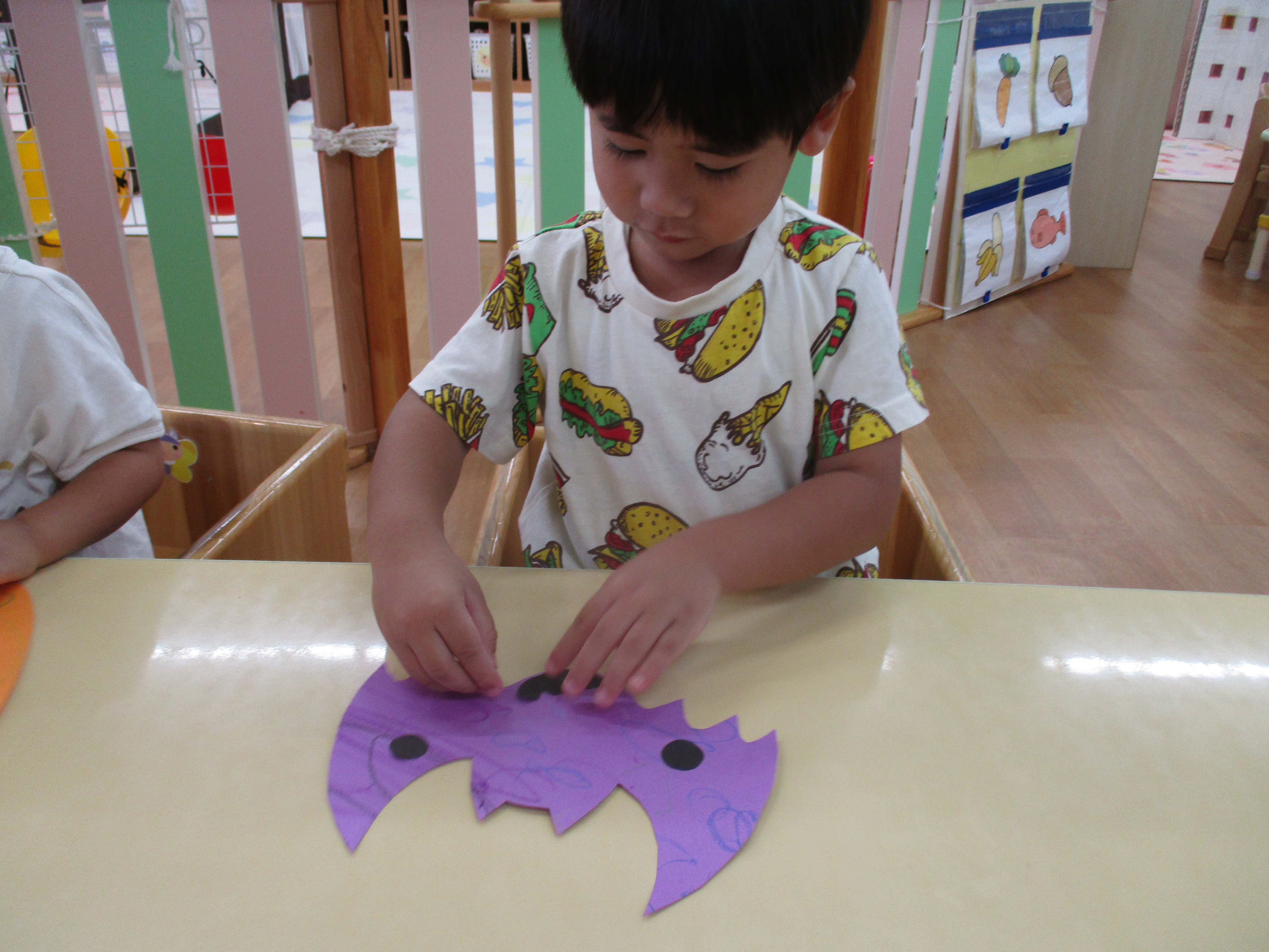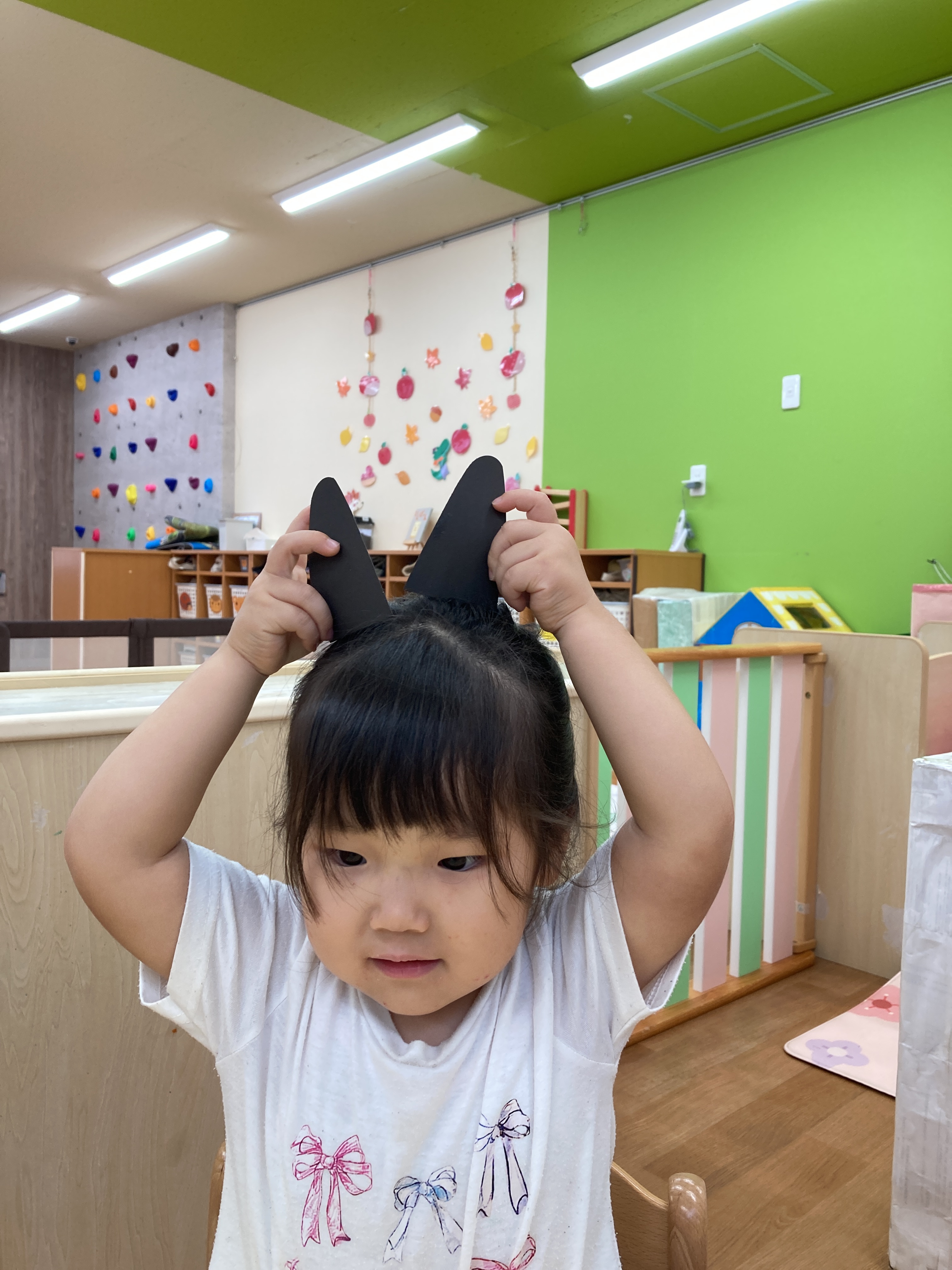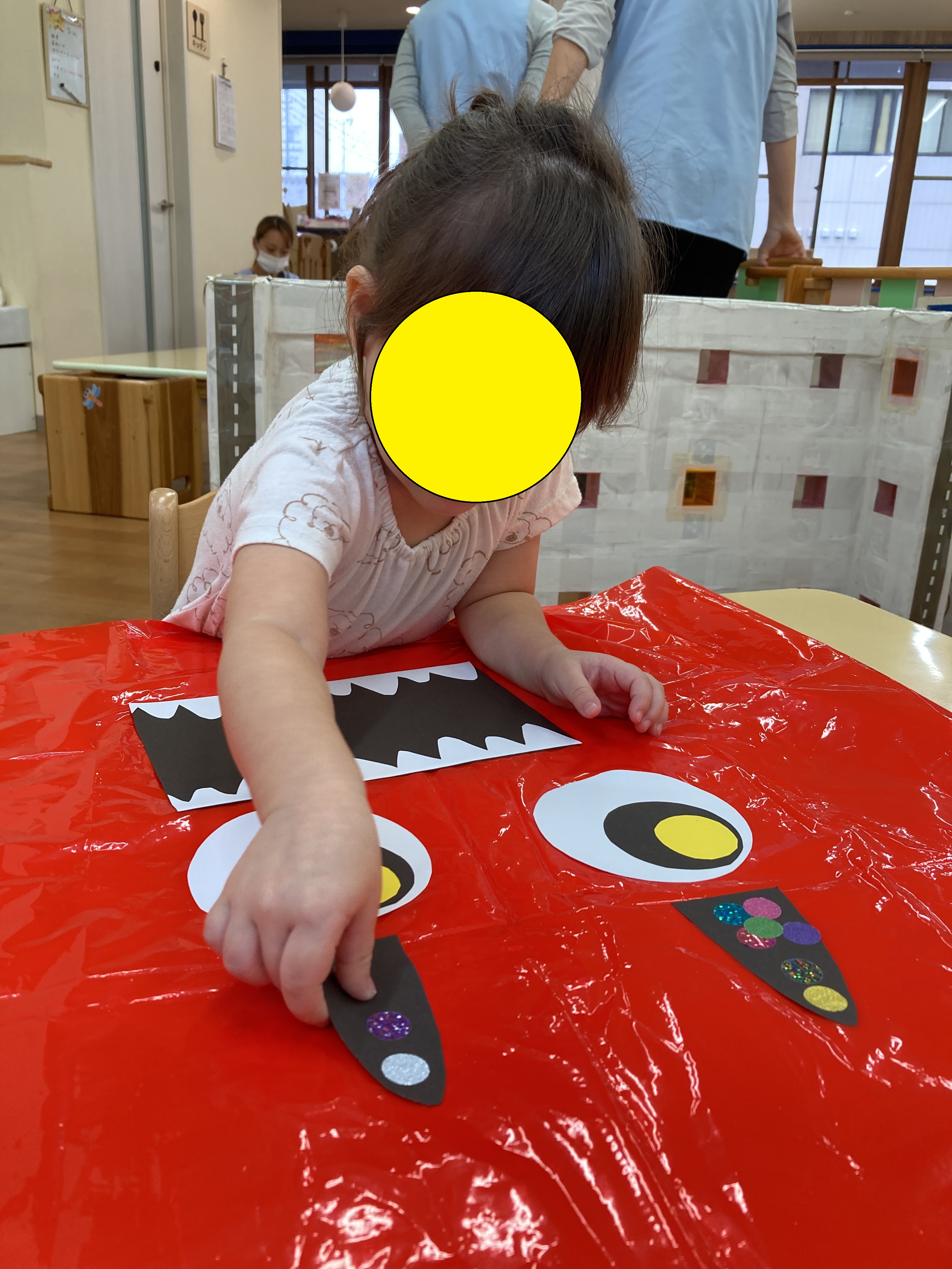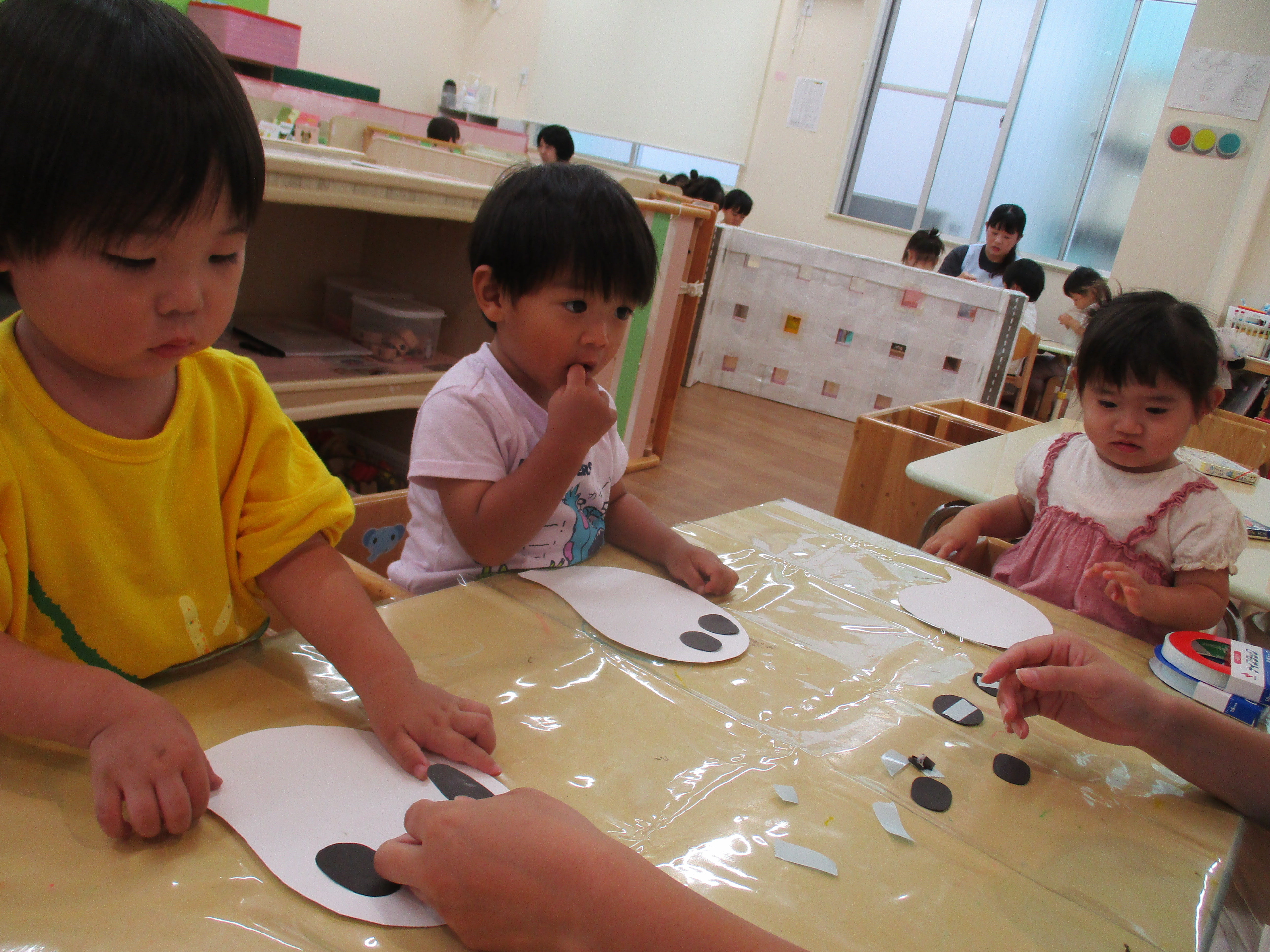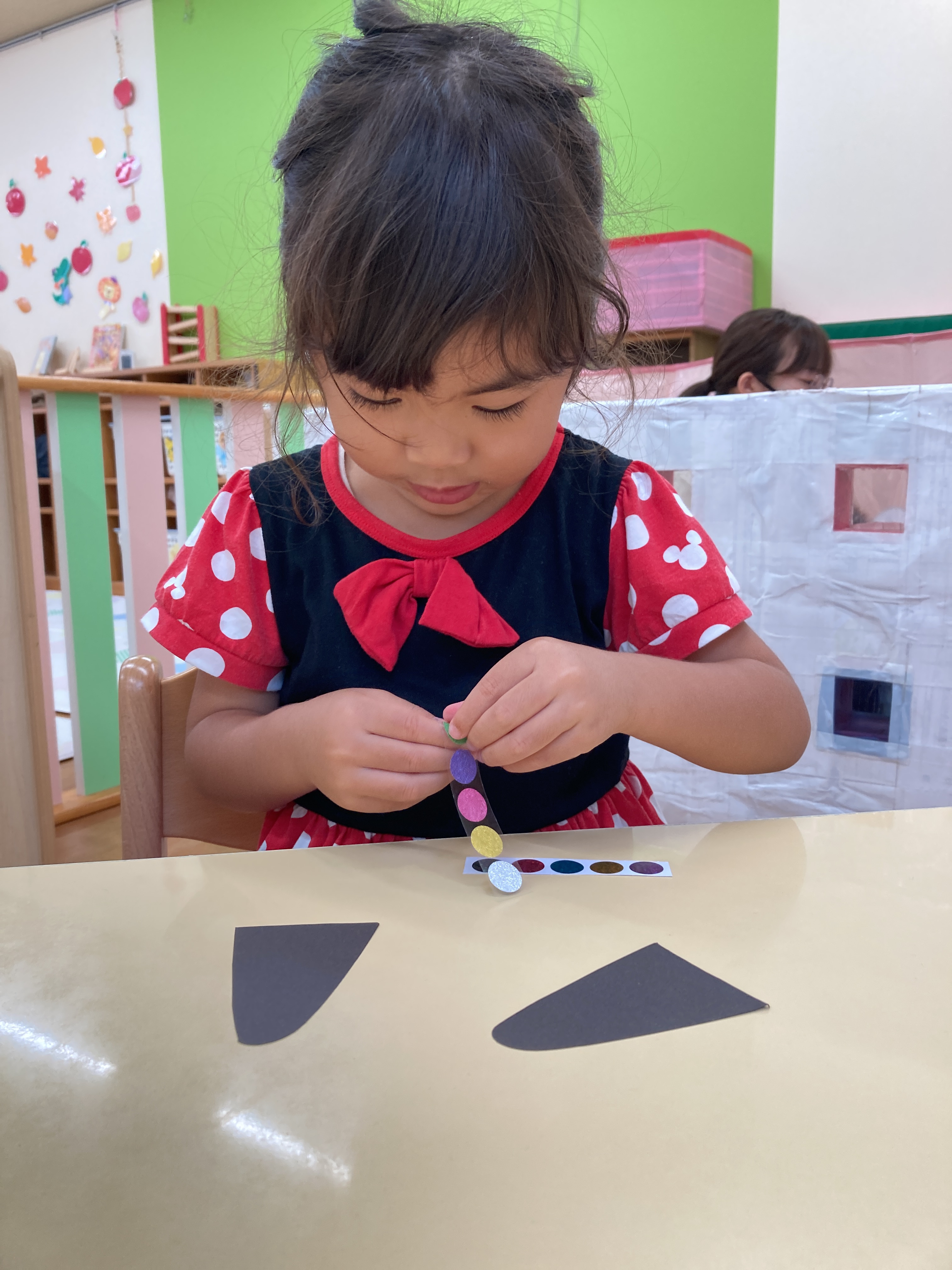 自分たちで好きな色のカラーポリを選び 目・口・耳をペタペタと貼ったよ