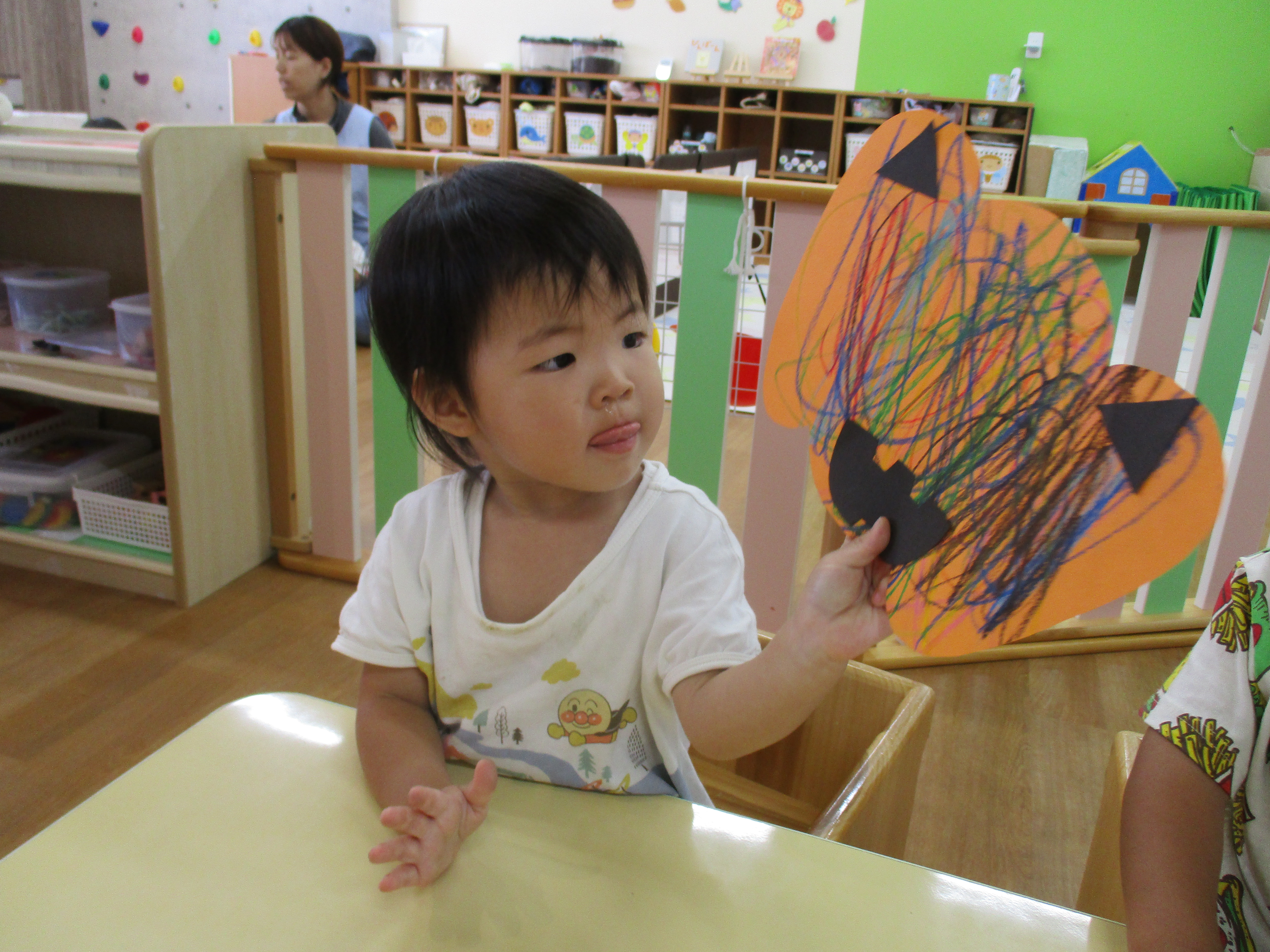 みてみてと上手に作ったカボチャを見せてくれてます![]()