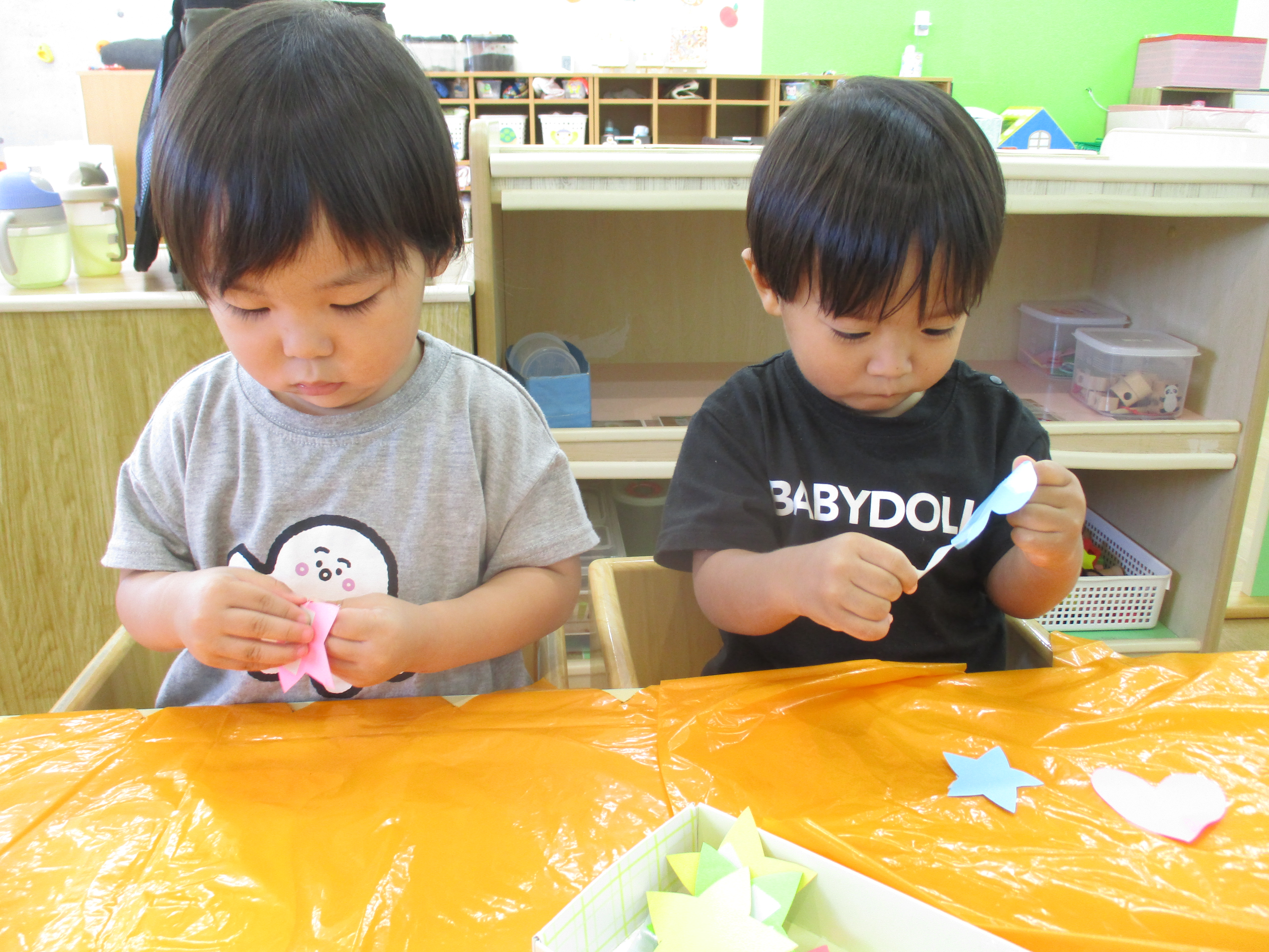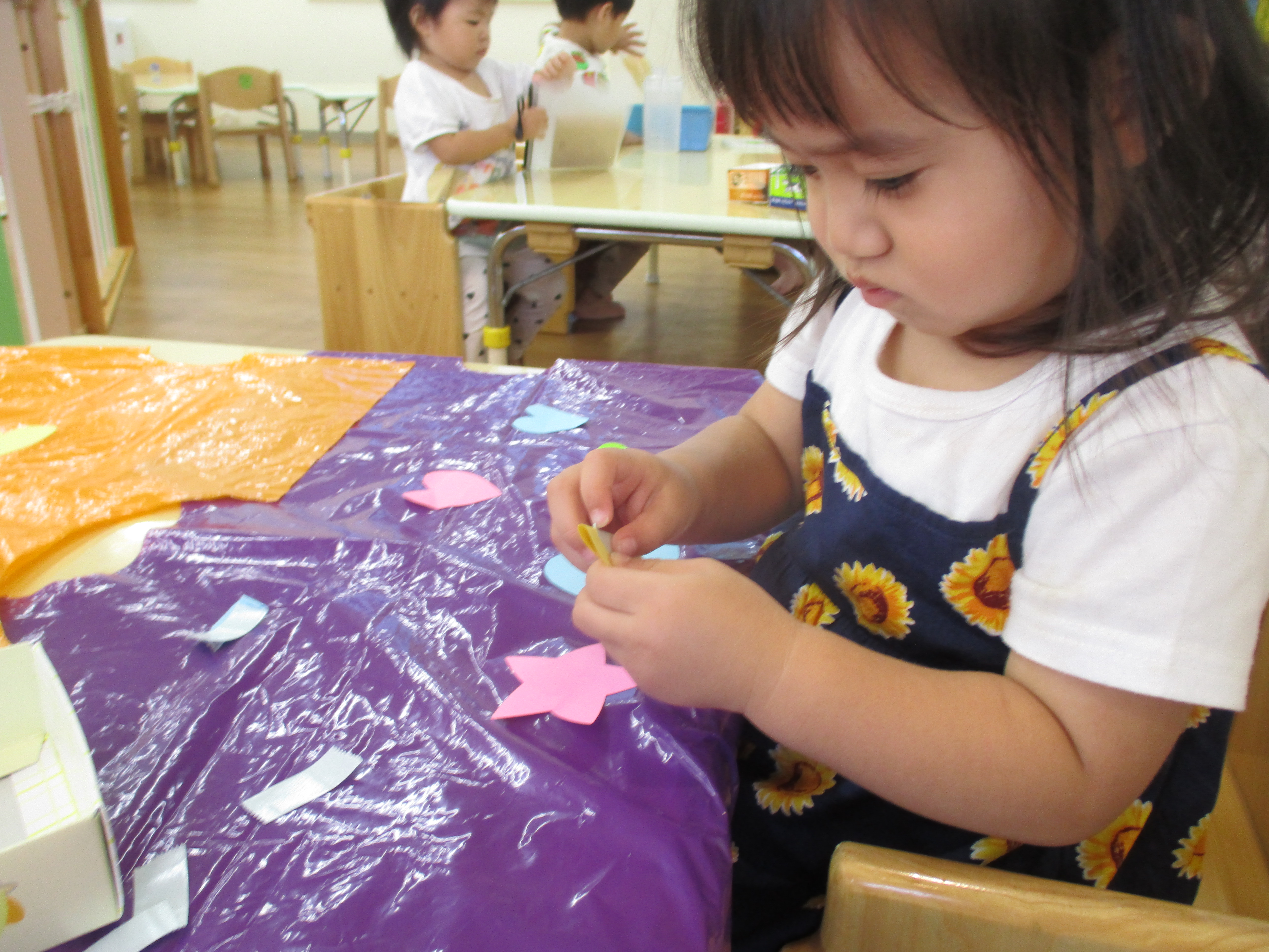 最後はお星さまとハートの形の画用紙を衣装にペタペタと貼って飾り付け❤