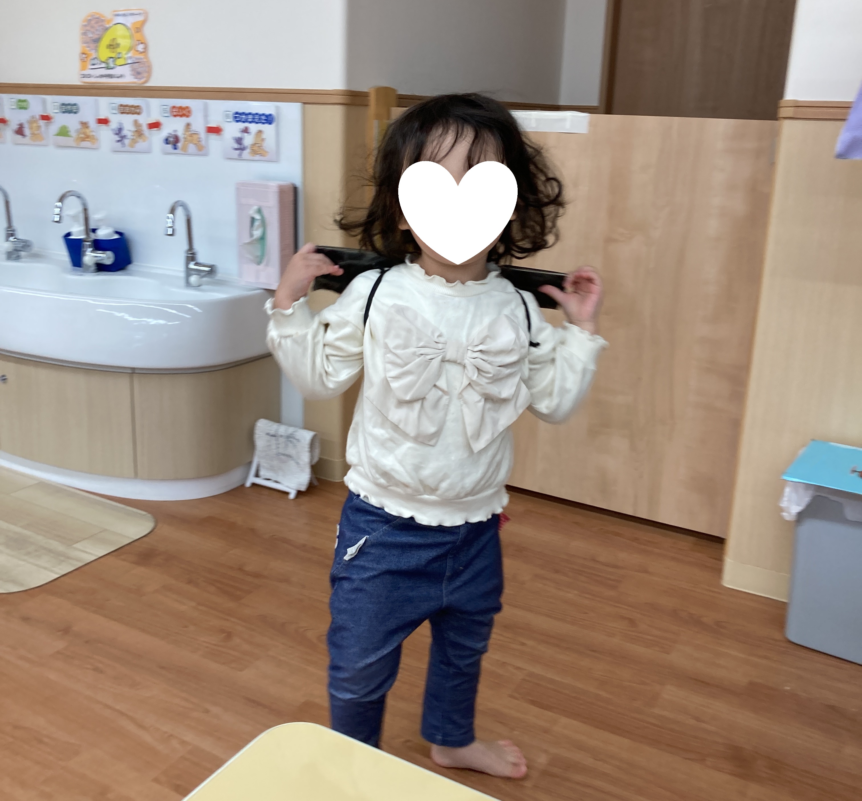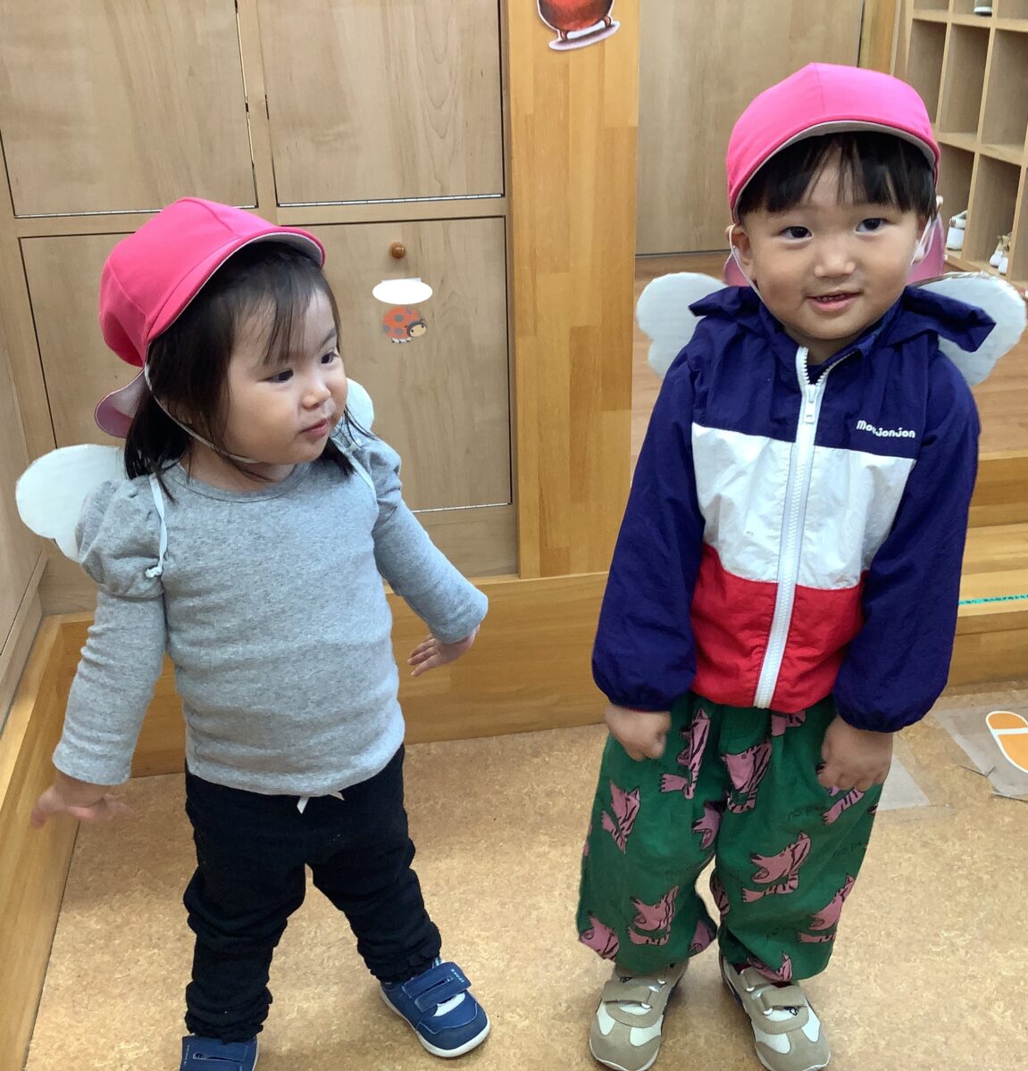 登園後、仮装用の羽を見つけてさっそく身につけるお友だち![]()