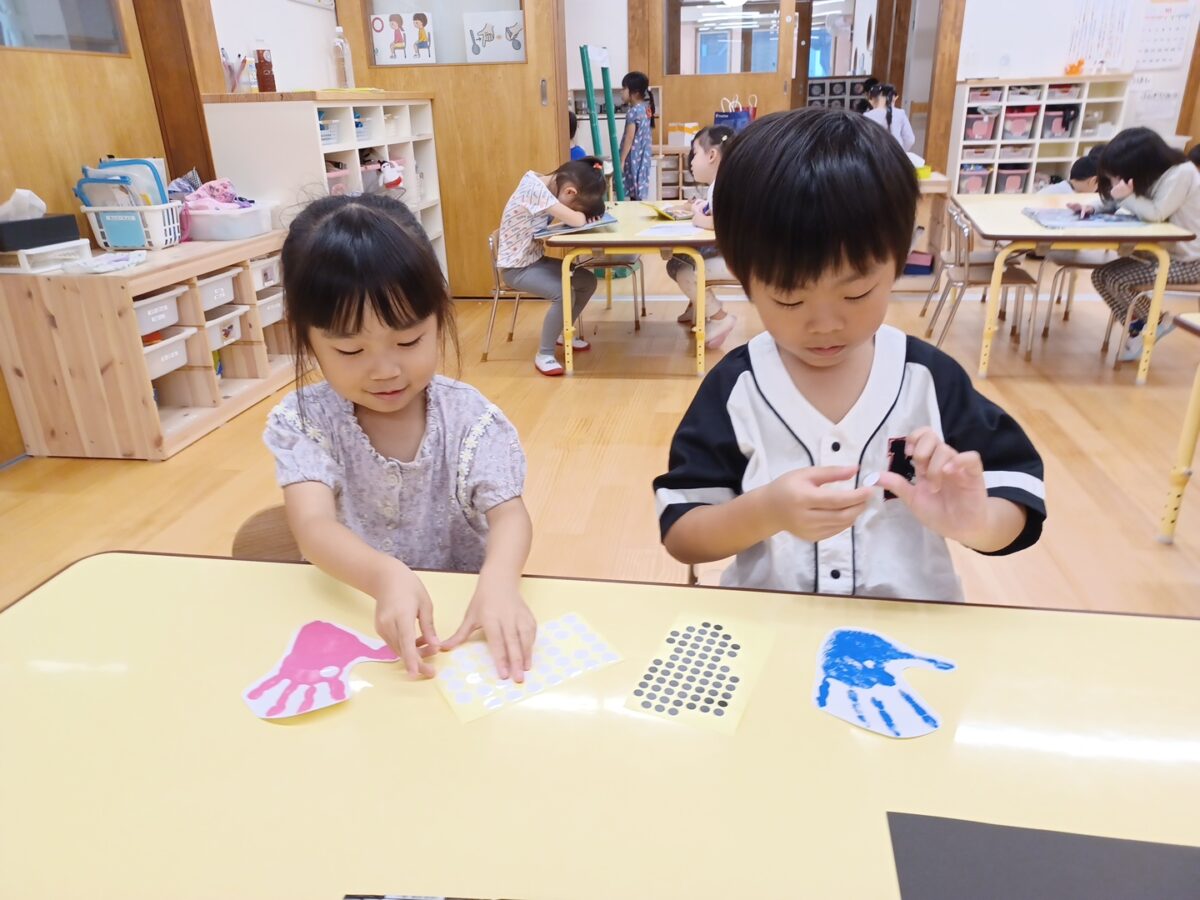 あじさい組では保育士が服の土台を作り、子どもたちには好きなように飾り付けをしてもらいました![]()