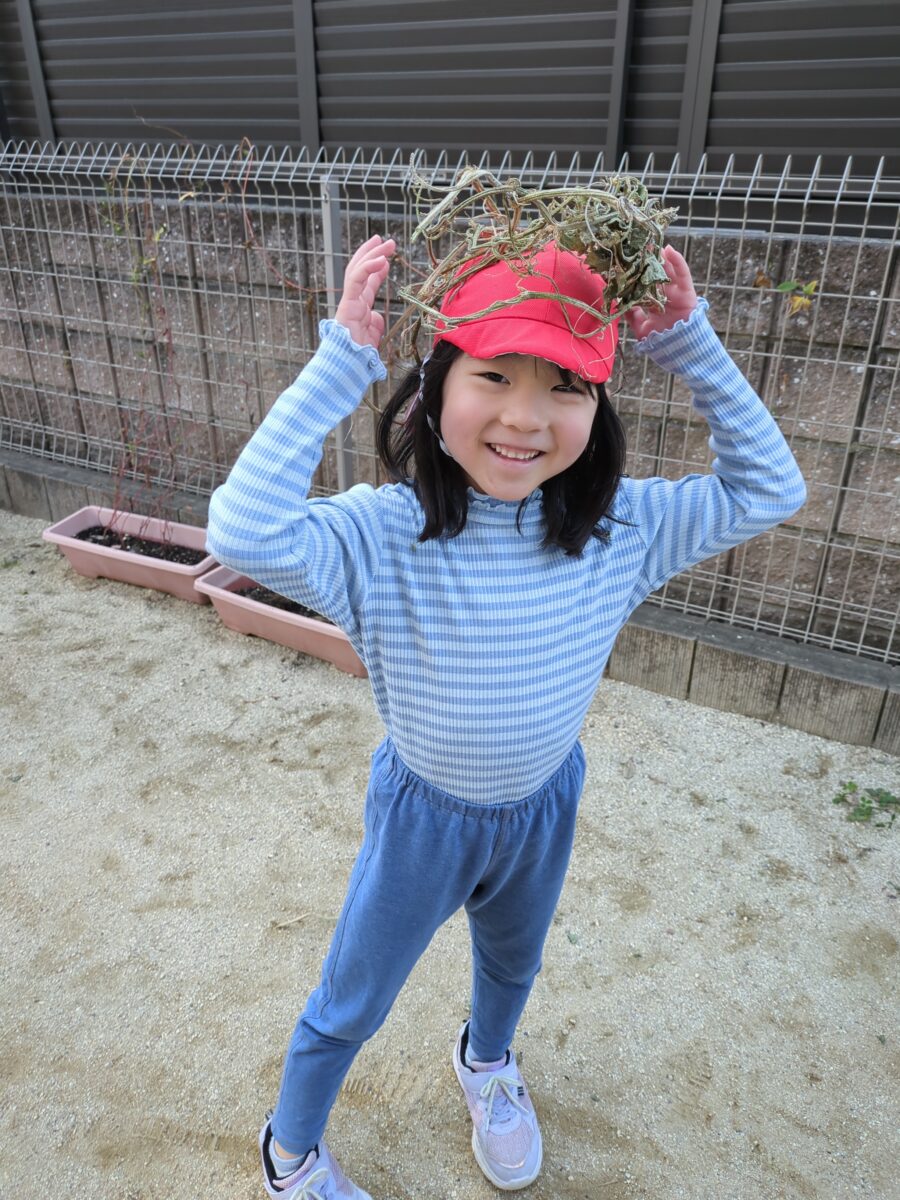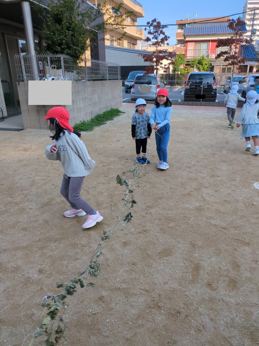 根と葉先を持って伸ばしてみると、「よーいどん!みたい!」と声があがり、自然とかけっこが始まりました。ゴールテープのようにしてくぐってみたり、「丸めて!」と保育士に頼んで冠にして遊ぶ姿も見られました。